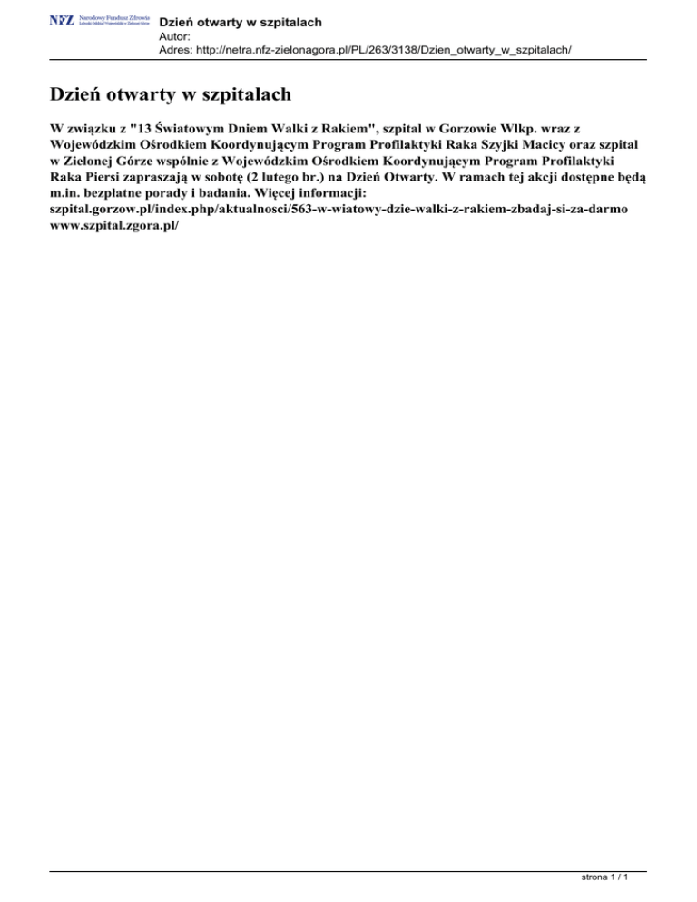 Dzień otwarty w szpitalach Autor: Adres: http://netra.nfz-zielonagora.pl/PL/263/3138/Dzien_otwarty_w_szpitalach/ Dzień otwarty w szpitalach W związku z "13 Światowym Dniem Walki z Rakiem", szpital w Gorzowie Wlkp. wraz z Wojewódzkim Ośrodkiem Koordynującym Program Profilaktyki Raka Szyjki Macicy oraz szpital w Zielonej Górze wspólnie z Wojewódzkim Ośrodkiem Koordynującym Program Profilaktyki Raka Piersi zapraszają w sobotę (2 lutego br.) na Dzień Otwarty. W ramach tej akcji dostępne będą m.in. bezpłatne porady i badania. Więcej informacji: szpital.gorzow.pl/index.php/aktualnosci/563-w-wiatowy-dzie-walki-z-rakiem-zbadaj-si-za-darmo www.szpital.zgora.pl/ strona 1 / 1 Powered by TCPDF (www.tcpdf.org)
