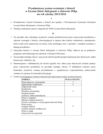 Przedmiotowy system oceniania z historii w Liceum Sióstr Salezjanek w Ostrowie Wlkp. na rok szkolny 2015/2016 I 1. Przedmiotowy System Oceniania z historii jest zgodny z Wewnętrznym Systemem Oceniania Liceum Sióstr Salezjanek w Ostrowie Wlkp. 2. Niniejszy dokument stanowi załącznik do WSO Liceum Sióstr Salezjanek. II 1. Na początki roku szkolnego uczniowie zostaną poinformowani przez nauczyciela przedmiotu o zakresie wymagań z historii, obowiązującym w danym roku (zakres wiadomości, umiejętności, które trzeba mieć opanowane na koniec roku szkolnego) oraz o sposobie i zasadach oceniania z danego przedmiotu. 2. Nauczanie historii w Liceum Sióstr Salezjanek w Ostrowie Wlkp. odbywa się na podstawie programu zatwierdzonego do realizacji w klasach I-III liceum 3. Na początku każdego okresu nauczyciel określi sposób przeprowadzanych prac klasowych, zadań domowych, referatów, itp. 4. Harmonogram z dokładnością do dwóch tygodni oraz zakres prac klasowych zostanie podany przez nauczyciela przedmiotu na początku każdego okresu. O dokładnym terminie pracy kontrolnej uczniowie zostaną powiadomieni z tygodniowym wyprzedzeniem, jednocześnie zostanie on wpisany do dziennika lekcyjnego. 5. Ustala się następującą ważność różnych form aktywności ucznia na lekcji historii: FORMA WAGA OCENY Praca klasowa- semestralna 7 Sprawdzian wiadomości 5 Odpowiedź ustna Kartkówka Projekty, prezentacje 3 Wypracowania Zestawy zadań maturalnych Praca w grupach Bieżące zadania domowe Ocena wynikająca z nie przygotowania do lekcji Karty pracy 2 Analizy SWOT Analizy tekstów źródłowych Praca z mapą Aktywność na zajęciach Osiągnięte sukcesy w konkursach i olimpiadach przedmiotowych wpływają na podwyższenie oceny z przedmiotu. 6. W ocenie śródrocznej średnia ważona ocen otrzymanych w ciągu roku całego okresu jest pomocną nauczycielowi w wystawianiu ocen i jest zgodna ze wskazaniami tabeli WSO: 97% - 100% = 6 96% - 90% = 5 89% - 75% = 4 74% - 55% = 3 54% - 40 % = 2 39% - 1% = 1 7. Oceny klasyfikacyjne końcoworoczne wystawione są w oparciu o obie oceny klasyfikacyjne z godnie z tabelą zamieszczoną w WSO: 1,60 - dopuszczający 2,60 - dostateczny 3,60 - dobry 4,60 - bardzo dobry 5,60 - celujący IV 1. Uczeń ma prawo do wglądu swoich prac pisemnych. 2. Nauczyciel jest zobowiązany ocenić i udostępnić uczniom sprawdziany i prace pisemne w ciągu dwóch tygodni. 3. Uczeń powinien być poinformowany przez nauczyciela o błędach popełnionych podczas pracy w ciągu roku szkolnego oraz powinien być zaznajomiony z poprawnymi odpowiedziami. 4. Nauczyciel jest zobowiązany do: analizy pisemnej prac ucznia przy: pracach klasowych, sprawdzianach, kartkówkach, wypracowaniach, kartach pracy, bieżących zadań domowych zestawach zadań maturalnych, analizy tekstów źródłowych, pracy z mapą, analizy SWOT analizy ustnej prac ucznia przy: odpowiedzi ustnej, projektach, prezentacji, pracy w grupach V 1. Prace klasowe są obowiązkowe. W każdym okresie przewiduje się przynajmniej dwie prace klasowe. Jeżeli z przyczyn losowych uczeń nie może napisać z całą klasą, powinien to uczynić w terminie dwóch tygodni od momentu powrotu do szkoły. 2. Jeżeli uczeń nie przystąpi do pracy klasowej w pierwszym terminie dodatkowym otrzymuje ocenę niedostateczną. 3. Bieżące kartkówki pisemne mogą obejmować trzy ostatnie lekcje - kartkówek się nie poprawia. 4. Uczeń ma prawo do dwóch nie przygotowań w okresie. Nie przygotowania zgłasza nauczycielowi na początku zajęć. VI 1. Uczeń jest zobowiązany do prowadzenia zeszytu przedmiotowego i do udostępnienia zeszytu nauczycielowi do wglądu. 2. Każdy uczeń ma prawo do dodatkowych ocen za wykonane prace nadobowiązkowe, które mogą wpłynąć na podwyższenie oceny śródroczne VII 1. Uczeń ma prawo odwoływać się od oceny śródrocznej i końcoworocznej do Dyrektora Szkoły w przypadku naruszenia zasad proceduralnych PSO zgodnego z WSO Liceum Sióstr Salezjanek. VIII Wymagania PSO Zakres rozszerzony Ocena celująca Uczeń posiada kompetencje określone na ocenę bardzo dobrą a ponadto: Wiedza i umiejętności ucznia charakteryzują się pełną znajomością przedmiotu. Pochodzą one z różnych źródeł poza podręcznikowych. Oparte są na wnikliwej analizie. Uczeń twórczy w odpowiedzi, nieszablonowy, aktywny, nie unika krytyki i oceny. Ma własne zdanie. Potrafi sam stawiać pytania i przedstawić problemy do dyskusji. Wysoka kultura słowa mówionego. Ocena bardzo dobra Uczeń posiada kompetencje określone na ocenę dopuszczającą, dostateczną i dobrą a ponadto: 1. w zakresie umiejętności: − wie, gdzie szukać informacji, − ustala następstwa w czasie faktów i wydarzeń historycznych, − samodzielnie pracuje z mapą, − selekcjonuje wydarzenia, − ujmuje w treści historyczne związki przyczynowo-skutkowe, − interpretuje dane przedstawione na wykresie lub diagramie, − potrafi zorganizować pracę w grupie, − samodzielnie wyciąga wnioski z porównania informacji dotyczących wydarzeń i postaci historycznych, − samodzielnie formułuje problemy i pytania. 2. w zakresie wiedzy: − ocenia znaczenie źródeł historycznych dla odtwarzania wydarzeń historycznych, − ocenia znaczenie rewolucji neolitycznej i osiadłego trybu życia dla dalszych dziejów ludzkości, − ukazuje znaczenie wynalazków tego okresu: narzędzi, rozniecania ognia, wytopu i obróbki metali, − wyjaśnia wpływ budowy systemów irygacyjnych na rozwój instytucji państwa na Bliskim Wschodzie, − wymienia i charakteryzuje nowo poznane systemy religijne; przedstawia ich podstawowe zasady i określa rolę religii w państwach Wschodu; jest świadom występowania w starożytności wszystkich rodzajów religii, − charakteryzuje monarchię despotyczną na przykładzie władzy Hammurabiego, − docenia znaczenie wynalazków w rozwoju cywilizacji oraz przedstawia ich współczesne dziedzictwo, − przeds