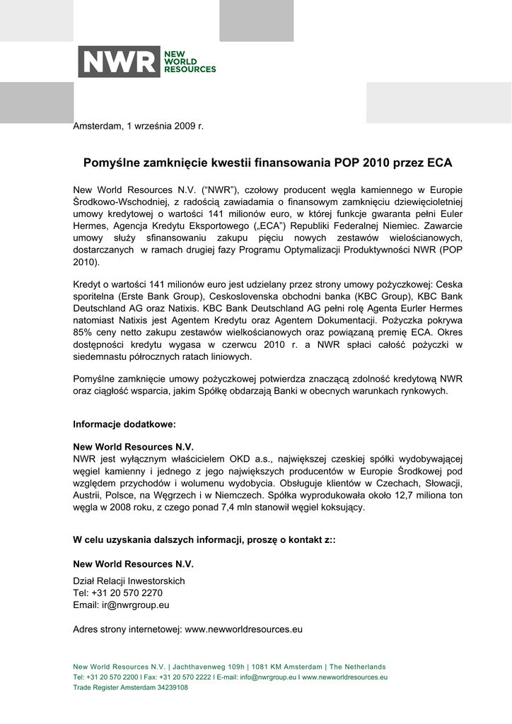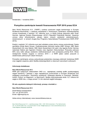 Amsterdam, 1 września 2009 r. Pomyślne zamknięcie kwestii finansowania POP 2010 przez ECA New World Resources N.V. (“NWR”), czołowy producent węgla kamiennego w Europie Środkowo-Wschodniej, z radością zawiadamia o finansowym zamknięciu dziewięcioletniej umowy kredytowej o wartości 141 milionów euro, w której funkcje gwaranta pełni Euler Hermes, Agencja Kredytu Eksportowego („ECA”) Republiki Federalnej Niemiec. Zawarcie umowy służy sfinansowaniu zakupu pięciu nowych zestawów wielościanowych, dostarczanych w ramach drugiej fazy Programu Optymalizacji Produktywności NWR (POP 2010). Kredyt o wartości 141 milionów euro jest udzielany przez strony umowy pożyczkowej: Ceska sporitelna (Erste Bank Group), Ceskoslovenska obchodni banka (KBC Group), KBC Bank Deutschland AG oraz Natixis. KBC Bank Deutschland AG pełni rolę Agenta Eurler Hermes natomiast Natixis jest Agentem Kredytu oraz Agentem Dokumentacji. Pożyczka pokrywa 85% ceny netto zakupu zestawów wielkościanowych oraz powiązaną premię ECA. Okres dostępności kredytu wygasa w czerwcu 2010 r. a NWR spłaci całość pożyczki w siedemnastu półrocznych ratach liniowych. Pomyślne zamknięcie umowy pożyczkowej potwierdza znaczącą zdolność kredytową NWR oraz ciągłość wsparcia, jakim Spółkę obdarzają Banki w obecnych warunkach rynkowych. Informacje dodatkowe: New World Resources N.V. NWR jest wyłącznym właścicielem OKD a.s., największej czeskiej spółki wydobywającej węgiel kamienny i jednego z jego największych producentów w Europie Środkowej pod względem przychodów i wolumenu wydobycia. Obsługuje klientów w Czechach, Słowacji, Austrii, Polsce, na Węgrzech i w Niemczech. Spółka wyprodukowała około 12,7 miliona ton węgla w 2008 roku, z czego ponad 7,4 mln stanowił węgiel koksujący. W celu uzyskania dalszych informacji, proszę o kontakt z:: New World Resources N.V. Dział Relacji Inwestorskich Tel: +31 20 570 2270 Email: [email protected] Adres strony internetowej: www.newworldresources.eu New World Resources N.V. | Jachthavenweg 109h | 1081 KM Amsterdam | The Netherlands Tel: +31 20 570 2200 I Fax: +31 20 570 2222 I E-mail: [email protected] I www.newworldresources.eu Trade Register Amsterdam 34239108