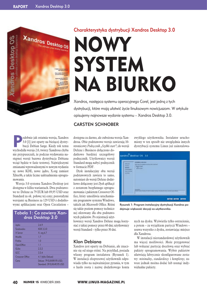 RAPORT Xandros Desktop 3.0 Charakterystyka dystrybucji Xandros Desktop 3.0 NOWY SYSTEM NA BIURKO Xandros, następca systemu operacyjnego Corel, jest jedną z tych dystrybucji, które mają ułatwić życie linuksowym nowicjuszom. W artykule opisujemy najnowsze wydanie systemu – Xandros Desktop 3.0. CARSTEN SCHNOBER P odobnie jak ostatnia wersja, Xandros 3.0 [1] jest oparty na bieżącej dystrybucji Debian Sarge. Kiedy rok temu wychodziła wersja 2.0, twórcy Xandrosa chyba nie przypuszczali, że podczas wydawania następnej wersji bazowa dystrybucja Debiana wciąż będzie w fazie testowej. Największymi zmianami wprowadzonymi w nowym wydaniu są: nowe KDE, nowe jądro, X.org zamiast Xfree86, a także liczne uaktualnienia oprogramowania. Wersja 3.0 systemu Xandros Desktop jest dostępna w kilku wariantach. Dwa podstawowe to: Deluxe za 79 EUR lub 89,95 USD oraz Standard za ok. połowę tej ceny; pozostałymi wersjami są Business za 129 USD z dodatkowymi aplikacjami oraz Open Circulation – Tabela 1: Co zawiera Xandros Desktop 3.0 Jądro 2.6.9 Środowisko KDE 3.3.0 X Server X. org 6.7 Mozilla 1.7 Firefox 1.0 OpenOffice 1.1 GLibc 2.3.2 GCC 3.3.4 Crossover Office 4.1 (tylko Deluxe) Cena Deluxe: 79 EUR/89,95 USD; Standard: 39 EUR/49,95 USD 40 NUMER 15 KWIECIEŃ 2005 zwykłego użytkownika. Instalator uruchodostępna za darmo, ale zubożona wersja Xanmiony w ten sposób nie uwzględnia innych drosa. Obie podstawowe wersje zawierają 10dystrybucji systemu Linux już zainstalowastronicowy Podręcznik „Szybki start”; do wersji Deluxe i Business dołączono dodatkowo bardziej szczegółowy podręcznik. Użytkownicy wersji Standard mogą nabyć podręcznik w formacie PDF. Dysk instalacyjny obu wersji podstawowych zawiera to samo, natomiast do wersji Deluxe dodatkowo dołączony jest Dysk aplikacji z zestawem bezpłatnego oprogramowania i pakietem Crossover Office, który umożliwia uruchamianie programów systemu Windows, takich jak Microsoft Office. Różni Rysunek 1: Program instalacyjny dystrybucji Xandros posię także poziom pomocy techniczdejmuje większość decyzji za użytkownika. nej oferowany dla obu podstawowych pakietów. Po rejestracji użytkownicy wersji Xandros Deluxe mogą korzynych na dysku. Wyświetla tylko ostrzeżenie, stać z takiej pomocy przez 60 dni; użytkownicy a potem – za wyjątkiem partycji Windows – wersji Standard – tylko przez 30 dni. usuwa wszystko z dysku, zostawiając miejsce dla Xandrosa. W instalacji niestandardowej użytkownik ma więcej możliwości. Może przygotować Klon Debiana lub wskazać partycję docelową oraz wybrać Xandros jest oparty na Debianie, ale znaczpakiety oprogramowania. Wybór pakietów nie się od niego różni. Na przykład, posiada ułatwiają fabrycznie skonfigurowane zestawłasny program instalatora (Rysunek 1). wy: minimalny, standardowy i kompletny; zaW instalacji ekspresowej użytkownik odpowsze jednak można dodać lub usunąć indywiada tylko na najważniejsze pytania, w tym widualne pakiety. o hasło roota i nazwę dodatkowego konta WWW.LINUX-MAGAZINE.PL Xandros Desktop 3.0 Rysunek 2: Ustawienia systemowe w Centrum sterowania KDE dystrybucji Xandros. Po restarcie, na koniec procesu instalacyjnego, system wyświetla graficzny ekran rozruchowy, gdzie użytkownik wybiera system do uruchomienia: Xandros, inny Linux lub Windows (jeśli te dwa ostatnie były wcześniej na dysku). Xandros jest jedną z nielicznych dystrybucji, w których zamiast programu ładującego Grub stosowany jest program Lilo. Ze względu na inną konstrukcję obu tych programów, tylko Lilo umożliwia zdefiniowanie dynamicznych plików urządzeń, np. /dev/hda1, podczas procesu rozruchu. Natomiast Grub do załadowania jądra wymaga wcześniejszego określenia pliku. Ponieważ w przypadku Xandrosa nie znajdzie takiego pliku, dystrybucji tej nie uruchomimy z poziomu Gruba. Może to sprawić kłopoty tym, którzy chcą dodać Xandrosa do już skonfigurowanego systemu z bootloaderem Grub. Środowisko KDE Domyślnym środowiskiem graficznym w Xandrosie jest KDE. Co prawda można wybrać inne – takie jak Gnome czy XFCE – ale nie zaleca się takiej zmiany. W większości przypadków narzędzia specyficzne dla Xandrosa nie są programami autonomicznymi, lecz wymagają środowiska KDE. Oprócz zwykłych ustawień KDE, w Centrum sterowania dystrybucji Xandros można skonfigurować połączenie internetowe i program rozruchowy (Rysunek 2); jest tam również narzędzie do zarządzania użytkownikami. Administrator może określić, czy usługi sieciowe (np. SSH lub Samba) mają być uruchamiane automatycznie podczas startu, czy ręcznie. Menedżer plików Xandros File Manager (XFM) zawiera przeglądarkę sieci z bezpośrednim dostępem do zasobów NFS i Windows (Rysunek 3). Dostęp zapewniono za- równo do katalogów, jak i drukarek. Ponadto jest tu wbudowany program do nagrywania płyt CD i DVD – wybrane pliki wystarczy przeciągnąć i upuścić na płytę. Menedżer plików działa dokładnie tak, jak analogiczny program w systemie Windows. Użytkownik nie widzi całego systemu plików. Przy tym domyślnym ograniczeniu ma dostęp tylko do własnego katalogu domowego oraz ewentualnych zasobów sieciowych. Może także korzystać z zasobów umieszczonych na podłączonych urządzeniach USB. Rysunek 3: Program Xandros File Manager ma wbudowaną przeglądarkę zasobów sieciowych i program do nagrywania płyt CD i DVD. Zarządzanie pakietami RAPORT obsługiwane zasoby Debiana). W zasobach tych znajdziemy dodatkowe pakiety zaadaptowane z Debiana na potrzeby dystrybucji Xandros, ale nieobjęte pomocą techniczną firmy. W repozytoriach Xandrosa nie ma wielu pakietów, które są w Debianie. Jeśli ich potrzebujemy, do konfiguracji programu możemy dodać opcjonalne zasoby samego Debiana. Firma Xandros odradza takie postępowanie – nie daje gwarancji, że pakiety, których nie dostosowano specjalnie pod kątem dystrybucji Xandros, będą z nią właśc