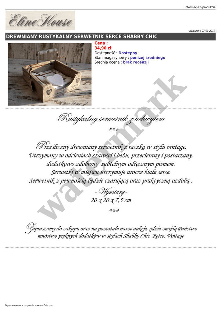 Informacje o produkcie Utworzono 07-03-2017 DREWNIANY RUSTYKALNY SERWETNIK SERCE SHABBY CHIC Cena : 34,90 zł w at er m ar k Dostępność : Dostępny Stan magazynowy : poniżej średniego Średnia ocena : brak recenzji Wygenerowano w programie www.oscGold.com