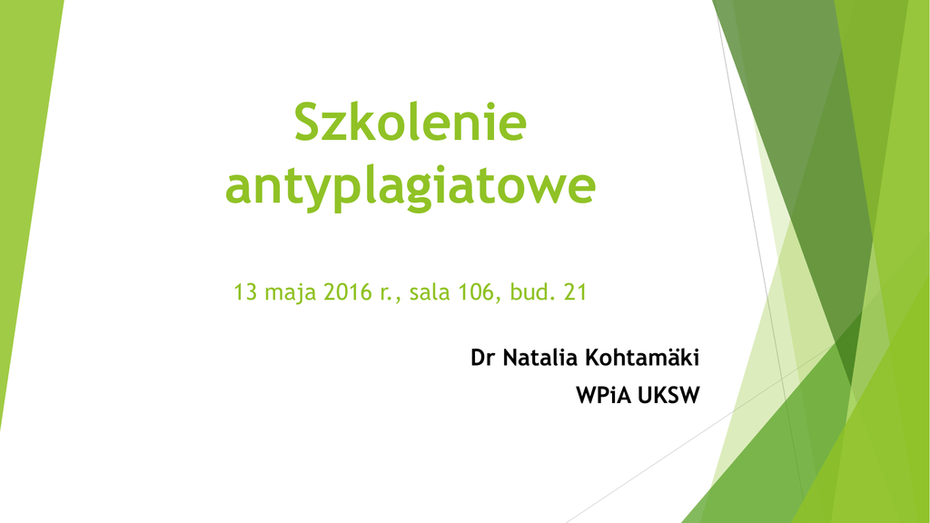 Szkolenie antyplagiatowe 13 maja 2016 r., sala 106, bud. 21 Dr Natalia Kohtamäki WPiA UKSW Co to jest plagiat? To przywłaszczenie sobie całości lub części obcego utworu. Chodzi o wykorzystanie w swojej pracy fragmentów tekstów, tabeli, wykresów, grafik etc. obcego autorstwa bez właściwego / pełnego podania ich źródła. Nie ma znaczenia skąd pochodzi zapożyczony fragment. Niepełne lub fałszywe dane dotyczące zapożyczanego fragmentu powodują, że także w takim przypadku praca będzie nosiła znamiona plagiatu. Co to jest plagiat? Przywłaszczeniem, czyli plagiatem jest każde zapożyczenie bez poprawnego podania źródła. Nie ma znaczenia, czy jest to cała praca, rozdział, akapit, czy jedno zdanie. Dla uczciwego przygotowania pracy podstawowe znaczenie ma zatem właściwe formułowanie przypisów. Co to jest plagiat? Plagiatem nie są: Stwierdzenia oczywiste: Warszawa jest stolicą Polski Utarte zwroty, zbitki wyrazowe, nazwy własne, formułowania z języka fachowego (prawniczego, medycznego, ekonomicznego etc.): kodeks postępowania cywilnego, własność hipoteczna, UKSW Przykłady: Plagiat jawny: Inaczej nazywany totalnym Oznacza pełne zapożyczenie – „przeklejenie” obcego tekstu do swojego Prezentacja obcego tekstu pod swoim nazwiskiem Może to być zapożyczenie całego tekstu bądź fragmentu – BEZ PODANIA ŹRÓDŁA w przypisie Przykłady: plagiat jawny Przykłady: Plagiat ukryty polega na wykorzystaniu obcego utworu w zmienionej formie, np. poprzez użycie synonimów, zmianę szyku zdania, kolejności przedstawianych myśli tekst plagiatującego nie zwiera treści oryginalnych, tylko polega na kopiowaniu cudzych tez Przykłady: plagiat ukryty („kradzież idei”) Przykłady UWAGA! Rodzajem plagiatu ukrytego jest również podanie fałszywych bądź niepełnych danych źródłowych w przypisie! Przykładem takiego zafałszowania może być: zaczerpnięcie myśli z prac kilku autorów, a podanie w przypisie tylko jednego; podanie jednego miejsca w wykorzystanym tekście a zaczerpnięcie tez z wielu fragmentów takiej pracy. Przykłady: plagiat ukryty Inne formy plagiatu: Plagiat polega tłumaczeniowy na przetłumaczeniu tekstu z języka obcego na język polski i uznanie takiego tłumaczenia za tekst własny – BEZ PEŁNEGO PODANIA ŹRÓDŁA! Plagiat tłumaczeniowy Może występować w obu wymienionych formach: Jako plagiat jawny – wtedy tłumaczenie na zasadzie 1 do 1 odpowiada tekstowi w języku obcym (tłumaczenie dosłowne) Jako plagiat ukryty – kiedy tłumaczenie jest parafrazą / interpretacją tekstu w języku obcym W obu przypadkach plagiatujący w przypisie nie podaje właściwego źródła Sposoby na uniknięcie plagiatu: 1) Cytat Poprawne cytowanie Obcy tekst – jeśli jest przywoływany dosłownie musi zostać umieszczony w cudzysłów „……………….” Na końcu cudzysłowy należy umieścić przypis. Cytat: Przy pominięciu fragmentu cytowanego tekstu należy zastosować: (…) lub […] . Dosłownych cytatów nie należy zmieniać – każdą zmianę (np. dopasowanie gramatyczne do własnego tekstu, pogrubienie istotnych fragmentów itd.) należy zaznaczyć w nawiasach. Np. (wyróżnienie autora), (sic!). Cytaty powinny być stosowane w pracy dyplomowej lub seminaryjnej z umiarem. Ma ona zawierać przede wszystkim własne przemyślenia. Najlepiej cytować za źródłem oryginalnym. Jeśli nie mamy do niego dostępu , możemy przywołać cytat za innym autorem (źródło pośrednie). Sposoby na uniknięcie plagiatu: 2) Parafraza: Własnymi słowami autor wyraża tezy, koncepcje, pomysły zaczerpnięte z tekstu obcego Parafraza: Sposoby na uniknięcie plagiatu: Podsumowanie: Podsumowanie odnosi się do większego fragmentu przeczytanego tekstu. Podsumować można w pracy dyplomowej lub seminaryjnej, np. występujące w literaturze klasyfikacje, zebrać różne ujęcia definicyjne itd. Na końcu takiego zbiorczego ujęcia cudzych myśli należy umieścić przypis z pełnym podaniem informacji na temat źródła Przypisy: Nie ma jednej uniwersalnej szkoły tworzenia przypisów Style różnią się w zależności od dyscypliny naukowej, przyjętych schematów, reguł narodowych etc. Jak zatem tworzyć przypisy w pracy dyplomowej? Zgodnie z zaleceniami Promotora Czerpiąc z wzorów z literatury przedmiotu Można skorzystać ze wskazówek dla autorów w renomowanych periodykach takich, jak np. „Studia Europejskie” Przykłady tworzenia przypisów – wg. wskazówek ze „Studiów Europejskich” Przykłady tworzenia przypisów – wg. wskazówek ze „Studiów Europejskich” Otwarty System Antyplagiatowy System nie stwierdza wprost, czy praca jest plagiatem Oceny dokonuje każdorazowo Promotor po analizie raportu wygenerowanego przez system Promotor może sprawdzać pracę wielokrotnie w trakcie jej przygotowania przez Studenta Ostateczna wersja pracy – po jej wgraniu do systemu APD – jest obowiązkowo sprawdzana (zgodnie z zapisem ustawowym) przed dopuszczeniem pracy do obrony Przykłady zaczerpnięto: z opracowań dr Natalii Kohtamäki dostępnych na stronach UKSW: https://usosweb.uksw.edu.pl/instrukcje/Praktyczny_przewodnik_antyplagiato wy_NKohtamaki.pdf (13.05.2016) http://wpia.uksw.edu.pl/sites/default/files/teoria-stosunkowmiedzynarodowych/OSA%20Wprowadzenie%20%20oprac.%20dr%20N.%20Kohta maki%20%281%29.pdf (13.05.2016) wskazówek dla autorów w periodyku „Studia Europejskie: http://www.ce.uw.edu.pl/pliki/tresc/program_wydawniczy/o_nas/NOWYWzo rformatowaniastronydlapotrzebProgramuWydawniczegoCEUW.pdf (13.05.2016)
