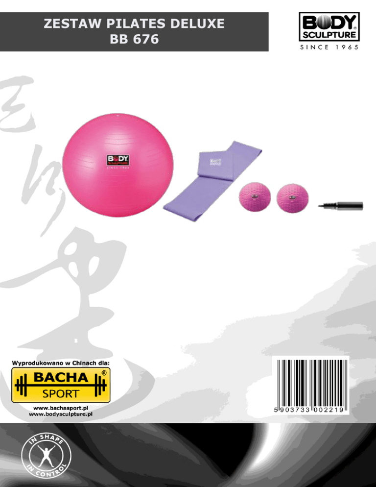 ZESTAW PILATES DELUXE BB 676 WSKAZÓWKI DLA NAJLEPSZYCH REZULTATÓW Proszę zachować niniejsza instrukcję, Informacje w niej zawarte mogą okazać się przydatne w przyszłości. 1. Zestaw Pilates Deluxe BB 676 został zaprojektowany tak, aby ukształtować specyficzne partie mięśni i poprawić ich elastyczność. 2. Ważne jest, aby osiągnąć prawidłową pozycję startową i zachować równowagę, podczas wykonywania ćwiczeń opisanych w tej broszurze. 3. Zachowaj równomierny oddech podczas wykonywania wszystkich ćwiczeń. Nie wstrzymuj oddechu. 4. Wszystkie opisane ćwiczenia powinny być wykonywane spokojnie, z zachowanie pełnej kontroli ruchu. UWAGI DOTYCZĄCE UŻYTKOWANIA Bezpieczeństwo: 1. Przed rozpoczęciem nowego programu ćwiczeń skonsultuj się ze swoim lekarzem, aby określić czy występują jakiekolwiek przeciwwskazania dla Twojego zdrowia lub bezpieczeństwa. 2. Nadmierne lub nieprawidłowo wykonywane ćwiczenia mogą zaszkodzić Twojemu zdrowiu. Jeżeli podczas treningu będzie odczuwalny ból, wystąpią zawrotu głowy, problemy z oddychaniem, uczycie nudności, mdlenie lub podobne objawy – natychmiast zaprzestań ćwiczeń i udaj się do lekarza! 3. Zawsze noś wygodne ubranie oraz sportowe obuwie podczas ćwiczeń. 4. Trzymaj dzieci i zwierzęta domowe z dala od sprzętu. Zestaw Pilates Deluxe BB 676 jest przeznaczona wyłącznie do użytku przez osoby dorosłe. 5. Jeżeli występują inne problemy lub oczekujesz pomocy skontaktuj się z naszym Biurem Obsługi Klienta pod numerem telefonu +48 32 270 12 09. 6. Maksymalne obciążenie piłki gimnastycznej to 100 kg. Pompowanie: 1. Aby napompować piłkę potrzebna jest pompka przeznaczona do pompowania materacy, pontonów, baseników dla dzieci, itp. Pompka rowerowa będzie odpowiednia po zastosowaniu specjalnej plastikowej końcówki. Nie próbuj pompować piłki za pomocą ust. 2. WAŻNE: Pompowanie powinna przeprowadzić osoba dorosła. Dzieci nie powinny być dopuszczone do pompowania piłki, ponieważ załączona z tym produktem końcówka może zostać połknięta przez dziecko. 3. Jeżeli Twoja pompka nie posiada odpowiedniej końcówki, możesz wykorzystać jedną z załączonych w komplecie z piłką. Jeżeli piłka jest wystarczająco mocno napompowana należy usunąć końcówkę i zatkać otwór powietrzny białą zatyczką. 4. Bądź ostrożny i przechowuj końcówkę w bezpiecznym miejscu do następnego użycia, z dala od dzieci. 5. Ze względów bezpieczeństwa po zakończeniu pompowania piłki upewnij się, czy jest wystarczająco twarda. Najprostszym testem jest usiąść na niej. Jeżeli utrzymuje Twoją wagę to oznacza, że jest prawidłowo napompowana. 6. Sprzęt przeznaczony jest do użytku domowego. ZESTAW ZAWIERA 1. Taśmę Pilates o wymiarach 120 x 15 cm 2. 2 piłki wagowe do Pilates o wadze 2 x 1 kg 3. Piłkę gimnastyczną o średnicy 65 cm 4. Pompkę WPROWADZENIE DO PILATES „Muszę mieć rację. Nigdy nie zażyłem aspiryny. W życiu nie odniosłem obrażeń. Cały kraj, cały świat, powinien wykonywać moje ćwiczenia. Byliby szczęśliwsi.” Joseph Hubertus Pilates, in 1965, age 86 Może nie cały świat, ale na pewno wiele osób na całym świecie. Występuje prawdziwy bum na Pilates, metodę ćwiczeń i fizycznego ruchu skupioną na rozciąganiu, wzmacnianiu i utrzymywaniu równowagi ciała. A to wszystko dzięki systematyce wykonywania specyficznych ćwiczeń w połączeniu z odpowiednio modulowanym oddechem. Pilates okazał się nieoceniony nie tylko jako wsparcie dla fitness, ale również jako ważne uzupełnienie treningu w zawodowym sporcie i w rehabilitacji fizycznej wszelkiego rodzaju. Wiernie praktykowany, przynosi wiele korzyści. Zwiększa się pojemność płuc i poprawia krążenie poprzez skupienie uwagi na głębokim, zdrowym oddychaniu. Siła i elastyczność mięśni i koordynacja psychofizyczna są kluczowymi elementami programu pilates. Poprawa wydolności serca, gęstości kości i stawów, poprawa zdrowia i wiele innych pozytywnych efektów dla organizmu, o czym przekonasz się już po pierwszym razie. Pilates uczy równowagi i kontroli nad ciałem, a jego oddziaływanie obejmuje swym zasięgiem również inne obszary życia. Wyposażenie Pilates obecnie niewiele różni się od tego w przeszłości. Sprężyny i taśmy do rozciągania, paski do przytrzymywania nóg i rąk, podpory dla pleców, szyi i barków są tak samo ważne dziś jak to było wówczas. Niezwykły charakter wyposażenia stanowi wyzwanie i wsparcie dla organizmu a niepowtarzalnie zaprojektowane elementy naprawdę działają jako uzupełnienie trudnych ćwiczeń „matwork”. ROZGRZEWKA Przed rozpoczęciem programu ćwiczeń zasięgnij porady lekarskiej. Zawsze rozpoczynaj sesję treningową od przeprowadzenia rozgrzewki. Umożliwia to zachowanie odpowiedniej pracy serca i swobodny oddech wraz ze wzrostem wysiłku. Przyczynia się również do rozluźnienia mięśni. Spacer lub marsz w miejscu przez kilka minut jest dobrym sposobem na rozgrzewkę. Możesz zwiększać stopniowo tempo, pamiętaj jednak, że to tylko rozgrzewka. Zalecane jest również ostrożne kołysanie ramionami lub kroczenie lekko na boki. Maksymalnie przez około 5 minut przed przejściem do ćwiczeń rozciągających. ROZCIĄGANIE Po zakończeniu rozgrzewki jesteś gotowy, aby przejść do sesji rozciągania. Korzyścią rozciągania jest zwiększenie elastyczności i zmniejszenie ryzyka uszkodzenia mięśni i ścięgien. Nigdy nie podskakuj lub nie przeciążaj kończyn w pozycji rozciągniętej. Delikatnie rozluźnij się po przybraniu pozycji ćwiczenia i przytrzymaj ją. Rozciągnięcie powinno być przetrzymane przez 6 - 10 sekund, szczególnie rozciągnięcia na zwiększenie elastyczności powinny być przetrzymywane przez 30 sekund. Wykonuj tylko rozciągania, które są anatomicznie możliwe. Jeśli pojawi się ból oznacza to, że robimy coś złego! IDEA ROZCIĄGANIA 1. Zwolnienie: Leż płasko na pl
