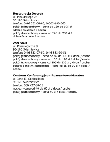 Restauracja Dworek ul. Piłsudskiego 24 96-100 Skierniewice telefon: 0-46 832-58-83, 0-605-100-560. pokój jednoosobowy - cena od 180 do 195 zł /doba+śniadanie / osoba pokój dwuosobowy - cena od 240 do 260 zł / doba+śniadanie / osoba ZSN Start ul. Pomologiczna 8 96-100 Skierniewice telefon: 0-46 833-27-50, 0-46 833-39-51. pokój jednoosobowy - cena od 82 do 100 zł / doba / osoba pokój dwuosobowy - cena od 100 do 120 zł / doba / osoba pokój trzyosobowy - cena od 105 do 135 zł / doba / osoba pokoje o niskim standardzie - cena od 25 do 30 zł / doba / osoba. Centrum Konferencyjno - Rozrywkowe Maraton ul. Jana III Sobieskiego 96-120 Skierniewice telefon: 066 427-30-15 nocleg - cena od 40 do 60 zł / doba / osoba pokój jednoosobowy - cena 80 zł / doba / osoba.