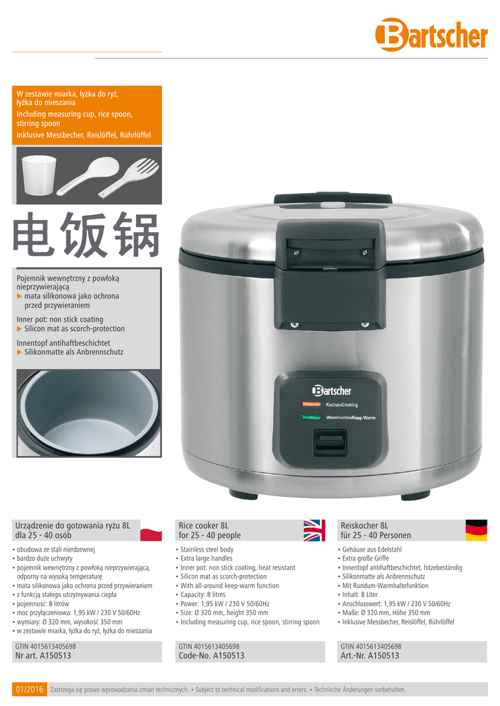 W zestawie miarka, łyżka do ryż, łyżka do mieszania Including measuring cup, rice spoon, stirring spoon Inklusive Messbecher, Reislöffel, Rührlöffel Pojemnik wewnętrzny z powłoką nieprzywierającą u mata silikonowa jako ochrona przed przywieraniem Inner pot: non stick coating u Silicon mat as scorch-protection Innentopf antihaftbeschichtet u Silikonmatte als Anbrennschutz Urządzenie do gotowania ryżu 8L dla 25 - 40 osób • obudowa ze stali nierdzewnej • bardzo duże uchwyty • pojemnik wewnętrzny z powłoką nieprzywierającą, odporny na wysoką temperaturę • mata silikonowa jako ochrona przed przywieraniem • z funkcją stałego utrzymywania ciepła • pojemność: 8 litrów • moc przyłączeniowa: 1,95 kW / 230 V 50/60Hz • wymiary: Ø 320 mm, wysokość 350 mm • w zestawie miarka, łyżka do ryż, łyżka do mieszania GTIN 4015613405698 Nr art. A150513 01/2016 Rice cooker 8L for 25 - 40 people • Stainless steel body • Extra large handles • Inner pot: non stick coating, heat resistant • Silicon mat as scorch-protection • With all-around keep-warm function • Capacity: 8 litres • Power: 1,95 kW / 230 V 50/60Hz • Size: Ø 320 mm, height 350 mm • Including measuring cup, rice spoon, stirring spoon GTIN 4015613405698 Code-No. A150513 Reiskocher 8L für 25 - 40 Personen • Gehäuse aus Edelstahl • Extra große Griffe • Innentopf antihaftbeschichtet, hitzebeständig • Silikonmatte als Anbrennschutz • Mit Rundum-Warmhaltefunktion • Inhalt: 8 Liter • Anschlusswert: 1,95 kW / 230 V 50/60Hz • Maße: Ø 320 mm, Höhe 350 mm • Inklusive Messbecher, Reislöffel, Rührlöffel GTIN 4015613405698 Art.-Nr. A150513 Zastrzega się prawo wprowadzania zmian technicznych. • Subject to technical modifications and errors. • Technische Änderungen vorbehalten.