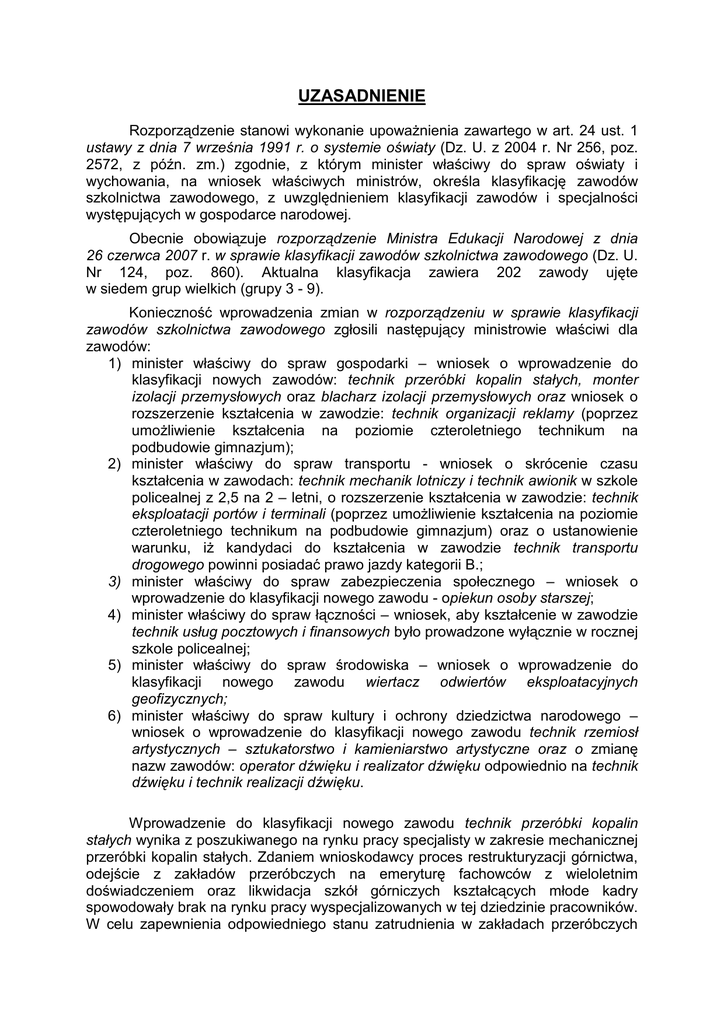 UZASADNIENIE Rozporządzenie stanowi wykonanie upowaŜnienia zawartego w art. 24 ust. 1 ustawy z dnia 7 września 1991 r. o systemie oświaty (Dz. U. z 2004 r. Nr 256, poz. 2572, z późn. zm.) zgodnie, z którym minister właściwy do spraw oświaty i wychowania, na wniosek właściwych ministrów, określa klasyfikację zawodów szkolnictwa zawodowego, z uwzględnieniem klasyfikacji zawodów i specjalności występujących w gospodarce narodowej. Obecnie obowiązuje rozporządzenie Ministra Edukacji Narodowej z dnia 26 czerwca 2007 r. w sprawie klasyfikacji zawodów szkolnictwa zawodowego (Dz. U. Nr 124, poz. 860). Aktualna klasyfikacja zawiera 202 zawody ujęte w siedem grup wielkich (grupy 3 - 9). Konieczność wprowadzenia zmian w rozporządzeniu w sprawie klasyfikacji zawodów szkolnictwa zawodowego zgłosili następujący ministrowie właściwi dla zawodów: 1) minister właściwy do spraw gospodarki – wniosek o wprowadzenie do klasyfikacji nowych zawodów: technik przeróbki kopalin stałych, monter izolacji przemysłowych oraz blacharz izolacji przemysłowych oraz wniosek o rozszerzenie kształcenia w zawodzie: technik organizacji reklamy (poprzez umoŜliwienie kształcenia na poziomie czteroletniego technikum na podbudowie gimnazjum); 2) minister właściwy do spraw transportu - wniosek o skrócenie czasu kształcenia w zawodach: technik mechanik lotniczy i technik awionik w szkole policealnej z 2,5 na 2 – letni, o rozszerzenie kształcenia w zawodzie: technik eksploatacji portów i terminali (poprzez umoŜliwienie kształcenia na poziomie czteroletniego technikum na podbudowie gimnazjum) oraz o ustanowienie warunku, iŜ kandydaci do kształcenia w zawodzie technik transportu drogowego powinni posiadać prawo jazdy kategorii B.; 3) minister właściwy do spraw zabezpieczenia społecznego – wniosek o wprowadzenie do klasyfikacji nowego zawodu - opiekun osoby starszej; 4) minister właściwy do spraw łączności – wniosek, aby kształcenie w zawodzie technik usług pocztowych i finansowych było prowadzone wyłącznie w rocznej szkole policealnej; 5) minister właściwy do spraw środowiska – wniosek o wprowadzenie do klasyfikacji nowego zawodu wiertacz odwiertów eksploatacyjnych geofizycznych; 6) minister właściwy do spraw kultury i ochrony dziedzictwa narodowego – wniosek o wprowadzenie do klasyfikacji nowego zawodu technik rzemiosł artystycznych – sztukatorstwo i kamieniarstwo artystyczne oraz o zmianę nazw zawodów: operator dźwięku i realizator dźwięku odpowiednio na technik dźwięku i technik realizacji dźwięku. Wprowadzenie do klasyfikacji nowego zawodu technik przeróbki kopalin stałych wynika z poszukiwanego na rynku pracy specjalisty w zakresie mechanicznej przeróbki kopalin stałych. Zdaniem wnioskodawcy proces restrukturyzacji górnictwa, odejście z zakładów przeróbczych na emeryturę fachowców z wieloletnim doświadczeniem oraz likwidacja szkół górniczych kształcących młode kadry spowodowały brak na rynku pracy wyspecjalizowanych w tej dziedzinie pracowników. W celu zapewnienia odpowiedniego stanu zatrudnienia w zakładach przeróbczych zaistniała konieczność kształcenia młodych ludzi w zawodzie technik przeróbki kopalin stałych. Wprowadzenie do klasyfikacji nowych zawodów: monter izolacji przemysłowych oraz blacharz izolacji przemysłowych odpowiada na zapotrzebowanie rynku pracy, firm działających w sektorze izolacji przemysłowych, na specjalistów z dziedziny wykonywania i montaŜu izolacji przemysłowych. Stale rosnące zapotrzebowanie na usługi dotyczące montowania, remontowania i konserwowania izolacji przemysłowych determinuje rozwój firm, co jest moŜliwe pod warunkiem pozyskania wykwalifikowanych pracowników. Wprowadzenie tych zawodów do klasyfikacji zawodów szkolnictwa zawodowego pozwoli zaspokoić ogromne potrzeby branŜy izolacji przemysłowych w wysokiej klasy fachowców. Skrócenie czasu kształcenia w zawodach: technik mechanik lotniczy i technik awionik w szkole policealnej z 2,5 na 2 – letni wynika z potrzeby zrównania liczby godzin kształcenia w tych zawodach w odniesieniu do technikum i szkoły policealnej. Liczba godzin przewidzianych w 2,5 – letniej szkole policealnej na kształcenie zawodowe wynosi 62,5 godziny tygodniowo w pełnym cyklu kształcenia, podczas gdy w technikach liczba godzin wynosi 50 godzin tygodniowo w cyklu kształcenia. Uczniowie kształcący się w tym samym zawodzie w technikum lub w szkole policealnej, w oparciu o ten sam program nauczania, powinni mieć ten sam wymiar godzin. NaleŜy zaznaczyć istotę tych zmian w odniesieniu do faktu, Ŝe w szkole policealnej kształcą się uczniowie, którzy juŜ ukończyli szkoły średnie i mają większe moŜliwości przyswajania wiedzy i umiejętności. Liczba godzin przewidzianych na kształcenie zawodowe w 4-letnim technikum dla młodzieŜy i w 2-letniej szkole policealnej dla młodzieŜy w obu wymienionych typach szkół jest jednakowa i wynosi 50 godzin tygodniowo w całym cyklu nauki. Potrzeba rozszerzenia kształcenia w zawodzie: technik eksploatacji portów i terminali, poprzez umoŜliwienie kształcenia na poziomie czteroletniego technikum na podbudowie gimnazjum, wynika z dynamicznego rozwoju sektora transportu lotniczego jak równieŜ związana jest z procesem przejmowania przez stronę cywilną lotnisk wojskowych. Obecnie w pracach parlamentarnych znajduje się ustawa o zmianie ustawy o gospodarowaniu niektórymi składnikami mienia Skarbu Państwa oraz Agencji Mienia Wojskowego oraz zmianie niektórych innych ustaw, która ma za cel umoŜliwić stronie cywilnej przejęcie szeregu lotnisk wojskowych (lotniska trwale niewykorzystywane do realizacji zadań MON, a takŜe lotniska częściowo lub czasowo niewykorzystywane przez MON) przez władze samorządowe. Po wejściu w Ŝycie ww. ustawy nastąpi gwałtowne zwiększenie lotnisk cywilnych uŜytku publicznego, a co za tym idzie duŜe zapotrzebowanie na wysp