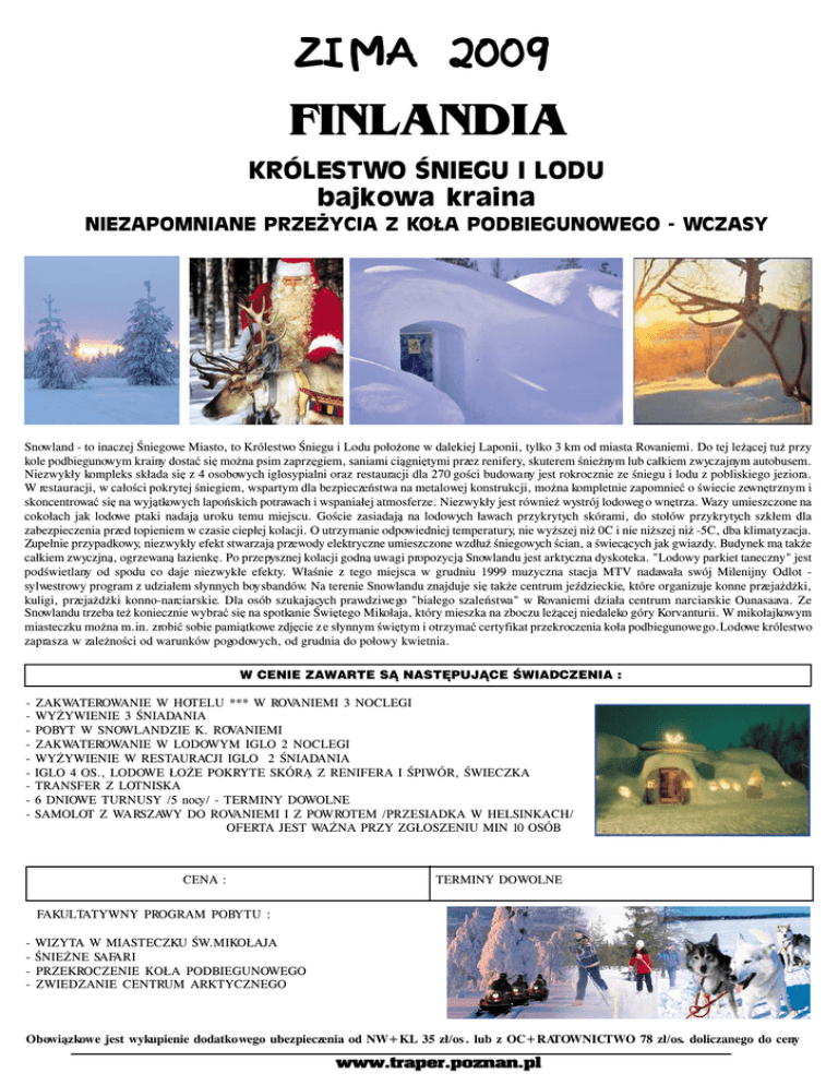 ZIMA 2009 FINLANDIA KRÓLESTWO ŚNIEGU I LODU bajkowa kraina NIEZAPOMNIANE PRZEŻYCIA Z KOŁA PODBIEGUNOWEGO - WCZASY Snowland - to inaczej Śniegowe Miasto, to Królestwo Śniegu i Lodu położone w dalekiej Laponii, tylko 3 km od miasta Rovaniemi. Do tej leżącej tuż przy kole podbiegunowym krainy dostać się można psim zaprzęgiem, saniami ciągniętymi przez renifery, skuterem śnieżnym lub całkiem zwyczajnym autobusem. Niezwykły kompleks składa się z 4 osobowych iglosypialni oraz restauracji dla 270 gości budowany jest rokrocznie ze śniegu i lodu z pobliskiego jeziora. W restauracji, w całości pokrytej śniegiem, wspartym dla bezpieczeństwa na metalowej konstrukcji, można kompletnie zapomnieć o świecie zewnętrznym i skoncentrować się na wyjątkowych lapońskich potrawach i wspaniałej atmosferze. Niezwykły jest również wystrój lodoweg o wnętrza. Wazy umieszczone na cokołach jak lodowe ptaki nadają uroku temu miejscu. Goście zasiadają na lodowych ławach przykrytych skórami, do stołów przykrytych szkłem dla zabezpieczenia przed topieniem w czasie ciepłej kolacji. O utrzymanie odpowiedniej temperatury, nie wyższej niż 0C i nie niższej niż -5C, dba klimatyzacja. Zupełnie przypadkowy, niezwykły efekt stwarzają przewody elektryczne umieszczone wzdłuż śniegowych ścian, a świecących jak gwiazdy. Budynek ma także całkiem zwyczjną, ogrzewaną łazienkę. Po przepysznej kolacji godną uwagi propozycją Snowlandu jest arktyczna dyskoteka. "Lodowy parkiet taneczny" jest podświetlany od spodu co daje niezwykłe efekty. Właśnie z tego miejsca w grudniu 1999 muzyczna stacja MTV nadawała swój Milenijny Odlot sylwestrowy program z udziałem słynnych boysbandów. Na terenie Snowlandu znajduje się także centrum jeździeckie, które organizuje konne przejażdżki, kuligi, przejażdżki konno-narciarskie. Dla osób szukających prawdziwego "białego szaleństwa" w Rovaniemi działa centrum narciarskie Ounasaava. Ze Snowlandu trzeba też koniecznie wybrać się na spotkanie Świętego Mikołaja, który mieszka na zboczu leżącej niedaleko góry Korvanturii. W mikołajkowym miasteczku można m.in. zrobić sobie pamiątkowe zdjęcie z e słynnym świętym i otrzymać certyfikat przekroczenia koła podbiegunowego.Lodowe królestwo zaprasza w zależności od warunków pogodowych, od grudnia do połowy kwietnia. W CENIE ZAWARTE S¥ NASTÊPUJ¥CE ŒWIADCZENIA : - ZAKWATEROWANIE W HOTELU *** W ROVANIEMI 3 NOCLEGI WYŻYWIENIE 3 ŚNIADANIA POBYT W SNOWLANDZIE K. ROVANIEMI ZAKWATEROWANIE W LODOWYM IGLO 2 NOCLEGI WYŻYWIENIE W RESTAURACJI IGLO 2 ŚNIADANIA IGLO 4 OS., LODOWE ŁOŻE POKRYTE SKÓRĄ Z RENIFERA I ŚPIWÓR, ŚWIECZKA TRANSFER Z LOTNISKA 6 DNIOWE TURNUSY /5 nocy/ - TERMINY DOWOLNE SAMOLOT Z WARSZAWY DO ROVANIEMI I Z POWROTEM /PRZESIADKA W HELSINKACH/ OFERTA JEST WAŻNA PRZY ZGŁOSZENIU MIN 10 OSÓB CENA : TERMINY DOWOLNE FAKULTATYWNY PROGRAM POBYTU : - WIZYTA W MIASTECZKU ŚW.MIKOŁAJA ŚNIEŻNE SAFARI PRZEKROCZENIE KOŁA PODBIEGUNOWEGO ZWIEDZANIE CENTRUM ARKTYCZNEGO Obowiązkowe jest wykupienie dodatkowego ubezpieczenia od NW+KL 35 zł/os . lub z OC+RATOWNICTWO 78 zł/os. doliczanego do ceny www.traper.poznan.pl