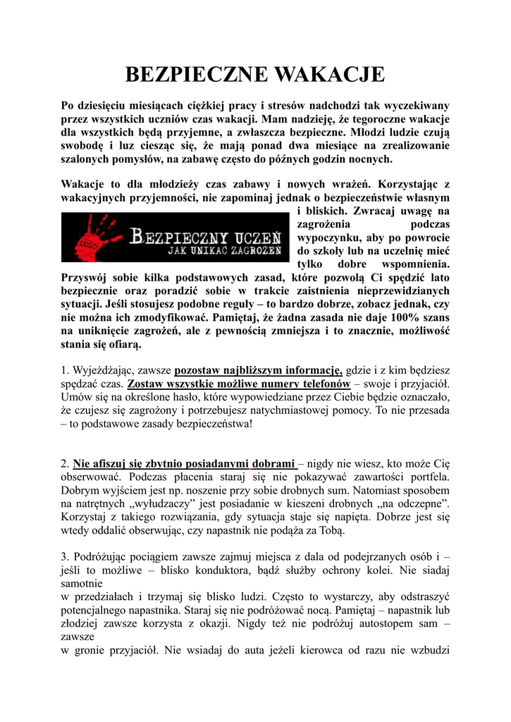 BEZPIECZNE WAKACJE Po dziesięciu miesiącach ciężkiej pracy i stresów nadchodzi tak wyczekiwany przez wszystkich uczniów czas wakacji. Mam nadzieję, że tegoroczne wakacje dla wszystkich będą przyjemne, a zwłaszcza bezpieczne. Młodzi ludzie czują swobodę i luz ciesząc się, że mają ponad dwa miesiące na zrealizowanie szalonych pomysłów, na zabawę często do późnych godzin nocnych. Wakacje to dla młodzieży czas zabawy i nowych wrażeń. Korzystając z wakacyjnych przyjemności, nie zapominaj jednak o bezpieczeństwie własnym i bliskich. Zwracaj uwagę na zagrożenia podczas wypoczynku, aby po powrocie do szkoły lub na uczelnię mieć tylko dobre wspomnienia. Przyswój sobie kilka podstawowych zasad, które pozwolą Ci spędzić lato bezpiecznie oraz poradzić sobie w trakcie zaistnienia nieprzewidzianych sytuacji. Jeśli stosujesz podobne reguły – to bardzo dobrze, zobacz jednak, czy nie można ich zmodyfikować. Pamiętaj, że żadna zasada nie daje 100% szans na uniknięcie zagrożeń, ale z pewnością zmniejsza i to znacznie, możliwość stania się ofiarą. 1. Wyjeżdżając, zawsze pozostaw najbliższym informację, gdzie i z kim będziesz spędzać czas. Zostaw wszystkie możliwe numery telefonów – swoje i przyjaciół. Umów się na określone hasło, które wypowiedziane przez Ciebie będzie oznaczało, że czujesz się zagrożony i potrzebujesz natychmiastowej pomocy. To nie przesada – to podstawowe zasady bezpieczeństwa! 2. Nie afiszuj się zbytnio posiadanymi dobrami – nigdy nie wiesz, kto może Cię obserwować. Podczas płacenia staraj się nie pokazywać zawartości portfela. Dobrym wyjściem jest np. noszenie przy sobie drobnych sum. Natomiast sposobem na natrętnych „wyłudzaczy” jest posiadanie w kieszeni drobnych „na odczepne”. Korzystaj z takiego rozwiązania, gdy sytuacja staje się napięta. Dobrze jest się wtedy oddalić obserwując, czy napastnik nie podąża za Tobą. 3. Podróżując pociągiem zawsze zajmuj miejsca z dala od podejrzanych osób i – jeśli to możliwe – blisko konduktora, bądź służby ochrony kolei. Nie siadaj samotnie w przedziałach i trzymaj się blisko ludzi. Często to wystarczy, aby odstraszyć potencjalnego napastnika. Staraj się nie podróżować nocą. Pamiętaj – napastnik lub złodziej zawsze korzysta z okazji. Nigdy też nie podróżuj autostopem sam – zawsze w gronie przyjaciół. Nie wsiadaj do auta jeżeli kierowca od razu nie wzbudzi Twojego zaufania lub będziesz mieć jakiekolwiek wątpliwości. Wracając z imprezy nocą nigdy nie korzystaj z ofert podwiezienia przez obcych. 4. Kiedy ktoś Cię zaczepia, nie wdawaj się w rozmowy – czasami lepiej udać, że się nie słyszy i iść dalej. Kiedy zaczepki się nasilą, odpowiadaj pewnie, krótko, bez wdawania się w dyskusję. Nie obrażaj napastnika. Kiedy ktoś Cię celowo potrąci, nie odwracaj się i idź dalej. Można również przeprosić – dla własnego dobra. 5. Przebywając na plaży, pływalni czy w wakacyjnym tłumie, uważaj na swoją torbę, portfel, telefon. Nie noś portfela i dokumentów razem i nigdy nie wkładaj ich do tylnej kieszeni. Dokładnie zapinaj plecaki i torby. Torebkę trzymaj, obejmując ją całą od spodu, pamiętając przy tym, aby zawsze była zamknięta. Wartościowe rzeczy noś tylko w zamykanych kieszeniach. Jeśli bawisz się na imprezie, nigdy nie pozostawiaj swoich rzeczy bez opieki – kradzieże torebek, portfeli, telefonów komórkowych zdarzają się w klubach niezwykle często. Złodziej prowadzi wnikliwą obserwację wybierając swoje ofiary. 6. Zawsze i wszędzie pilnuj swoich napojów. Przypadki dosypywania i dolewania różnych specyfików są coraz większym problemem. Po takich substancjach nabierasz niewyobrażalnej ochoty na seks, tracisz samokontrolę, łatwo jest Cię nakłonić do robienia różnych rzeczy, a nazajutrz niczego nie pamiętasz. Nigdy nie przyjmuj napojów od nieznanych lub mało znanych Ci osób. Jeśli idziesz na parkiet, napoje zostaw pod opieką osoby zaufanej. 7. Nigdy nie wybieraj się na dyskotekę sam – zawsze w gronie znajomych. Nie wychodź z dyskoteki samotnie – staraj się wracać do miejsca zamieszkania w towarzystwie przyjaciół. Wychodząc z dyskoteki włóż wierzchnie okrycie i wygodne obuwie – bardzo „swobodny” strój często prowokuje agresję. Dobrze jest również nosić przy sobie miotacz gazu lub żel obezwładniający. Pamiętaj jednak, że jest to przedmiot służący do obrony, więc stosuj go zgodnie z przeznaczeniem! 8. Wakacje to okres wzmożonej działalności dealerów narkotykowych. Pamiętaj, że mitem jest, iż „dopalacze” pomagają w dobrej zabawie. Naucz się być asertywnym! Naucz się odmawiać. PAMIĘTAJ – NIE ISTNIEJE BEZPIECZNE BRANIE NARKOTYKÓW! 9. To czas relaksu i zabawy, ale nie każdy pomysł na zabawę jest dobry. Nierzadko ostatni szkolny dzwonek dla młodych ludzi sygnałem rozpoczynającym „wielkie imprezy”, a wraz z nim – wielkie ryzyko. Nie daj szans, aby wakacyjne picie powiększyło związane z tym statystyki tragicznych wydarzeń. Alkohol wzmaga agresję, a jednocześnie nietrzeźwy nastolatek jest łatwiejszą ofiarą przestępstwa. Nadmiar alkoholu nierzadko też prowadzi do ryzykownych zbliżeń seksualnych, a ryzykowny seks to groźba zakażenia chorobami wenerycznymi lub HIV. Alkohol, zwłaszcza w nadmiarze, potęguje też ryzyko stosunków z pogranicza gwałtu, przypadkowe inicjacje i niechciane ciąże. 10. Okres wakacji to również intensywny werbunek prowadzony przez sekty czy osoby werbujące ludzi- handel ludźmi. Nie opowiadaj nowo poznanym ludziom o swoich kłopotach czy marzeniach. Możesz być zaproszony na „bardzo ważne spotkanie”. Jeżeli osoba jest bardzo życzliwa, ale nie chce odpowiedzieć na Twoje pytanie o cel spotkania i osoby lub instytucje je organizujące: „bo tam się wszystkiego dowiesz”, bądź ostrożny. Nie idź, jeżeli wcześniej n