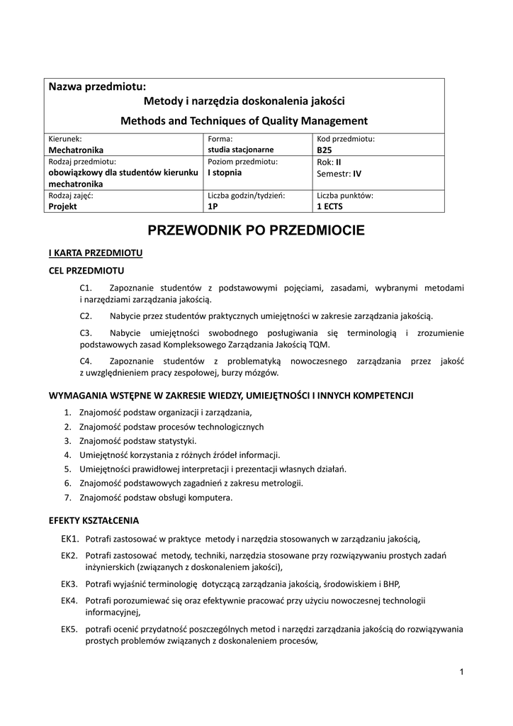 Nazwa przedmiotu: Metody i narzędzia doskonalenia jakości Methods and Techniques of Quality Management Kierunek: Forma: studia stacjonarne Poziom przedmiotu: Mechatronika Kod przedmiotu: obowiązkowy dla studentów kierunku mechatronika I stopnia B25 Rok: II Semestr: IV Rodzaj zajęć: Liczba godzin/tydzień: Liczba punktów: Projekt 1P 1 ECTS Rodzaj przedmiotu: PRZEWODNIK PO PRZEDMIOCIE I KARTA PRZEDMIOTU CEL PRZEDMIOTU C1. Zapoznanie studentów z podstawowymi pojęciami, zasadami, wybranymi metodami i narzędziami zarządzania jakością. C2. Nabycie przez studentów praktycznych umiejętności w zakresie zarządzania jakością. C3. Nabycie umiejętności swobodnego posługiwania się terminologią i zrozumienie podstawowych zasad Kompleksowego Zarządzania Jakością TQM. C4. Zapoznanie studentów z problematyką z uwzględnieniem pracy zespołowej, burzy mózgów. nowoczesnego zarządzania przez jakość WYMAGANIA WSTĘPNE W ZAKRESIE WIEDZY, UMIEJĘTNOŚCI I INNYCH KOMPETENCJI 1. 2. 3. 4. 5. 6. 7. Znajomość podstaw organizacji i zarządzania, Znajomość podstaw procesów technologicznych Znajomość podstaw statystyki. Umiejętność korzystania z różnych źródeł informacji. Umiejętności prawidłowej interpretacji i prezentacji własnych działań. Znajomość podstawowych zagadnień z zakresu metrologii. Znajomość podstaw obsługi komputera. EFEKTY KSZTAŁCENIA EK1. Potrafi zastosować w praktyce metody i narzędzia stosowanych w zarządzaniu jakością, EK2. Potrafi zastosować metody, techniki, narzędzia stosowane przy rozwiązywaniu prostych zadań inżynierskich (związanych z doskonaleniem jakości), EK3. Potrafi wyjaśnić terminologię dotyczącą zarządzania jakością, środowiskiem i BHP, EK4. Potrafi porozumiewać się oraz efektywnie pracować przy użyciu nowoczesnej technologii informacyjnej, EK5. potrafi ocenić przydatność poszczególnych metod i narzędzi zarządzania jakością do rozwiązywania prostych problemów związanych z doskonaleniem procesów, 1 EK6. identyfikuje tendencje i kierunki rozwoju w zakresie zarządzania jakością, EK7. ma świadomość wpływu aspektów i skutków działalności inżynierskiej na środowisko i otoczenie i związanej z tym odpowiedzialności za podejmowane decyzje, EK8. ma świadomość potrzeby kształcenia przez całe życie w tym z uwzględnieniem metod kształcenia na odległość. TREŚCI PROGRAMOWE Liczba godzin Forma zajęć – PROJEKT P1. P2. P3. P4. P5. P6. P7. P8. P9. P10. P11. P12. P13. P14. P15. Jakość – filozofia, podstawowe pojęcia i definicje - historia i teraźniejszość Koncepcje zarządzania jakością według uznanych autorytetów – e-learning Statystyczne metody kontroli jakości – e-learning Statystyczna kontrola procesu – karty kontrolne Shewharta – e-learning Karty kontrolne cech mierzalnych – e-learning Karty kontrolne dla cech ocenianych alternatywnie – e-learning Karty kontrolne x i R – e-learning Analiza sygnałów karty kontrolnej x -R – e-learning Karty kontrolne typu p oraz np – e-learning Karty kontrolne typu CUSUM oraz MA – e-learning Badanie normalności rozkładu metodą Pearson’a – e-learning Badanie normalności rozkładu metodą Kołmogorow’a – e-learning Burza mózgów jako narzędzie doskonalenia jakości – e-learning Dokumentacja SZJ – Przegląd i ocena dokumentacji Dokumentacja SZJ – Przegląd i ocena dokumentacji 1 1 1 1 1 1 1 1 1 1 1 1 1 1 1 NARZĘDZIA DYDAKTYCZNE 1. 2. 3. 4. 5. 6. Zajęcia z wykorzystaniem metod i narzędzi do kształcenia online ćwiczenia projektowe, praca metodą projektu, praca grupowa, zespołowa instrukcje do wykonania ćwiczeń prezentacje multimedialne dowolny arkusz kalkulacyjny (zalecany Libre Office Calc), przeglądarka internetowa (zalecana Mozilla Firefox + Flesh) SPOSOBY OCENY ( F – FORMUJĄCA, P – PODSUMOWUJĄCA) F1. – ocena z zadań projektowych sprawdzających umiejętności wykorzystania nabytej wiedzy w praktyce*) realizowanych na platformie F2. – oceny z testów i quizów sprawdzających wiedzę*) realizowanych na platformie F3. – aktywność na zajęciach tradycyjnych oraz online P1. – wypadkowa ocen uzyskanych w trakcie semestru P2. – Ocena z testu końcowego *) warunkiem uzyskania zaliczenia jest otrzymanie pozytywnych ocen ze wszystkich ćwiczeń, OBCIĄŻENIE PRACĄ STUDENTA Forma aktywności 2 Średnia liczba godzin na zrealizowanie aktywności Godziny kontaktowe z prowadzącym 15 P→ 15h Przygotowanie do ćwiczeń projektowych 2.5 h Wykonanie zadań oraz projektów (przy wsparciu prowadzącego online) 2.5 h Obecność na konsultacjach 5h Suma 25 h SUMARYCZNA LICZBA PUNKTÓW ECTS DLA PRZEDMIOTU Liczba punktów ECTS, którą student uzyskuje na zajęciach wymagających bezpośredniego udziału prowadzącego Liczba punktów ECTS, którą student uzyskuje w ramach zajęć o charakterze praktycznym, w tym zajęć laboratoryjnych i projektowych 1 ECTS 0.8 ECTS 0.8 ECTS LITERATURA PODSTAWOWA I UZUPEŁNIAJĄCA 1. Wasilewski L.: Podstawy zarządzania jakością, Wyd. WyŜ. Szkoły Przedsiębiorczości i Zarządzania, Warszawa 1998. 2. Hamrol A., Mantura Wł.: Zarządzanie jakością. Teoria i praktyka. Wyd. Naukowe PWN, Warszawa 2011. 3. Hamrol A., Zarządzanie jakością z przykładami. Wyd. Naukowe PWN, Warszawa 2008. 4. Jazdon A.: Doskonalenie zarządzania jakością, OWOP, Bydgoszcz 2001. 5. Greber T.: Statystyczne sterowanie procesami - doskonalenie jakości z pakietem STATISTICA, StatSoft Polska, Kraków 2000 6. Thompson J.R., Koronacki J., Nieckuła J.: Techniki zarządzania jakością od Shewharta do metody Six Sigma, Wydawnictwo EXIT, 2005 7. Kindlarski E.: Kontrola i sterowanie jakością, Wyd. Politechniki Warszawskiej, Warszawa 1993. 8. Bank J.: Zarządzanie przez jakość, Wyd. Gebethner & Ska, Warszawa 1996. 9. Elektroniczny Podręcznik Statystyczny, http://www.StatSoft.pl/textbook/stathome.html 10. M., Trocki, B. Grucza, K. Ogonek: Zarządzanie projektami. Warsz