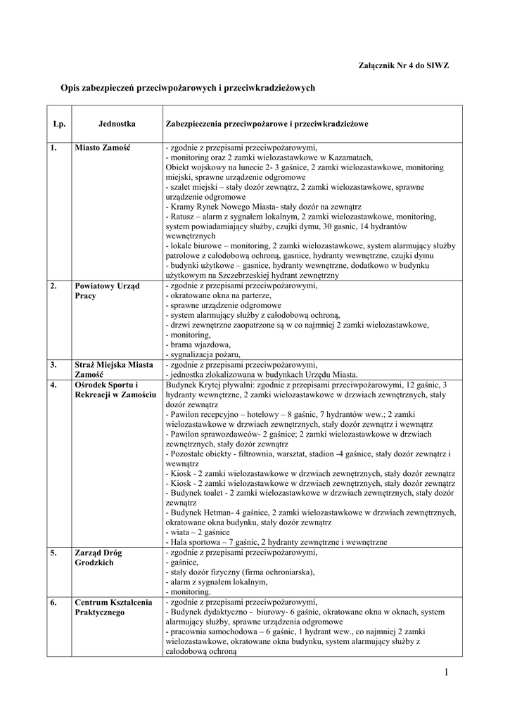 Załącznik Nr 4 do SIWZ Opis zabezpieczeń przeciwpożarowych i przeciwkradzieżowych Lp. Jednostka 1. Miasto Zamość 2. Powiatowy Urząd Pracy 3. Straż Miejska Miasta Zamość Ośrodek Sportu i Rekreacji w Zamościu 4. 5. Zarząd Dróg Grodzkich 6. Centrum Kształcenia Praktycznego Zabezpieczenia przeciwpożarowe i przeciwkradzieżowe - zgodnie z przepisami przeciwpożarowymi, - monitoring oraz 2 zamki wielozastawkowe w Kazamatach, Obiekt wojskowy na lunecie 2- 3 gaśnice, 2 zamki wielozastawkowe, monitoring miejski, sprawne urządzenie odgromowe - szalet miejski – stały dozór zewnątrz, 2 zamki wielozastawkowe, sprawne urządzenie odgromowe - Kramy Rynek Nowego Miasta- stały dozór na zewnątrz - Ratusz – alarm z sygnałem lokalnym, 2 zamki wielozastawkowe, monitoring, system powiadamiający służby, czujki dymu, 30 gasnic, 14 hydrantów wewnętrznych - lokale biurowe – monitoring, 2 zamki wielozastawkowe, system alarmujący służby patrolowe z całodobową ochroną, gasnice, hydranty wewnętrzne, czujki dymu - budynki użytkowe – gasnice, hydranty wewnętrzne, dodatkowo w budynku użytkowym na Szczebrzeskiej hydrant zewnętrzny - zgodnie z przepisami przeciwpożarowymi, - okratowane okna na parterze, - sprawne urządzenie odgromowe - system alarmujący służby z całodobową ochroną, - drzwi zewnętrzne zaopatrzone są w co najmniej 2 zamki wielozastawkowe, - monitoring, - brama wjazdowa, - sygnalizacja pożaru, - zgodnie z przepisami przeciwpożarowymi, - jednostka zlokalizowana w budynkach Urzędu Miasta. Budynek Krytej pływalni: zgodnie z przepisami przeciwpożarowymi, 12 gaśnic, 3 hydranty wewnętrzne, 2 zamki wielozastawkowe w drzwiach zewnętrznych, stały dozór zewnątrz - Pawilon recepcyjno – hotelowy – 8 gaśnic, 7 hydrantów wew.; 2 zamki wielozastawkowe w drzwiach zewnętrznych, stały dozór zewnątrz i wewnątrz - Pawilon sprawozdawców- 2 gaśnice; 2 zamki wielozastawkowe w drzwiach zewnętrznych, stały dozór zewnątrz - Pozostałe obiekty - filtrownia, warsztat, stadion -4 gaśnice, stały dozór zewnątrz i wewnątrz - Kiosk - 2 zamki wielozastawkowe w drzwiach zewnętrznych, stały dozór zewnątrz - Kiosk - 2 zamki wielozastawkowe w drzwiach zewnętrznych, stały dozór zewnątrz - Budynek toalet - 2 zamki wielozastawkowe w drzwiach zewnętrznych, stały dozór zewnątrz - Budynek Hetman- 4 gaśnice, 2 zamki wielozastawkowe w drzwiach zewnętrznych, okratowane okna budynku, stały dozór zewnątrz - wiata – 2 gaśnice - Hala sportowa – 7 gaśnic, 2 hydranty zewnętrzne i wewnętrzne - zgodnie z przepisami przeciwpożarowymi, - gaśnice, - stały dozór fizyczny (firma ochroniarska), - alarm z sygnałem lokalnym, - monitoring. - zgodnie z przepisami przeciwpożarowymi, - Budynek dydaktyczno - biurowy- 6 gaśnic, okratowane okna w oknach, system alarmujący służby, sprawne urządzenia odgromowe - pracownia samochodowa – 6 gaśnic, 1 hydrant wew., co najmniej 2 zamki wielozastawkowe, okratowane okna budynku, system alarmujący służby z całodobową ochroną 1 - pracownia obróbki ręcznej – 4 gaśnice, 1 hydrant wew.; co najmniej 2 zamki wielozastawkowe, okratowane okna budynku, system alarmujący służby z całodobową ochroną` - pracownia mechaniczna – 4 gaśnice, co najmniej 2 zamki wielozastawkowe, okratowane okna w połowie budynku, system alarmujący służby z całodobową ochroną - pracownie budowlane – 13 gaśnic, 2 hydranty, co najmniej 2 zamki wielozastawkowe, okratowane okna w połowie budynku, system alarmujący służby z całodobową ochroną - Budynki magazynowe – 2 gaśnice, okratowane okna w budynku - budynek materiałów pędnych – 2 gaśnice, co najmniej 2 zamki wielozastawkowe - hala maszyn – 6 gaśnic, 2 zamki wielozastawkowe, okratowane okna budynku, system alarmujący służby z całodobową ochroną - stodoła – hydrant wew. 7. Izba Wytrzeźwień 8. Ogród Zoologiczny - zgodnie z przepisami przeciwpożarowymi, - stały dozór fizyczny, - drzwi zewnętrzne zaopatrzone są w co najmniej 2 zamki wielozastawkowe, - monitoring, - ogrodzenie, - 8 gaśnic. - zgodnie z przepisami przeciwpożarowymi, - Budynek administracyjny – 2 gaśnice, hydr. zewnętrzny, 2 zamki wielozastawkowe, okratowane okna budynku, stały dozór wewnątrz, system alarmujący służby z całodobowa ochroną - Stodoła - 2 gaśnice, hydr. zewnętrzny, 2 zamki wielozastawkowe, stały dozór wewnątrz, sprawne urządzenia odgromowe - Szalet ZOO; Budynek kasy ZOO II – 1 hydrant zew.; 2 zamki wielozastawkowe, stały dozór wewnątrz, sprawne urządzenia odgromowe - Budynek socjalny ZOO szatnia – 1 gaśnica, 1 hydrant zew., sprawne urządzenia odgromowe - Budynek socjalny ZOO kuchnia – 2 gaśnice, 1 hydrant zew., 2 zamki wielozastawkowe, stały dozór wewnątrz, sprawne urządzenia odgromowe, system alarmujący służby z całodobowa ochroną - Pawilon dużych drapieżnych – 2 gaśnice, 2 hydranty zew., 1 hydrant wew., 2 zamki wielozastawkowe, stały dozór wewnątrz, sprawne urządzenia odgromowe - Pawilon zwierząt najwyższej inteligencji - 2 gaśnice, 1 hydranty zew., 1 hydrant wew., 2 zamki wielozastawkowe, stały dozór wewnątrz, sprawne urządzenia odgromowe - pawilon klatek - 2 gaśnice, 1 hydranty zew., 1 hydrant wew., 2 zamki wielozastawkowe, stały dozór wewnątrz, sprawne urządzenia odgromowe, system alarmujący służby z całodobową ochroną - Budynek administracyjny schronisko - 1 gaśnica, 1 hydrant zew., 1 hydrant wew., 2 zamki wielozastawkowe, stały dozór wewnątrz, sprawne urządzenia odgromowe, system alarmujący służby z całodobową ochroną - Pawilon z wybiegiem małych drap.- 2 gaśnice, 1 hydranty zew., 2 zamki wielozastawkowe, stały dozór wewnątrz, sprawne urządzenia odgromowe - Budynek ambulatoryjny - 1 gaśnica, 1 hydrant zew., 1 hydrant wew., 2 zamki wielozastawkowe, stały dozór wewnątrz, sprawne urządzenia odgromowe, system alarmujący służby z całodobową ochroną - Budynek