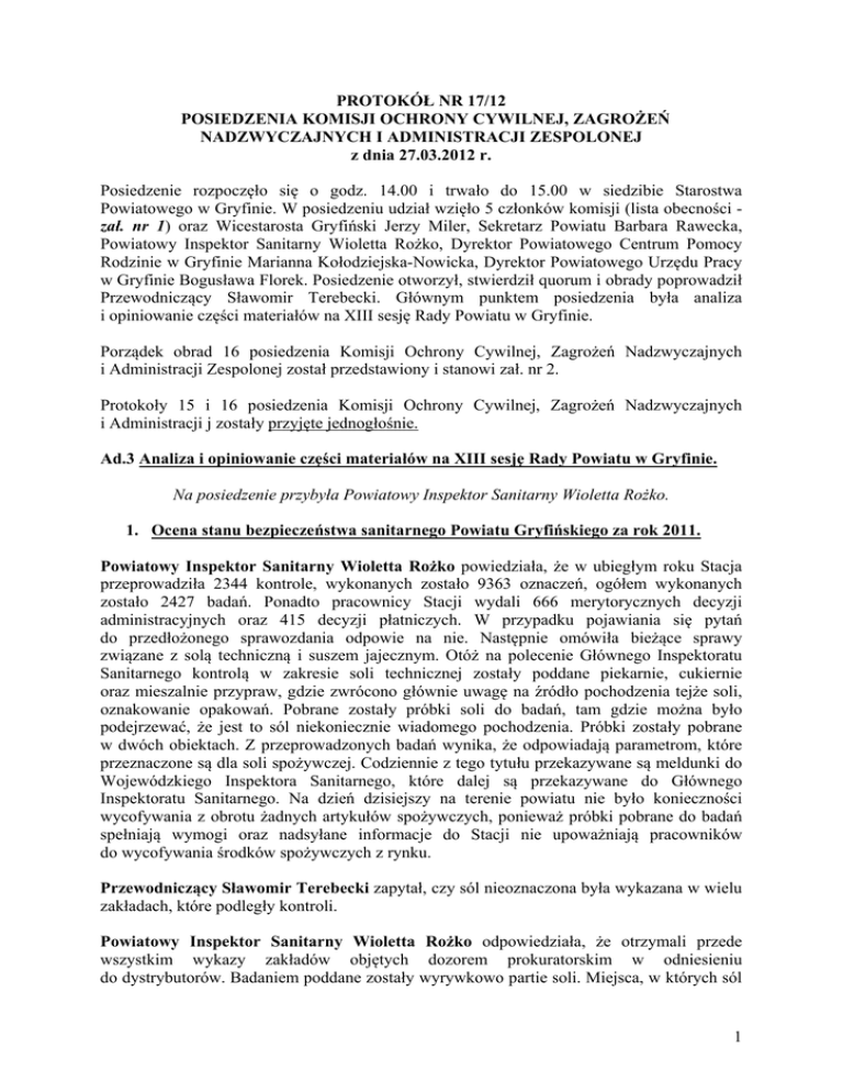 PROTOKÓŁ NR 17/12 POSIEDZENIA KOMISJI OCHRONY CYWILNEJ, ZAGROŻEŃ NADZWYCZAJNYCH I ADMINISTRACJI ZESPOLONEJ z dnia 27.03.2012 r. Posiedzenie rozpoczęło się o godz. 14.00 i trwało do 15.00 w siedzibie Starostwa Powiatowego w Gryfinie. W posiedzeniu udział wzięło 5 członków komisji (lista obecności zał. nr 1) oraz Wicestarosta Gryfiński Jerzy Miler, Sekretarz Powiatu Barbara Rawecka, Powiatowy Inspektor Sanitarny Wioletta Rożko, Dyrektor Powiatowego Centrum Pomocy Rodzinie w Gryfinie Marianna Kołodziejska-Nowicka, Dyrektor Powiatowego Urzędu Pracy w Gryfinie Bogusława Florek. Posiedzenie otworzył, stwierdził quorum i obrady poprowadził Przewodniczący Sławomir Terebecki. Głównym punktem posiedzenia była analiza i opiniowanie części materiałów na XIII sesję Rady Powiatu w Gryfinie. Porządek obrad 16 posiedzenia Komisji Ochrony Cywilnej, Zagrożeń Nadzwyczajnych i Administracji Zespolonej został przedstawiony i stanowi zał. nr 2. Protokoły 15 i 16 posiedzenia Komisji Ochrony Cywilnej, Zagrożeń Nadzwyczajnych i Administracji j zostały przyjęte jednogłośnie. Ad.3 Analiza i opiniowanie części materiałów na XIII sesję Rady Powiatu w Gryfinie. Na posiedzenie przybyła Powiatowy Inspektor Sanitarny Wioletta Rożko. 1. Ocena stanu bezpieczeństwa sanitarnego Powiatu Gryfińskiego za rok 2011. Powiatowy Inspektor Sanitarny Wioletta Rożko powiedziała, że w ubiegłym roku Stacja przeprowadziła 2344 kontrole, wykonanych zostało 9363 oznaczeń, ogółem wykonanych zostało 2427 badań. Ponadto pracownicy Stacji wydali 666 merytorycznych decyzji administracyjnych oraz 415 decyzji płatniczych. W przypadku pojawiania się pytań do przedłożonego sprawozdania odpowie na nie. Następnie omówiła bieżące sprawy związane z solą techniczną i suszem jajecznym. Otóż na polecenie Głównego Inspektoratu Sanitarnego kontrolą w zakresie soli technicznej zostały poddane piekarnie, cukiernie oraz mieszalnie przypraw, gdzie zwrócono głównie uwagę na źródło pochodzenia tejże soli, oznakowanie opakowań. Pobrane zostały próbki soli do badań, tam gdzie można było podejrzewać, że jest to sól niekoniecznie wiadomego pochodzenia. Próbki zostały pobrane w dwóch obiektach. Z przeprowadzonych badań wynika, że odpowiadają parametrom, które przeznaczone są dla soli spożywczej. Codziennie z tego tytułu przekazywane są meldunki do Wojewódzkiego Inspektora Sanitarnego, które dalej są przekazywane do Głównego Inspektoratu Sanitarnego. Na dzień dzisiejszy na terenie powiatu nie było konieczności wycofywania z obrotu żadnych artykułów spożywczych, ponieważ próbki pobrane do badań spełniają wymogi oraz nadsyłane informacje do Stacji nie upoważniają pracowników do wycofywania środków spożywczych z rynku. Przewodniczący Sławomir Terebecki zapytał, czy sól nieoznaczona była wykazana w wielu zakładach, które podległy kontroli. Powiatowy Inspektor Sanitarny Wioletta Rożko odpowiedziała, że otrzymali przede wszystkim wykazy zakładów objętych dozorem prokuratorskim w odniesieniu do dystrybutorów. Badaniem poddane zostały wyrywkowo partie soli. Miejsca, w których sól 1 pochodziła z punktów dystrybucyjnych objętych postępowaniem prokuratorskim, zostały zabezpieczone i były pobrane próbki. W wyniku przeprowadzonych badań okazało się, że sól mieści się w granicach normy dla soli spożywczej w związku, z czym nie ma obaw o zdrowie i życie mieszkańców. Przewodniczący Sławomir Terebecki zapytał, czy faktycznie badana sól była solą techniczną. Powiatowy Inspektor Sanitarny Wioletta Rożko odpowiedziała, że nie jest w stanie odpowiedzieć, ponieważ próbki brano od dystrybutorów, a ci z kolei otrzymywali sól od producentów. Ma opinię Państwowego Zakładu Higieny, z której wynika, że po przebadaniu soli technicznej substancję w niej zawarte nie powinny spowodować skutków ubocznych dla zdrowia spożywających sól. Stacja w Gryfinie nie jest w stanie powiedzieć, czy zabezpieczana sól była faktycznie solą techniczną czy nie. Badanie przeprowadzone przez Wojewódzką Stację Sanitarno-Epidemilogiczną w Szczecinie pozwoliło na dopuszczenie soli do produkcji dalszych produktów spożywczych. Przewodniczący Sławomir Terebecki zapytał, czy były kierowane jakieś zapytania z Niemiec do Sanepidu w przedmiotowej sprawie. Powiatowy Inspektor Sanitarny Wioletta Rożko odpowiedziała, że do Stacji w Gryfinie nie wpłynęły żadne dodatkowe zapytania. Stacja jedynie posługuje się wytycznymi Głównego Inspektora Sanitarnego, które są przekazywane przez wojewódzką stację. Ponadto nie wpłynęły żadne zapytania ze strony konsumentów. Odnosząc się do suszu jajecznego poinformowała, że również na polecenie Głównego Inspektoratu Sanitarnego zostały przeprowadzone kontrole piekarni, cukierni, gdzie była zwracana uwaga na produkty z zakładów objętych postępowaniem prokuratorskim. Wyszło podejrzenie, że mogły być użyte żółtka o niewłaściwej jakości spożywczej do wyprodukowania suszu jajecznego. Stacja na terenie jednego zakładu stwierdziła stosowanie suszu jajecznego pochodzącego z zakładu objętym postępowaniem prokuratorskim. Susz jajeczny został zabezpieczony, pobrano próbki i oczekuje się na wyniki. W tym przypadku również postępuje się zgodnie z poleceniami Głównego Inspektoratu Sanitarnego. Na dzień dzisiejszy nic nie zostało wycofywane z obrotu z uwagi na to, że Stacja nie otrzymała w systemie powiadamiania o niebezpiecznej żywności informacji o tym, że jakieś konkretne produkty są do wycofania w związku z zawartością suszu jajecznego. Przewodniczący Sławomir Terebecki odnosząc się do III, pkt 3 sprawozdania – „placówki podstawowej opieki zdrowotnej spełniają wymogi zgodnie z aktualnie obowiązującymi przepisami prawa” powiedział, że ma wiedzę, iż w tej chwili warunki lokalowe mają ulec zmianie i zapytał, 