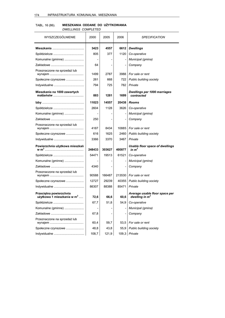 174 INFRASTRUKTURA KOMUNALNA. MIESZKANIA TABL. 16 (86). MIESZKANIA ODDANE DO UŻYTKOWANIA DWELLINGS COMPLETED WYSZCZEGÓLNIENIE 2000 2005 2006 Mieszkania ...................................... 3423 4557 Spółdzielcze .................................... 805 377 SPECIFICATION 6612 Dwellings 1120 Co-operative Komunalne (gminne) ....................... - - - Municipal (gmina) Zakładowe ....................................... 64 - - Company Przeznaczone na sprzedaż lub wynajem ........................................ 1499 2787 Społeczne czynszowe ..................... 261 668 722 Public building society Indywidualne .................................... 794 725 782 Private Mieszkania na 1000 zawartych małżeństw .................................... 883 1281 Izby .................................................. 11023 14557 Spółdzielcze .................................... 2604 1128 Komunalne (gminne) ....................... - - - Municipal (gmina) Zakładowe ....................................... 250 - - Company Przeznaczone na sprzedaż lub wynajem ........................................ 4187 8434 3988 For sale or rent 1699 Dwellings per 1000 marriages contracted 20438 Rooms 3626 Co-operative 10885 For sale or rent Społeczne czynszowe ..................... 616 1625 2460 Public building society Indywidualne .................................... 3366 3370 3467 Private Powierzchnia użytkowa mieszkań w m2 .............................................. 248433 303627 Spółdzielcze .................................... 54471 19513 400877 Usable floor space of dwellings in m2 61521 Co-operative Komunalne (gminne) ....................... - - - Municipal (gmina) Zakładowe ....................................... 4340 - - Company Przeznaczone na sprzedaż lub wynajem ........................................ 90588 166487 Społeczne czynszowe ..................... 12727 29239 40355 Public building society Indywidualne .................................... 86307 88388 85471 Private Przeciętna powierzchnia użytkowa 1 mieszkania w m2 ..... 72,6 66,6 60,6 Spółdzielcze .................................... 67,7 51,8 54,9 Co-operative Komunalne (gminne) ....................... - - - Municipal (gmina) Zakładowe ....................................... 67,8 - - Company Przeznaczone na sprzedaż lub wynajem ........................................ 60,4 59,7 53,5 For sale or rent Społeczne czynszowe ..................... 48,8 43,8 55,9 Public building society Indywidualne .................................... 108,7 121,9 213530 For sale or rent Average usable floor space per dwelling in m2 109,3 Private