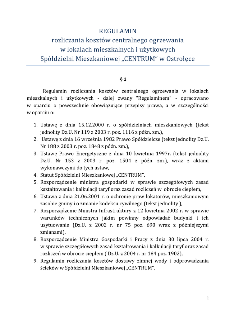 REGULAMIN rozliczania kosztów centralnego ogrzewania w lokalach mieszkalnych i użytkowych Spółdzielni Mieszkaniowej „CENTRUM” w Ostrołęce §1 Regulamin rozliczania kosztów centralnego ogrzewania w lokalach mieszkalnych i użytkowych - dalej zwany "Regulaminem" - opracowano w oparciu o powszechnie obowiązujące przepisy prawa, a w szczególności w oparciu o: 1. Ustawę z dnia 15.12.2000 r. o spółdzielniach mieszkaniowych (tekst jednolity Dz.U. Nr 119 z 2003 r. poz. 1116 z późn. zm.), 2. Ustawę z dnia 16 września 1982 Prawo Spółdzielcze (tekst jednolity Dz.U. Nr 188 z 2003 r. poz. 1848 z późn. zm.), 3. Ustawę Prawo Energetyczne z dnia 10 kwietnia 1997r. (tekst jednolity Dz.U. Nr 153 z 2003 r. poz. 1504 z późn. zm.), wraz z aktami wykonawczymi do tych ustaw, 4. Statut Spółdzielni Mieszkaniowej „CENTRUM”, 5. Rozporządzenie ministra gospodarki w sprawie szczegółowych zasad kształtowania i kalkulacji taryf oraz zasad rozliczeń w obrocie ciepłem, 6. Ustawa z dnia 21.06.2001 r. o ochronie praw lokatorów, mieszkaniowym zasobie gminy i o zmianie kodeksu cywilnego (tekst jednolity ), 7. Rozporządzenie Ministra Infrastruktury z 12 kwietnia 2002 r. w sprawie warunków technicznych jakim powinny odpowiadać budynki i ich usytuowanie (Dz.U. z 2002 r. nr 75 poz. 690 wraz z późniejszymi zmianami), 8. Rozporządzenie Ministra Gospodarki i Pracy z dnia 30 lipca 2004 r. w sprawie szczegółowych zasad kształtowania i kalkulacji taryf oraz zasad rozliczeń w obrocie ciepłem ( Dz.U. z 2004 r. nr 184 poz. 1902), 9. Regulamin rozliczania kosztów dostawy zimnej wody i odprowadzania ścieków w Spółdzielni Mieszkaniowej „CENTRUM”. 1 Postanowienia ogólne §2 Postanowienia niniejszego regulaminu mają zastosowanie w odniesieniu do wszystkich lokali mieszkalnych i użytkowych znajdujących się w budynkach zarządzanych przez Spółdzielnię, wyposażonych w instalacje centralnego ogrzewania i ciepłej wody (użytkowej). §3 1. Użyte w regulaminie określenia oznaczają: 1) spółdzielnia – Spółdzielnia Mieszkaniowa „Centrum” w Ostrołęce, 2) dostawca - przedsiębiorstwo energetyczne dostarczające ciepło na podstawie umowy sprzedaży ciepła zawartej ze Spółdzielnią, (Energa OPEC) 3) odbiorca - Spółdzielnia, 4) użytkownik lokalu - osoba, która posiada w zasobach Spółdzielni spółdzielcze prawo do lokalu, wyodrębnioną własność lokalu, najemca lokalu ( którego właścicielem jest spółdzielnia), a także osoba zajmująca lokal bez tytułu prawnego, 5) urządzenie pomiarowe - licznik ciepła (ciepłomierz), którego odczyty stanowią podstawę do obliczenia należności z tytułu dostarczonego ciepła, 6) okres rozliczeniowy - w przypadku rozliczania centralnego ogrzewania okres między 1 lipca a 30 czerwca roku następnego, w przypadku rozliczania ciepłej wody użytkowej okresy kwartalne ustalone w Regulaminie rozliczania kosztów dostawy zimnej wody i odprowadzania ścieków w S.M. „CENTRUM. 7) sezon grzewczy - okres od rozpoczęcia dostaw ciepła na cele centralnego ogrzewania do czasu zakończenia dostaw w kolejnym roku kalendarzowym, 8) powierzchnia użytkowa lokalu mieszkalnego– udział w nieruchomości określony w Uchwałach Zarządu w sprawie określenia przedmiotu odrębnej własności w danej nieruchomości, na podstawie którego ustalona jest opłata za użytkowanie lokalu; 9) powierzchnia użytkowa lokalu użytkowego – powierzchnia, dla której ustalona jest opłata za użytkowanie lokalu lub czynsz; 10) firma rozliczająca - podmiot prowadzący działalność gospodarczą, wyłoniony w drodze przetargu, któremu odbiorca, na podstawie odrębnej umowy zlecił rozliczenie kosztów ciepła, 11) budynek –( rozumie się przez to również zespół budynków), dla których 2 prowadzone są rozliczenia na podstawie wskazań liczników ciepła, 12) podzielniki - rozumie się przez to podzielniki wyparkowe lub elektroniczne oraz mieszkaniowe liczniki ciepła, 13) podzielnikowy system rozliczania kosztów centralnego ogrzewania – system indywidualnego rozliczania kosztów ogrzewania lokali oparty na wskazaniach podzielników. §4 1. Za powierzchnię ogrzewaną uważa się powierzchnię użytkową lokali, tj. powierzchnię pomieszczeń, w których zainstalowane są grzejniki c.o. oraz powierzchnię użytkową pomieszczeń nie posiadających grzejników c.o. (np. przedpokój) a wchodzących w skład lokali mieszkalnych lub użytkowych wraz z pomieszczeniami przynależnymi i ogrzewanych pośrednio ciepłem sąsiadujących pomieszczeń w lokalu. 2. Minimalna ilość energii cieplnej obciążająca dany lokal wynika z ilości ciepła niezbędnego do utrzymania temperatury 18oC w pomieszczeniach, zgodnie z wymaganiami Rozporządzenia Ministra Infrastruktury z dnia 12.04.2002 r. w sprawie warunków technicznych, jakimi powinny odpowiadać budynki i ich usytuowanie. §5 1. Decyzję o rozpoczęciu i przerwaniu dostawy ciepła do budynków spółdzielni podejmuje Zarząd na podstawie występujących warunków atmosferycznych i długoterminowych prognoz. 2. Rozpoczęcie ogrzewania może nastąpić, jeżeli temperatura zewnętrzna o godzinie 19.00 w ciągu trzech kolejnych dni będzie niższa: a) w sezonie grzewczym od +12 ˚C, b) poza sezonem grzewczym od +10˚C , a prognoza meteorologiczna nie będzie przewidywała ocieplenia. 3. Przerwanie ogrzewania może nastąpić, jeżeli temperatura zewnętrzna o godzinie 19.00 w ciągu trzech kolejnych dni będzie wyższa : a) w sezonie grzewczym od +12 ˚C, b) poza sezonem grzewczym od +10 ˚C, a prognoza meteorologiczna będzie przewidywała ocieplenie. 4. Podstawą pomiarów i prognoz są dane publikowane przez Instytut Meteorologii i Gospodarki Wodnej dla miasta Ostrołęka. 3 5. W szczególnie uzasadnionych przypadkach Zarząd Spółdzielni podejmuje decyzję o wcześniejszym rozpoczęciu bądź zakończeniu sezonu grzewczego dla poszczególnych budynków, na pisemny wniosek podpisany prze