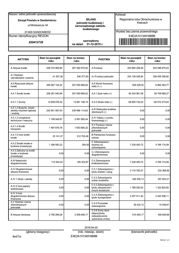 Nazwa i adres jednostki sprawozdawczej BILANS jednostki budżetowej i samorządowego zakładu budżetowego Zarząd Powiatu w Sandomierzu ul.Mickiewicza 34 27-600 SANDOMIERZ Numer identyfikacyjny REGON 830413739 AKTYWA A Aktywa trwałe na dzień Stan na początek roku sporządzony Adresat: Regionalna Izba Obrachunkowa w Kielcach Wysłać bez pisma przewodniego E4E2A10134916B8B 31-12-2015 r. Stan na koniec roku 259 743 995,80 257 482 670,92 A.I Wartości niematerialne i prawne 41 937,36 A.II Rzeczowe aktywa trwałe A.II.1 Środki trwałe PASYWA Stan na początek roku Stan na koniec roku A Fundusz 253 665 258,49 253 596 875,03 246 377,93 A.I Fundusz jednostki 253 136 028,94 259 459 358,80 259 587 124,22 257 050 969,02 A.II Wynik finansowy netto (+,-) 529 229,55 -5 862 483,77 258 281 040,99 257 050 669,02 A.II.1 Zysk netto (+) 60 334 961,58 59 709 989,27 12 659 076,44 13 061 106,15 A.II.2 Strata netto (-) -59 805 732,03 -65 572 473,04 242 901 597,53 239 956 114,63 A.II.1.3 Urządzenia techniczne i maszyny 1 199 548,97 2 067 065,44 A.II.1.4 Środki transportu 1 487 676,78 1 653 680,32 33 141,27 312 702,48 1 306 083,23 300,00 A.II.1.1 Grunty A.II.1.2 Budynki, lokale i obiekty inżynierii lądowej i wodnej A.II.1.5 Inne środki trwałe A.II.2 Środki trwałe w budowie (inwestycje) A.II.3 Zaliczka na środki trwałe w budowie (inwestycje) A.III Nadwyżka środków obrotowych (-) 0,00 0,00 A.IV Odpisy z wyniku finansowego (-) 0,00 0,00 0,00 0,00 0,00 0,00 A.V Fundusz mienia zlikwidowanych jednostek B Państwowe fundusze celowe C Zobowiązania i rezerwy na zobowiązania 7 238 493,72 4 766 174,58 0,00 0,00 C.I Zobowiązania długoterminowe 114 934,22 185 323,97 C.II Zobowiązania krótkoterminowe 7 238 493,72 4 766 174,58 A.IV Długoterminowe aktywa finansowe 0,00 0,00 C.II.1 Zobowiązania z tytułu dostaw i usług 2 110 783,37 232 368,56 A.IV.1 Akcje i udziały 0,00 0,00 C.II.2 Zobowiązania wobec budżetów 326 206,13 297 803,21 A.IV.2 Inne papiery wartościowe 0,00 0,00 1 789 520,53 1 323 824,92 0,00 0,00 C.II.4 Zobowiązania z tytułu wynagrodzeń 2 457 011,40 2 440 296,11 0,00 0,00 C.II.5 Pozostałe zobowiązania 39 432,12 15 046,61 515 540,17 456 829,69 A.III Należności długoterminowe A.IV.3 Inne długoterminowe aktywa finansowe A.V Wartość mienia zlikwidowanych jednostek B Aktywa obrotowe BeSTia 2 795 289,28 (główny księgowy) 2 509 648,17 C.II.3 Zobowiązania z tytułu ubezpieczeń i innych świadczeń C.II.6 Sumy obce (depozytowe, zabezpieczenie wykonania umów) 2016-04-20 (rok, miesiąc, dzień) E4E2A10134916B8B 0,00 0,00 (kierownik jednostki) Strona 1 z 4 B.I Zapasy 425 759,80 361 754,58 B.I.1 Materiały 421 038,70 357 033,48 0,00 0,00 4 721,10 4 721,10 0,00 0,00 B.I.2 Półprodukty i produkty w toku B.I.3 Produkty gotowe B.I.4 Towary B.II Należności krótkoterminowe 1 374 305,92 B.II.1 Należności z tytułu dostaw i usług B.II.2 Należności od budżetów B.II.3 Należności z tytułu ubezpieczeń i innych świadczeń B.II.4 Pozostałe należności 1 697,37 0,00 0,00 0,00 0,00 0,00 1 372 608,55 B.II.5 Rozliczenia z tytułu środków na wydatki budżetowe i z tytułu dochodów budżetowych 1 247 829,87 0,00 995 223,56 900 063,72 0,00 0,00 964 377,73 899 075,94 0,00 0,00 B.III.4 Inne środki pieniężne 0,00 0,00 B.III.5 Akcje lub udziały 0,00 0,00 B.III.6 Inne papiery wartościowe 0,00 0,00 30 845,83 987,78 0,00 0,00 B.III.1 Środki pieniężne w kasie B.III.2 Środki pieniężne na rachunkach bankowych B.III.3 Środki pieniężne państwowego funduszu celowego B.III.7 Inne krótkoterminowe aktywa finansowe B.IV Rozliczenia międzyokresowe Suma aktywów 262 539 285,08 C.III Rezerwy na zobowiązania 0,00 5,48 0,00 0,00 D Fundusze specjalne 1 520 598,65 1 443 945,51 D.1 Zakładowy Fundusz Świadczeń Socjalnych 1 520 598,65 1 443 945,51 D.2 Inne fundusze E Rozliczenia międzyokresowe E.I Rozliczenia międzyokresowe przychodów E.II Inne rozliczenia międzyokresowe 0,00 0,00 114 934,22 185 323,97 114 934,22 185 323,97 0,00 0,00 1 247 829,87 0,00 B.III Krótkoterminowe aktywa finansowe C.II.7 Rozliczenia z tytułu środków na wydatki budżetowe i z tytułu dochodów budżetowych 259 992 319,09 Suma pasywów 262 539 285,08 259 992 319,09 A. Objaśnienie - wykazane w bilansie wartości aktywów trwałych i obrotowych są pomniejszone odpowiednio o umorzenie i odpisy aktualizujące. B. Informacje uzupełniające istotne dla rzetelności i przejrzystości sytuacji finansowej i majątkowej: BeSTia (główny księgowy) 2016-04-20 (rok, miesiąc, dzień) E4E2A10134916B8B (kierownik jednostki) Strona 2 z 4 1 2 3 4 5 6 7 8 Symbol BeSTia Opis Umorzenie wartości niematerialnych i prawnych Umorzenie środków trwałych Umorzenie pozostałych środków trwałych Odpisy aktualizujące środki trwałe Odpisy aktualizujące środki trwałe w budowie Odpisy aktualizujące wartości niematerialne i prawne Odpisy aktualizujące należności Umorzenie księgozbioru (główny księgowy) 2016-04-20 (rok, miesiąc, dzień) E4E2A10134916B8B Wartość 396 636,00 36 522 780,72 9 425 524,76 0,00 0,00 0,00 86 711,24 32 620,44 (kierownik jednostki) Strona 3 z 4 Wyjaśnienia do bilansu BeSTia (główny księgowy) 2016-04-20 (rok, miesiąc, dzień) E4E2A10134916B8B (kierownik jednostki) Strona 4 z 4