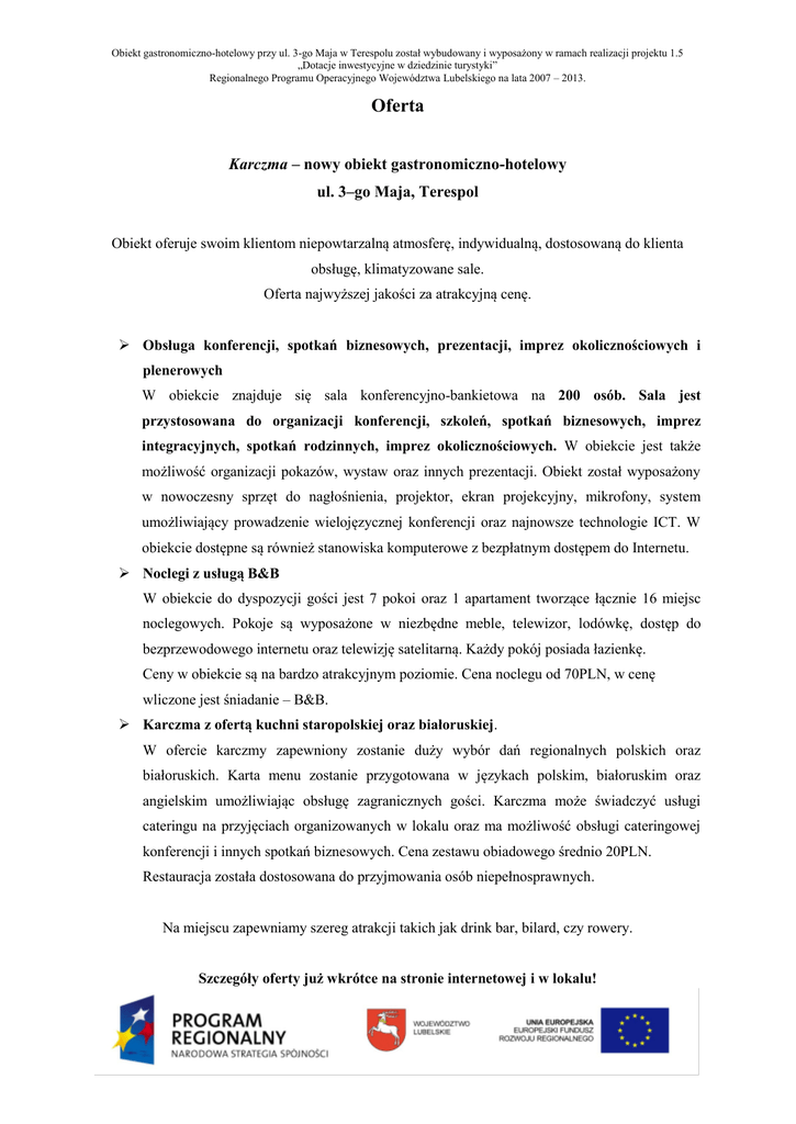 Obiekt gastronomiczno-hotelowy przy ul. 3-go Maja w Terespolu został wybudowany i wyposażony w ramach realizacji projektu 1.5 „Dotacje inwestycyjne w dziedzinie turystyki” Regionalnego Programu Operacyjnego Województwa Lubelskiego na lata 2007 – 2013. Oferta Karczma – nowy obiekt gastronomiczno-hotelowy ul. 3–go Maja, Terespol Obiekt oferuje swoim klientom niepowtarzalną atmosferę, indywidualną, dostosowaną do klienta obsługę, klimatyzowane sale. Oferta najwyższej jakości za atrakcyjną cenę. Obsługa konferencji, spotkań biznesowych, prezentacji, imprez okolicznościowych i plenerowych W obiekcie znajduje się sala konferencyjno-bankietowa na 200 osób. Sala jest przystosowana do organizacji konferencji, szkoleń, spotkań biznesowych, imprez integracyjnych, spotkań rodzinnych, imprez okolicznościowych. W obiekcie jest także możliwość organizacji pokazów, wystaw oraz innych prezentacji. Obiekt został wyposażony w nowoczesny sprzęt do nagłośnienia, projektor, ekran projekcyjny, mikrofony, system umożliwiający prowadzenie wielojęzycznej konferencji oraz najnowsze technologie ICT. W obiekcie dostępne są również stanowiska komputerowe z bezpłatnym dostępem do Internetu. Noclegi z usługą B&B W obiekcie do dyspozycji gości jest 7 pokoi oraz 1 apartament tworzące łącznie 16 miejsc noclegowych. Pokoje są wyposażone w niezbędne meble, telewizor, lodówkę, dostęp do bezprzewodowego internetu oraz telewizję satelitarną. Każdy pokój posiada łazienkę. Ceny w obiekcie są na bardzo atrakcyjnym poziomie. Cena noclegu od 70PLN, w cenę wliczone jest śniadanie – B&B. Karczma z ofertą kuchni staropolskiej oraz białoruskiej. W ofercie karczmy zapewniony zostanie duży wybór dań regionalnych polskich oraz białoruskich. Karta menu zostanie przygotowana w językach polskim, białoruskim oraz angielskim umożliwiając obsługę zagranicznych gości. Karczma może świadczyć usługi cateringu na przyjęciach organizowanych w lokalu oraz ma możliwość obsługi cateringowej konferencji i innych spotkań biznesowych. Cena zestawu obiadowego średnio 20PLN. Restauracja została dostosowana do przyjmowania osób niepełnosprawnych. Na miejscu zapewniamy szereg atrakcji takich jak drink bar, bilard, czy rowery. Szczegóły oferty już wkrótce na stronie internetowej i w lokalu!