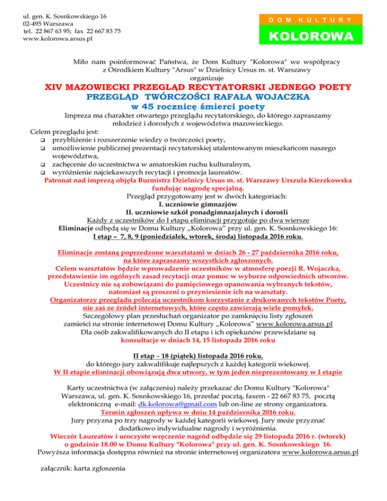 ul. gen. K. Sosnkowskiego 16 02-495 Warszawa tel. 22 867 63 95; fax 22 667 83 75 www.kolorowa.arsus.pl D O M K U L T U R Y KOLOROWA Miło nam poinformować Państwa, że Dom Kultury "Kolorowa" we współpracy z Ośrodkiem Kultury "Arsus" w Dzielnicy Ursus m. st. Warszawy organizuje XIV MAZOWIECKI PRZEGLĄD RECYTATORSKI JEDNEGO POETY PRZEGLĄD TWÓRCZOŚCI RAFAŁA WOJACZKA w 45 rocznicę śmierci poety Impreza ma charakter otwartego przeglądu recytatorskiego, do którego zapraszamy młodzież i dorosłych z województwa mazowieckiego. Celem przeglądu jest: przybliżenie i rozszerzenie wiedzy o twórczości poety, umożliwienie publicznej prezentacji recytatorskiej utalentowanym mieszkańcom naszego województwa, zachęcenie do uczestnictwa w amatorskim ruchu kulturalnym, wyróżnienie najciekawszych recytacji i promocja laureatów. Patronat nad imprezą objęła Burmistrz Dzielnicy Ursus m. st. Warszawy Urszula Kierzkowska fundując nagrodę specjalną. Przegląd przygotowany jest w dwóch kategoriach: I. uczniowie gimnazjów II. uczniowie szkół ponadgimnazjalnych i dorośli Każdy z uczestników do I etapu eliminacji przygotuje po dwa wiersze Eliminacje odbędą się w Domu Kultury „Kolorowa” przy ul. gen. K. Sosnkowskiego 16: I etap – 7, 8, 9 (poniedziałek, wtorek, środa) listopada 2016 roku. Eliminacje zostaną poprzedzone warsztatami w dniach 26 - 27 października 2016 roku, na które zapraszamy wszystkich zgłoszonych. Celem warsztatów będzie wprowadzenie uczestników w atmosferę poezji R. Wojaczka, przedstawienie im ogólnych zasad recytacji oraz pomoc w wyborze odpowiednich utworów. Uczestnicy nie są zobowiązani do pamięciowego opanowania wybranych tekstów, natomiast są proszeni o przyniesienie ich na warsztaty. Organizatorzy przeglądu polecają uczestnikom korzystanie z drukowanych tekstów Poety, nie zaś ze źródeł internetowych, które często zawierają wiele pomyłek. Szczegółowy plan przesłuchań organizator po zamknięciu listy zgłoszeń zamieści na stronie internetowej Domu Kultury „Kolorowa” www.kolorowa.arsus.pl Dla osób zakwalifikowanych do II etapu i ich opiekunów przewidziane są konsultacje w dniach 14, 15 listopada 2016 roku II etap – 18 (piątek) listopada 2016 roku, do którego jury zakwalifikuje najlepszych z każdej kategorii wiekowej. W II etapie eliminacji obowiązują dwa utwory, w tym jeden nieprezentowany w I etapie Karty uczestnictwa (w załączeniu) należy przekazać do Domu Kultury "Kolorowa" Warszawa, ul. gen. K. Sosnkowskiego 16, przesłać pocztą, faxem - 22 667 83 75, pocztą elektroniczną e-mail: [email protected] lub on-line ze strony organizatora. Termin zgłoszeń upływa w dniu 14 października 2016 roku. Jury przyzna po trzy nagrody w każdej kategorii wiekowej. Jury może przyznać dodatkowo indywidualne nagrody i wyróżnienia. Wieczór Laureatów i uroczyste wręczenie nagród odbędzie się 29 listopada 2016 r. (wtorek) o godzinie 18.00 w Domu Kultury "Kolorowa" przy ul. gen. K. Sosnkowskiego 16. Powyższa informacja dostępna również na stronie internetowej organizatora www.kolorowa.arsus.pl załącznik: karta zgłoszenia XIV MAZOWIECKI PRZEGLĄD RECYTATORSKI JEDNEGO POETY PRZEGLĄD TWÓRCZOŚCI RAFAŁA WOJACZKA w 45 rocznicę śmierci poety DZIELNICA URSUS m.st. WARSZAWY DOM KULTURY „KOLOROWA” LISTOPAD 2016 KARTA ZGŁOSZENIA PROSIMY WYPEŁNIĆ PISMEM DRUKOWANYM Nazwa placówki zgłaszającej (adres, telefon/fax/e-mail) .................................................................................... .................................................................................... .................................................................................... .................................................................................... Imię i nazwisko .................................................................................... .................................................................................... Kategoria wiekowa (proszę odpowiednio zaznaczyć) I. uczniowie gimnazjów II. uczniowie szkół ponadgimnazjalnych i dorośli I etap eliminacji Tytuły utworów I etap eliminacji Każdy wybiera dwa wiersze II etap eliminacji Obowiązują: dwa utwory, w tym jeden nieprezentowany w I etapie 1..................................................................................................................... ....................................................................................................................... 2..................................................................................................................... ....................................................................................................................... II etap eliminacji 1……………………………………………………………………………. ……………………………………………………………………………... 2……………………………………………………………………………. ……………………………………………………………………………... OŚWIADCZENIE: Akceptuję warunki PRZEGLĄDU RECYTATORSKIEGO JEDNEGO POETY i wyrażam zgodę na przetwarzanie moich danych osobowych zgodnie z ustawą z dnia 29 sierpnia 1997 r. o ochronie danych osobowych. Jednocześnie wyrażam zgodę na fotografowanie, filmowanie bądź inną rejestrację przebiegu konkursu oraz ewentualną późniejszą eksploatację zarejestrowanego materiału (TV, prasa, internet itp.). Podpis i pieczątka Placówki zgłaszającej Karty niedokładnie i nieczytelnie wypełnione nie będą uwzględnione ! D O M K U L T U R Y „ K O L O R O W A” 02 – 495 Warszawa, ul. gen. K. Sosnkowskiego 16 tel. 22 867 63 95, fax 22 667 83 75 www.kolorowa.arsus.pl e-mail: [email protected]