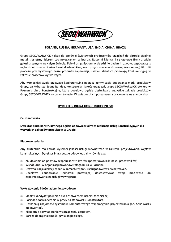 POLAND, RUSSIA, GERMANY, USA, INDIA, CHINA, BRAZIL Grupa SECO/WARWICK należy do czołówki światowych producentów urządzeń do obróbki cieplnej metali. Jesteśmy liderem technologicznym w branży. Naszymi klientami są czołowe firmy z wielu gałęzi przemysłu na całym świecie. Dzięki osiągnięciom w dziedzinie badań i rozwoju, współpracy z najbardziej uznanymi ośrodkami akademickimi, oraz przystosowaniu do nowej (oszczędnej) filozofii procesu przemysłowego nasze produkty zapewniają naszym klientom przewagę konkurencyjną w zakresie procesów wytwórczych. Aby wzmacniać swoją przewagę konkurencyjną poprzez kontynuację budowania marki produktów Grupy, za którą stoi jednolita idea, konstrukcja i jakość urządzeń, grupa SECO/WARWICK otwiera w Poznaniu biuro konstrukcyjne, które docelowo będzie obsługiwało wszystkie zakłady produktów Grupy SECO/WARWICK na całym świecie. W związku z tym poszukujemy pracownika na stanowisko: DYREKTOR BIURA KONSTRUKCYJNEGO Cel stanowiska Dyrektor biura konstrukcyjnego będzie odpowiedzialny za realizację usług konstrukcyjnych dla wszystkich zakładów produktów w Grupie. Kluczowe zadania Aby skutecznie realizować wysokiej jakości usługi wewnętrzne w zakresie projektowania węzłów konstrukcyjnych Dyrektor Biura będzie odpowiedzialny również za: • • • • Zbudowanie od podstaw zespołu konstruktorów (początkowo kilkunastu pracowników). Współudział w organizacji nowopowstałego biura w Poznaniu. Optymalizacja alokacji zadań w ramach zespołu i usługodawców zewnętrznych. Docelowo zbudowanie jednostki potrafiącej dostosowywać swoje możliwości zapotrzebowania na usługi wewnętrzne. do Wykształcenie i doświadczenie zawodowe • • • • • Idealny kandydat powinien być absolwentem uczelni technicznej. Posiadać doświadczenie w pracy na stanowisku konstruktora. Doskonałą znajomość systemów komputerowego wspomagania projektowania (np. SolidWorks lub Inventor). Kilkuletnie doświadczenie w zarządzaniu zespołem. Bardzo dobrą znajomość języka angielskiego. • Doświadczenie we współpracy z zespołami międzynarodowymi będzie dużym atutem. Umiejętności interpersonalne Współpraca z dyrektorami zakładów produktów na całym świecie wymaga od Dyrektora Biura: • • • • • Doskonałych umiejętności komunikacyjnych, elastyczności. Zdolności do poszukiwania kompromisu i rozwiązania najlepszego dla wszystkich interesariuszy. Zdolności negocjacyjnych. Rozumienia różnić międzykulturowych i umiejętności adekwatnego dostosowania swoich działań. Umiejętności motywowania i rozwijania podległego zespołu. Oferujemy Praca w SECO/WARWICK umożliwia: • Współpracę ze specjalistami i menedżerami ze wszystkich jednostek Grupy (ponad 1000 pracowników na całym świecie). • Pracę z najnowszymi i unikalnymi w globalnej skali rozwiązaniami technicznymi. • Udział w projektowaniu nowatorskich i dostosowanych do indywidualnych potrzeb klienta urządzeń. W naszej firmie: • Przedsiębiorczość i innowacyjność należą do kluczowych wartości. • Menedżerowie cieszą się odpowiednio dużym poziomem niezależności. • Decyzje podejmowane są sprawnie. • Od każdego pracownika oczekujemy wpływania na przyszły kształt organizacji. Wynagrodzenie uzależnione od wyników Grupy SECO/WARWICK oraz rezultatów indywidualnych. Lokalizacja: Poznań Prosimy o wysyłanie CV na adres: [email protected] Odpowiemy tylko na wybrane aplikacje. http://www.secowarwick.com.pl/ Prosimy o załączenie następującego oświadczenia: „Wyrażam zgodę na przetwarzanie moich danych osobowych zawartych w mojej ofercie pracy, przez SECO/WARWICK S. A. dla potrzeb niezbędnych do realizacji procesu rekrutacji (zgodnie z ustawą z dn. 29.08.1997 o Ochronie Danych Osobowych Dz.U. z 2002 r. Nr 101, poz. 926 z późn. zm.).”