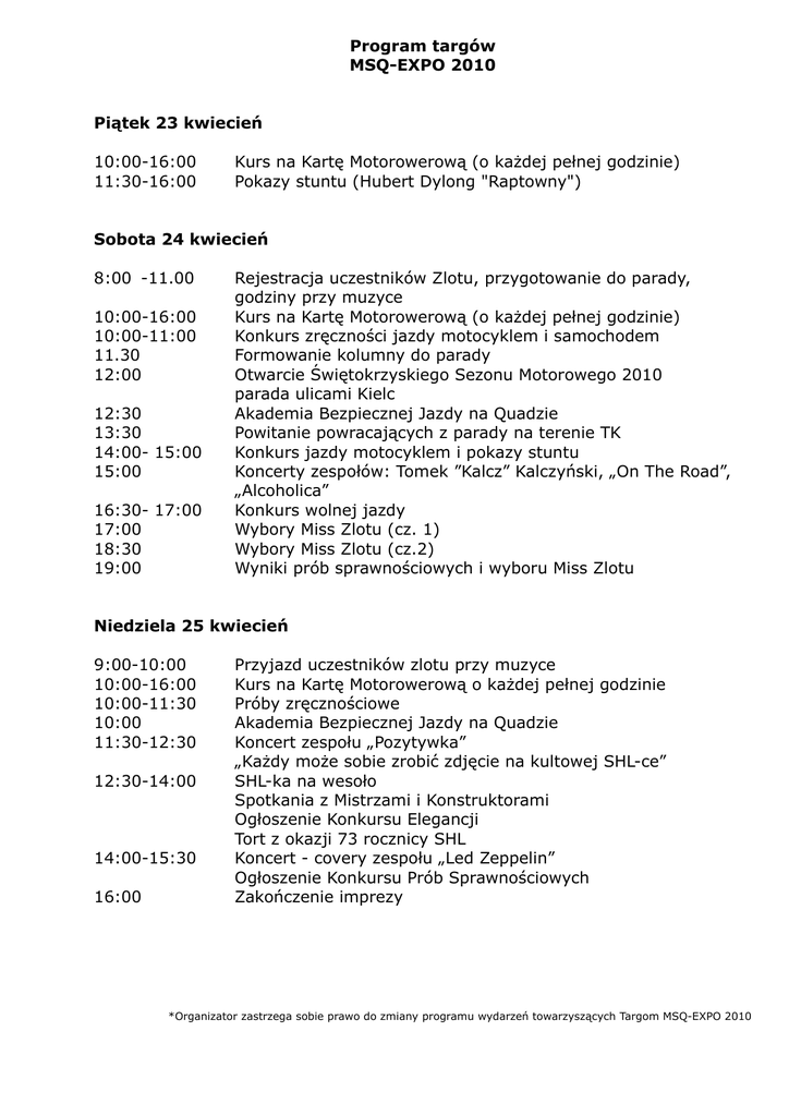Program targów MSQ-EXPO 2010 Piątek 23 kwiecień 10:00-16:00 11:30-16:00 Kurs na Kartę Motorowerową (o każdej pełnej godzinie) Pokazy stuntu (Hubert Dylong "Raptowny") Sobota 24 kwiecień 8:00 -11.00 10:00-16:00 10:00-11:00 11.30 12:00 12:30 13:30 14:00- 15:00 15:00 16:30- 17:00 17:00 18:30 19:00 Rejestracja uczestników Zlotu, przygotowanie do parady, godziny przy muzyce Kurs na Kartę Motorowerową (o każdej pełnej godzinie) Konkurs zręczności jazdy motocyklem i samochodem Formowanie kolumny do parady Otwarcie Świętokrzyskiego Sezonu Motorowego 2010 parada ulicami Kielc Akademia Bezpiecznej Jazdy na Quadzie Powitanie powracających z parady na terenie TK Konkurs jazdy motocyklem i pokazy stuntu Koncerty zespołów: Tomek ”Kalcz” Kalczyński, „On The Road”, „Alcoholica” Konkurs wolnej jazdy Wybory Miss Zlotu (cz. 1) Wybory Miss Zlotu (cz.2) Wyniki prób sprawnościowych i wyboru Miss Zlotu Niedziela 25 kwiecień 9:00-10:00 10:00-16:00 10:00-11:30 10:00 11:30-12:30 12:30-14:00 14:00-15:30 16:00 Przyjazd uczestników zlotu przy muzyce Kurs na Kartę Motorowerową o każdej pełnej godzinie Próby zręcznościowe Akademia Bezpiecznej Jazdy na Quadzie Koncert zespołu „Pozytywka” „Każdy może sobie zrobić zdjęcie na kultowej SHL-ce” SHL-ka na wesoło Spotkania z Mistrzami i Konstruktorami Ogłoszenie Konkursu Elegancji Tort z okazji 73 rocznicy SHL Koncert - covery zespołu „Led Zeppelin” Ogłoszenie Konkursu Prób Sprawnościowych Zakończenie imprezy *Organizator zastrzega sobie prawo do zmiany programu wydarzeń towarzyszących Targom MSQ-EXPO 2010