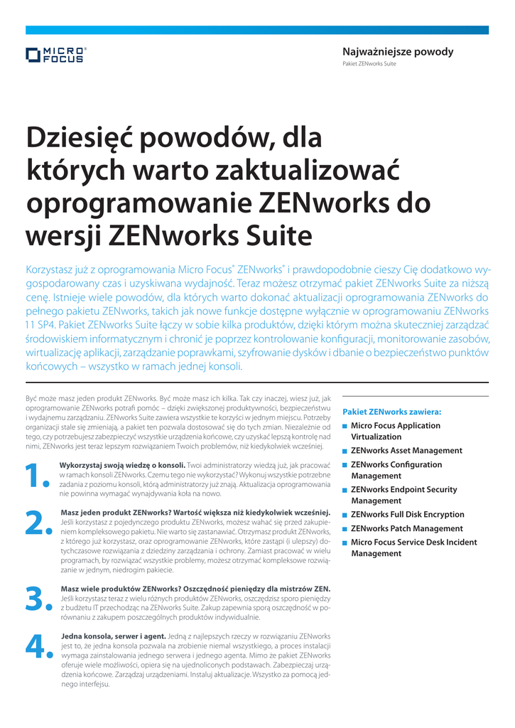 Najważniejsze powody Pakiet ZENworks Suite Dziesięć powodów, dla których warto zaktualizować oprogramowanie ZENworks do wersji ZENworks Suite Korzystasz już z oprogramowania Micro Focus® ZENworks® i prawdopodobnie cieszy Cię dodatkowo wygospodarowany czas i uzyskiwana wydajność. Teraz możesz otrzymać pakiet ZENworks Suite za niższą cenę. Istnieje wiele powodów, dla których warto dokonać aktualizacji oprogramowania ZENworks do pełnego pakietu ZENworks, takich jak nowe funkcje dostępne wyłącznie w oprogramowaniu ZENworks 11 SP4. Pakiet ZENworks Suite łączy w sobie kilka produktów, dzięki którym można skuteczniej zarządzać środowiskiem informatycznym i chronić je poprzez kontrolowanie konfiguracji, monitorowanie zasobów, wirtualizację aplikacji, zarządzanie poprawkami, szyfrowanie dysków i dbanie o bezpieczeństwo punktów końcowych – wszystko w ramach jednej konsoli. Być może masz jeden produkt ZENworks. Być może masz ich kilka. Tak czy inaczej, wiesz już, jak oprogramowanie ZENworks potrafi pomóc – dzięki zwiększonej produktywności, bezpieczeństwu i wydajnemu zarządzaniu. ZENworks Suite zawiera wszystkie te korzyści w jednym miejscu. Potrzeby organizacji stale się zmieniają, a pakiet ten pozwala dostosować się do tych zmian. Niezależnie od tego, czy potrzebujesz zabezpieczyć wszystkie urządzenia końcowe, czy uzyskać lepszą kontrolę nad nimi, ZENworks jest teraz lepszym rozwiązaniem Twoich problemów, niż kiedykolwiek wcześniej. 1. 2. 3. 4. Pakiet ZENworks zawiera: Micro Focus Application Virtualization ZENworks Asset Management ykorzystaj swoją wiedzę o konsoli. Twoi administratorzy wiedzą już, jak pracować W w ramach konsoli ZENworks. Czemu tego nie wykorzystać? Wykonuj wszystkie potrzebne zadania z poziomu konsoli, którą administratorzy już znają. Aktualizacja oprogramowania nie powinna wymagać wynajdywania koła na nowo. ZENworks Configuration Management asz jeden produkt ZENworks? Wartość większa niż kiedykolwiek wcześniej. M Jeśli korzystasz z pojedynczego produktu ZENworks, możesz wahać się przed zakupieniem kompleksowego pakietu. Nie warto się zastanawiać. Otrzymasz produkt ZENworks, z którego już korzystasz, oraz oprogramowanie ZENworks, które zastąpi (i ulepszy) dotychczasowe rozwiązania z dziedziny zarządzania i ochrony. Zamiast pracować w wielu programach, by rozwiązać wszystkie problemy, możesz otrzymać kompleksowe rozwiązanie w jednym, niedrogim pakiecie. ZENworks Full Disk Encryption asz wiele produktów ZENworks? Oszczędność pieniędzy dla mistrzów ZEN. M Jeśli korzystasz teraz z wielu różnych produktów ZENworks, oszczędzisz sporo pieniędzy z budżetu IT przechodząc na ZENworks Suite. Zakup zapewnia sporą oszczędność w porównaniu z zakupem poszczególnych produktów indywidualnie. J edna konsola, serwer i agent. Jedną z najlepszych rzeczy w rozwiązaniu ZENworks jest to, że jedna konsola pozwala na zrobienie niemal wszystkiego, a proces instalacji wymaga zainstalowania jednego serwera i jednego agenta. Mimo że pakiet ZENworks oferuje wiele możliwości, opiera się na ujednoliconych podstawach. Zabezpieczaj urządzenia końcowe. Zarządzaj urządzeniami. Instaluj aktualizacje. Wszystko za pomocą jednego interfejsu. ZENworks Endpoint Security Management ZENworks Patch Management Micro Focus Service Desk Incident Management „Żaden inny dostawca nie oferuje tego wszystkiego, co otrzymaliśmy w ramach jednego pakietu ZENworks firmy Novell (będącej obecnie częścią firmy Micro Focus) – i co więcej, ZENworks współpracuje ze wszystkimi systemami”. Dan Allensworth Menedżer ds. infrastruktury. Johnsonville Sausage 5. 6. 7. 8. 9. iększa kompatybilność niż kiedykolwiek wcześniej. W ewolucji systemów i platW form zmianom ulegają także systemy, z którymi współpracuje ZENworks. Dzięki nowo dodanemu wsparciu dla baz danych, takich jak Oracle i inne oraz dla systemów operacyjnych, takich jak SUSE Linux Enterprise Server 11, Windows 2012, Windows 8 oraz Red Hat Enterprise Linux, zyskujesz większą elastyczność niż kiedykolwiek wcześniej. ZENworks będzie współpracować z posiadanym oprogramowaniem i dotrzyma kroku rozrastającemu się środowisku. owa obsługa treści wielostrefowych. Jeśli korzystasz z więcej niż jednego środowiska N ZENworks, przykładowo w laboratorium i strefie produkcyjnej, ZENworks 11 SP4 umożliwia udostępnianie pakietów i reguł w kilku strefach. Nie musisz odtwarzać reguł i pakietów w drugim, trzecim czy czwartym środowisku. Pozwól, by ze sobą współpracowały. dalne zarządzanie za pomocą serwera proxy. Użytkownik jest w domu, Ty musisz Z jednak uzyskać dostęp do jego lub jej urządzeń. ZENworks umożliwia uzyskanie dostępu za pośrednictwem serwera proxy, pozwalając na zdalne zarządzanie urządzeniem użytkownika z domu, hotelu lub dowolnego innego miejsca. epsza kontrola niż kiedykolwiek wcześniej. W odróżnieniu od wielu konkurenL cyjnych produktów, ZENworks umożliwia przeprowadzanie wszelkich potrzebnych audytów, które mogą być szczególnie potrzebne w mocno sformalizowanych branżach. Z jego pomocą możesz śledzić zdalny dostęp, zapisywanie plików na dyskach przenośnych oraz zmiany dokonywane w konsoli zarządzania. Dzięki ZENworks możesz łatwo dowieść przestrzegania przepisów podczas audytu. ozwiązanie serwisowe z certyfikatem ITIL. W odR różnieniu od poprzednich pakietów ZENworks, pakiet ZENworks Suite zawiera oprogramowanie Service Desk Incident Management. Rozwiązanie to ma certyfikat PinkVERIFY dla dziesięciu procesów ITIL. To coś więcej niż tylko pomoc techniczna. Wdrażaj takie procesy, jak zarządzanie zmianami, zarządzanie problemami czy realizacja żądań. Spraw, by obsługa problemów IT osiągnęła poziom wymagany w Twojej organizacji. 10. oprawione skalowanie i wydajność, by lepiej spełniać potrzeby. Wynieśliśmy P możliwości skal