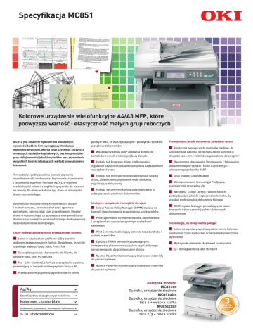 Specyfikacja MC851 Kolorowe urządzenie wielofunkcyjne A4/A3 MFP, które podwyższa wartość i elastyczność małych grup roboczych MC851 jest idealnym wyborem dla świadomych wysokości budżetu firm wymagających niższego wolumenu wydruków. Można teraz uzyskiwać korzyści z mniejszych nakładów kapitałowych, bez kompromisów przy stałej wysokiej jakości wydruków oraz zapewnieniu wszystkich korzyści dodających wartość prowadzonemu biznesowi. poczty e-mail, co oszczędza papier i podwyższa szybkość przepływu dokumentów Profesjonalna jakość dokumentu za każdym razem g Wbudowany serwis LDAP zapewnia dostęp do kontaktów i e-maili z istniejącej bazy danych 4 podajników papieru; od formatu A6 do banerów o długości 1200 mm i nośników o gramaturze do 200g/m2 g Funkcja Job Programs dzięki zdefiniowaniu g Dwustronne skanowanie / kopiowanie / faksowanie regularnie używanych ustawień umożliwia użytkownikom oszczędność czasu dokumentów jest szybkie i łatwe z użyciem 50 – arkuszowego podajnika RADF Ten wydajny i godny zaufania produkt zapewnia wszechstronność drukowania, kopiowania, skanowania i faksowania w pełnym formacie A4/A3, w wysokiej rozdzielczości koloru i z prędkością wydruku do 22 stron na minutę dla druku w kolorze i 34 stron na minutę dla druku czarno-białego. g Funkcja Job Interrupt czasowo wstrzymuje kolejkę g Druk Dupleks jako standard druku, dzięki czemu użytkownik może drukować najpilniejsze dokumenty g Wielopoziomowa technologia ProQ2400, Zdolność do druku na różnych materiałach, dużych i małych oznacza, że można drukować zgodnie z potrzebami, ograniczając czas przygotowania i koszty druku w outsourcingu, co podwyższa efektywność oraz dostarczając narzędzia do samodzielnego druku większej ilości dokumentów biznesowych. Intuicyjne zarządzanie i narzędzia sterujące Cechy podwyższające wartość prowadzonego biznesu g Print Control umożliwiający kontrolę kosztów druku i g Oszczędzające czas skanowanie: do klienta, do poczty e-mail, sieci PC lub USB g Fax – jako standard, z funkcja oszczędzania papieru, pozwalającą na bezpośrednie wysyłania faksu z PC g Przekazywanie przychodzących faksów na konto a Szeroki zakres obsługiwanych nośników a Kolorowe, czarno-białe a a g PrintSuperVision do monitorowania, raportowania i zarządzania w czasie rzeczywistym drukarkami sieciowymi zużycia materiałów g Zgodny z TWAIN sterownik pozwalający na zintegrowane skanowanie z użyciem zagnieżdżonego oprogramowania do przetwarzanie obrazu Technologia, na której można polegać g Łatwe do wymiany wysokowydajne tonery kolorowe (wydajność 7 300 wydruków) i czarny (wydajność 7 000 wydruków) g Wytrzymałe elementy składowe i rozwiązania g 3 – letnia gwarancja jako standard g Nuance PaperPort konwertujący drukowane materiały do postaci cyfrowej g Nuance PaperPort konwertujący drukowane materiały do postaci cyfrowej Dostępne modele: MC851dn Dupleks, urządzenie sieciowe MC851cdtn Dupleks, urządzenie sieciowe taca 2 + wysoka szafka MC851cdxn Dupleks, urządzenie sieciowe taca 2/3 + niska szafka O JESTRACJI RE N LATA GWARANCJI ok w. 1- 10 użytkowników tworzenie i druk szerokiej palety użytecznych dokumentów ww Drukowanie, kopiowanie, skanowanie i faksowaniea kontroli i monitorowania praw dostępu użytkowników g OKI Template Manager pozwalający na łatwe A A4/A3 g Colour Access Policy Manager (CAPM) służący do g Narzędzia Colour Correct i Colour Swatch podwyższające jakość i dopasowanie kolorów, by uzyskać profesjonalne dokumenty biurowe ra ncj a wyborem zaawansowanych funkcji. Dodatkowo, przyciski szybkiego wyboru: Copy, Scan, Print i Fax zabezpieczenie poufnych dokumentów rozdzielczość 1200 x 600 dpi P g Łatwy w użyciu ekran graficzny LCD z prostym g Funkcja Secure Print kodująca dane pozwala na g Elastyczna obsługa wielu formatów mediów: do a i.co m.pl/gw MC851 – kolorowe i czarno-białe urządzenie wielofunkcyjne Drukarka Informacje dla użytkownika – funkcje podstawowe A4: 22 str./min w kolorze, 34 str./min czarno-białych; A3: 12 str./min w Prędkość wydruku kolorze, 17 str./min czarno-białych Standardowy RAM: 512MB (2 x 256MB); Pamięć Maksymalny RAM: 768MB (1 x 256MB, 1 x 512MB) Czas pierwszego wydruku 11,5 s w kolorze, 9,5 sekundy w przypadku wydruków czarno-białych Standardowy dysk twardy: 40GB Czas nagrzewania Najwyżej 90 sekund od momentu włączenia Temperatura do pracy/wilgotność: od 10°C do 32°C (zalecana: od 17°C do 27°C) / wilgotność względna od 20% do 80% (zalecana od 50% do Warunki pracy 70%) Temperatura / wilgotność przechowania produktu: od -10°C do 43°C / wilgotność względna od 10% do 90% Szybkość procesora PowerPC750 500MHz Interfejs i oprogramowanie Interfejsy Szybkie złącze USB, 10/100-TX Ethernet, Parallel Port Języki drukarki PCL5c, PCL62; PostScript (Windows/Mac) Zasilanie Prąd zmienny, jednofazowy, od 220 do 240V, częst. 50/60Hz + / - 2% 10Base-T/100Base-TX obsługiwane za pomocą karty Ethernet z wewnętrznym serwerem druku i karta sieciowa z możliwością wprowadzania ustawień i zarządzania. Obejmuje: POP3/APOP i klienta poczty SMTP do obsługi zadań druku i ostrzeżeń. Obsługiwane wszystkie główne protokoły sieciowe: TCP/IP:- ARP, RARP, IPv4/v6, ICMPv4/v6, TCP, UDP, LPR, FTP, TELNET, HTTP(IPP), BOOTP, DHCP, Sieć oraz protokoły SNMPv1/v3, DNS, DDNS, UPnP, Bonjour, WINS, SSL/TLS, SMTP, POP3, SNTP, WSDPrint, protokoły JetDirect, NetBIOSoverTCP, Kerberos. NetWare 3.x, 4.x, 5.x i 6 z pełnym NDS i obsługą NDPS:- PServer, Rprinter, NDPS obsługiwane przez dedykowaną bramkę OKI NDPS. Ethertalk:- ELAP, AARP, DDP, AEP, NBP, ZIP, RTMP, ATP, PAP. NetBEUI:SMB, NetBIOS. Inne:- EAP. Zużycie energii Typowe: 700W, maksymalne: 1300W, gdy urządzenie nie drukuje: 160W, Oszczędzanie energii: < 25 W Poziom hałasu Przy pracy: 54dB(A) lub mniej; Czuwanie: 37dB(A) lub mniej; Oszczędzanie energii: Poziom