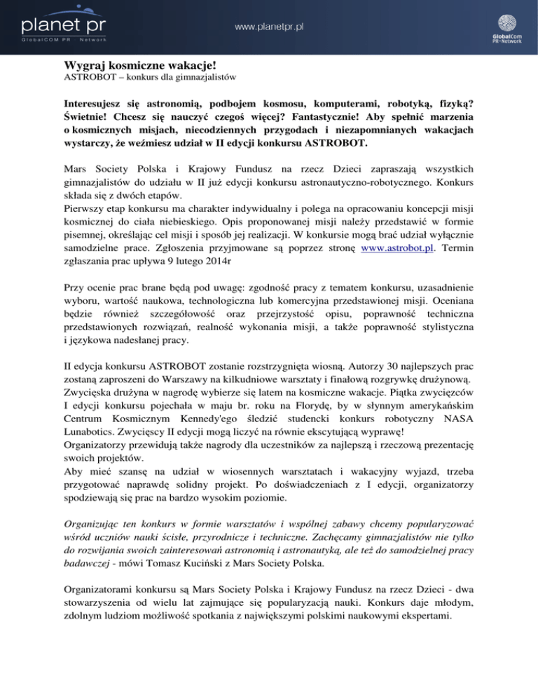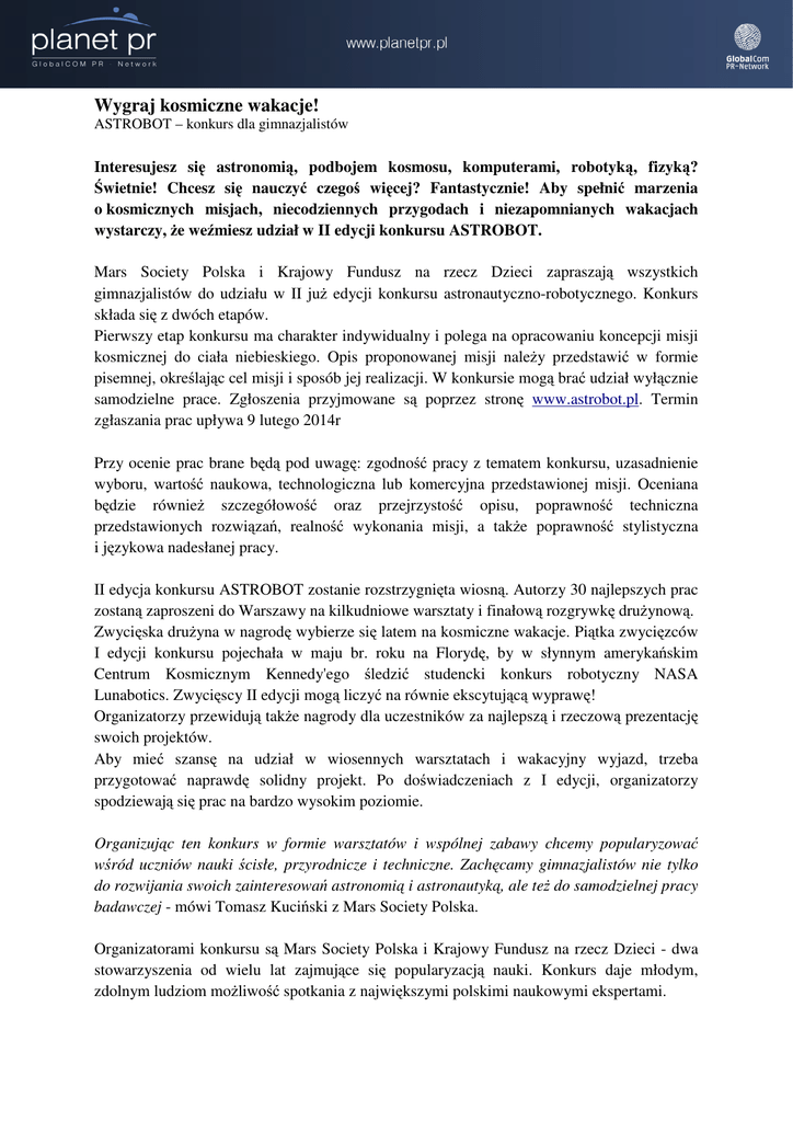 Wygraj kosmiczne wakacje! ASTROBOT – konkurs dla gimnazjalistów Interesujesz się astronomią, podbojem kosmosu, komputerami, robotyką, fizyką? Świetnie! Chcesz się nauczyć czegoś więcej? Fantastycznie! Aby spełnić marzenia o kosmicznych misjach, niecodziennych przygodach i niezapomnianych wakacjach wystarczy, że weźmiesz udział w II edycji konkursu ASTROBOT. Mars Society Polska i Krajowy Fundusz na rzecz Dzieci zapraszają wszystkich gimnazjalistów do udziału w II już edycji konkursu astronautyczno-robotycznego. Konkurs składa się z dwóch etapów. Pierwszy etap konkursu ma charakter indywidualny i polega na opracowaniu koncepcji misji kosmicznej do ciała niebieskiego. Opis proponowanej misji należy przedstawić w formie pisemnej, określając cel misji i sposób jej realizacji. W konkursie mogą brać udział wyłącznie samodzielne prace. Zgłoszenia przyjmowane są poprzez stronę www.astrobot.pl. Termin zgłaszania prac upływa 9 lutego 2014r Przy ocenie prac brane będą pod uwagę: zgodność pracy z tematem konkursu, uzasadnienie wyboru, wartość naukowa, technologiczna lub komercyjna przedstawionej misji. Oceniana będzie również szczegółowość oraz przejrzystość opisu, poprawność techniczna przedstawionych rozwiązań, realność wykonania misji, a także poprawność stylistyczna i językowa nadesłanej pracy. II edycja konkursu ASTROBOT zostanie rozstrzygnięta wiosną. Autorzy 30 najlepszych prac zostaną zaproszeni do Warszawy na kilkudniowe warsztaty i finałową rozgrywkę drużynową. Zwycięska drużyna w nagrodę wybierze się latem na kosmiczne wakacje. Piątka zwycięzców I edycji konkursu pojechała w maju br. roku na Florydę, by w słynnym amerykańskim Centrum Kosmicznym Kennedy'ego śledzić studencki konkurs robotyczny NASA Lunabotics. Zwycięscy II edycji mogą liczyć na równie ekscytującą wyprawę! Organizatorzy przewidują także nagrody dla uczestników za najlepszą i rzeczową prezentację swoich projektów. Aby mieć szansę na udział w wiosennych warsztatach i wakacyjny wyjazd, trzeba przygotować naprawdę solidny projekt. Po doświadczeniach z I edycji, organizatorzy spodziewają się prac na bardzo wysokim poziomie. Organizując ten konkurs w formie warsztatów i wspólnej zabawy chcemy popularyzować wśród uczniów nauki ścisłe, przyrodnicze i techniczne. Zachęcamy gimnazjalistów nie tylko do rozwijania swoich zainteresowań astronomią i astronautyką, ale też do samodzielnej pracy badawczej - mówi Tomasz Kuciński z Mars Society Polska. Organizatorami konkursu są Mars Society Polska i Krajowy Fundusz na rzecz Dzieci - dwa stowarzyszenia od wielu lat zajmujące się popularyzacją nauki. Konkurs daje młodym, zdolnym ludziom możliwość spotkania z największymi polskimi naukowymi ekspertami. Kosmos wciąż pozostaje tajemnicą, jest jeszcze wiele pytań, na które nie udało się odpowiedzieć naukowcom. Wyobraźnia młodzieży często wpisuje się w późniejsze naukowe odkrycia. Pomysły przedstawiane przez dzieci i młodzież są zawsze świeże i nowatorskie. Właśnie dlatego tak niezwykle ważne jest zachęcanie uczniów do udziału w projektach związanych z nauką – podkreśla Łukasz Partyka z Krajowego Funduszu na rzecz Dzieci. Więcej informacji na stronie konkursu: www.astrobot.pl Mars Society Polska (www.marssociety.pl) jest stowarzyszeniem zarejestrowanym w 1999 roku, oddziałem stowarzyszenia The Mars Society. Głównym celem jest promowanie idei eksploracji i badań kosmosu, a w szczególności Marsa. Organizacja skupia specjalistów z dziedziny astronautyki (takich jak Robert Zubrin, Buzz Aldrin), naukowców, filmowców (np. James Cameron), pisarzy (Kim Stanley Robinson), entuzjastów – wszystkich, którzy dzielą wizję obecności człowieka na Marsie. Krajowy Fundusz na rzecz Dzieci (www.fundusz.org) to stowarzyszenie naukowców, twórców, lekarzy i studentów, pracujące od 30 lat z utalentowanymi uczniami. Uczeni z wieloletnim stażem i imponującym dorobkiem uczestniczą w pracach Funduszu jako wolontariusze. Organizacja prowadzi obozy naukowe, warsztaty, indywidualne staże badawcze, spotkania, koncerty i wystawy dla zdolnej młodzieży z całej Polski. Od 1995 roku jest także krajowym organizatorem prestiżowego Konkursu Prac Młodych Naukowców Unii Europejskiej (EUCYS). Dodatkowe informacje o konkursie: Tomasz Kuciński, MSP 533 556 255 [email protected] Łukasz Partyka, KFnrD 795 423 447 [email protected] Kontakt dla mediów: Katarzyna Banaś 666 300 054 [email protected]