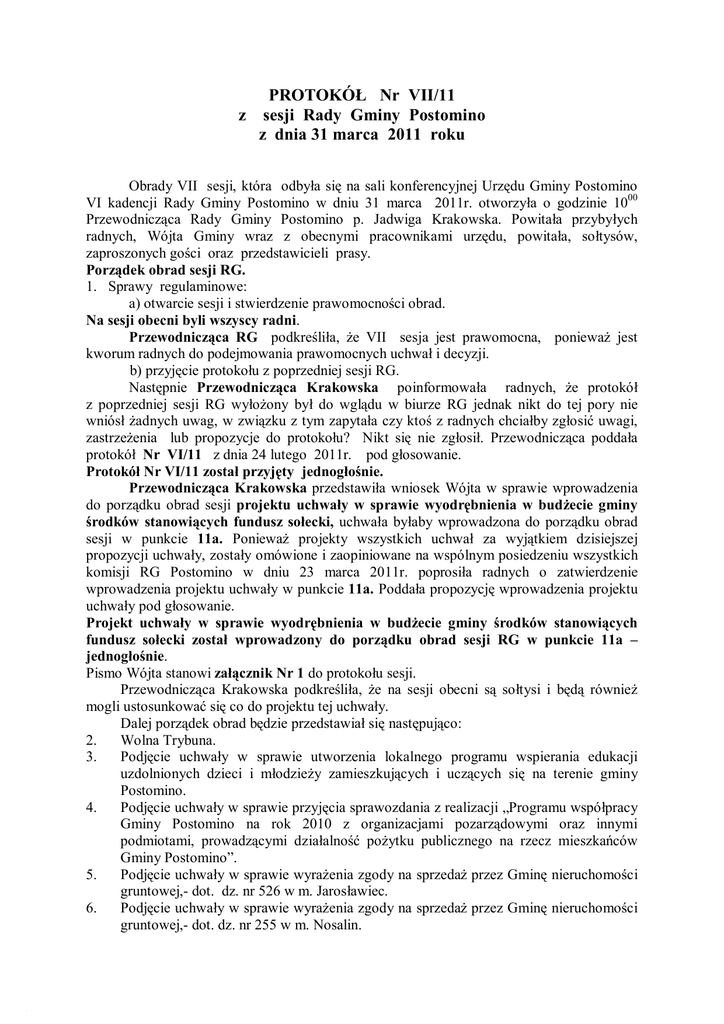 PROTOKÓŁ Nr VII/11 z sesji Rady Gminy Postomino z dnia 31 marca 2011 roku Obrady VII sesji, która odbyła się na sali konferencyjnej Urzędu Gminy Postomino VI kadencji Rady Gminy Postomino w dniu 31 marca 2011r. otworzyła o godzinie 1000 Przewodnicząca Rady Gminy Postomino p. Jadwiga Krakowska. Powitała przybyłych radnych, Wójta Gminy wraz z obecnymi pracownikami urzędu, powitała, sołtysów, zaproszonych gości oraz przedstawicieli prasy. Porządek obrad sesji RG. 1. Sprawy regulaminowe: a) otwarcie sesji i stwierdzenie prawomocności obrad. Na sesji obecni byli wszyscy radni. Przewodnicząca RG podkreśliła, że VII sesja jest prawomocna, ponieważ jest kworum radnych do podejmowania prawomocnych uchwał i decyzji. b) przyjęcie protokołu z poprzedniej sesji RG. Następnie Przewodnicząca Krakowska poinformowała radnych, że protokół z poprzedniej sesji RG wyłożony był do wglądu w biurze RG jednak nikt do tej pory nie wniósł żadnych uwag, w związku z tym zapytała czy ktoś z radnych chciałby zgłosić uwagi, zastrzeżenia lub propozycje do protokołu? Nikt się nie zgłosił. Przewodnicząca poddała protokół Nr VI/11 z dnia 24 lutego 2011r. pod głosowanie. Protokół Nr VI/11 został przyjęty jednogłośnie. Przewodnicząca Krakowska przedstawiła wniosek Wójta w sprawie wprowadzenia do porządku obrad sesji projektu uchwały w sprawie wyodrębnienia w budżecie gminy środków stanowiących fundusz sołecki, uchwała byłaby wprowadzona do porządku obrad sesji w punkcie 11a. Ponieważ projekty wszystkich uchwał za wyjątkiem dzisiejszej propozycji uchwały, zostały omówione i zaopiniowane na wspólnym posiedzeniu wszystkich komisji RG Postomino w dniu 23 marca 2011r. poprosiła radnych o zatwierdzenie wprowadzenia projektu uchwały w punkcie 11a. Poddała propozycję wprowadzenia projektu uchwały pod głosowanie. Projekt uchwały w sprawie wyodrębnienia w budżecie gminy środków stanowiących fundusz sołecki został wprowadzony do porządku obrad sesji RG w punkcie 11a – jednogłośnie. Pismo Wójta stanowi załącznik Nr 1 do protokołu sesji. Przewodnicząca Krakowska podkreśliła, że na sesji obecni są sołtysi i będą również mogli ustosunkować się co do projektu tej uchwały. Dalej porządek obrad będzie przedstawiał się następująco: 2. Wolna Trybuna. 3. Podjęcie uchwały w sprawie utworzenia lokalnego programu wspierania edukacji uzdolnionych dzieci i młodzieży zamieszkujących i uczących się na terenie gminy Postomino. 4. Podjęcie uchwały w sprawie przyjęcia sprawozdania z realizacji „Programu współpracy Gminy Postomino na rok 2010 z organizacjami pozarządowymi oraz innymi podmiotami, prowadzącymi działalność pożytku publicznego na rzecz mieszkańców Gminy Postomino”. 5. Podjęcie uchwały w sprawie wyrażenia zgody na sprzedaż przez Gminę nieruchomości gruntowej,- dot. dz. nr 526 w m. Jarosławiec. 6. Podjęcie uchwały w sprawie wyrażenia zgody na sprzedaż przez Gminę nieruchomości gruntowej,- dot. dz. nr 255 w m. Nosalin. 2 7. Podjęcie uchwały w sprawie wyrażenia zgody na wydzierżawienie na okres powyżej 3 lat nieruchomości gruntowej,- dot. dz. nr 259/5 w Jarosławcu. 8. Podjęcie uchwały zmieniającej uchwałę Nr XXXI/322/09 w sprawie wyrażenia zgody na wydzierżawienie na okres powyżej 3 lat nieruchomości gruntowej. 9. Podjęcie uchwały w sprawie ustalenia dopłat dla odbiorców usług zaopatrzenia w wodę i odprowadzenia ścieków. 10. Podjęcie uchwały w sprawie zmian w budżecie gminy na 2011 rok. 11. Podjęcie uchwały w sprawie określenia trybu i sposobu powoływania i odwoływania członków zespołu interdyscyplinarnego powołanego do podejmowania działań na rzecz przeciwdziałania przemocy w rodzinie w Gminie Postomino oraz szczegółowych warunków funkcjonowania tego zespołu. 11a. Podjęcie uchwały w sprawie wyodrębnienia w budżecie gminy środków stanowiących fundusz sołecki. 12. Interpelacje i zapytania. 13. Odpowiedzi na interpelacje i zapytania. 14. Wolne wnioski i informacje. 15. Zamknięcie obrad sesji. Ad. 2 Wolna Trybuna. Przewodnicząca Krakowska przekazała, że w dniu dzisiejszym na sesji będzie będzie miała miejsce miła uroczystość i oddała głos P. Wójtowi Bojkowskiemu. P. Wójt Bojkowski podkreślił, że gmina jest w trakcie wyborów sołtysów. Na dzień dzisiejszy odbyło się 9 zebrań sołeckich i 6 sołtysów pozostało bez zmian, natomiast wybrano 3 nowych sołtysów w m. Jezierzany – Pani Henryka Szymańska, w m. Dzierżęcin- Pani Wioletta Jasińska i w m. Karsino - Pani Urszula Matuszak. W roku bieżącym nie był w gminie obchodzony uroczyście dzień sołtysa, ponieważ zdublowały by się uroczystości zaplanowane przez Wójta. Zamiarem P. Wójta było aby po zakończeniu wyborów przeprowadzonych we wszystkich sołectwach spotkać się w starym składzie sołtysów oraz nowym składzie. Spotkanie to odbyłoby się w maju br. P. Wójt w sposób szczególny podziękował P. Jerzemu Brzozowskiemu – sołtysowi z Karsina, który sołtysem był przez 37 lat i był drugim sołtysem w Polsce o tak długim stażu sołeckim. Podziękowania wraz z życzeniami przekazali także Przewodnicząca Krakowska, oraz Zastępca Wójta P. Adam Drapała. P. Wójt Bojkowski podkreślił, że P. Brzozowski będzie obecny także na spotkaniu majowym sołtysów. P. Jerzy Brzozowski – podziękował za prezent, a także podziękował wszystkim, z którymi pracował przez wiele lat. Przewodnicząca RG prosiła wszystkich obecnych o zabieranie głosu w tym punkcie. Sołtys Morka z Pieszcza poruszył sprawę wjazdu i wyjazdu z Pieszcza po moście. Miał obawy, że most się zawali i nie będzie przejazdu. Ponadto uważał, że od skrzyżowania należy wykopać rowy, gdyż inaczej droga zupełnie się zarwie. Sołtys Kosmalska z Marszewa poruszyła temat likwidacji ZDP w Sławnie i zapytała jak będzie wyglądał remont dróg powiatowych i kto bę