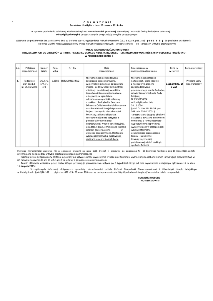 ` O G Ł O S Z E N I E Burmistrza Poddębic z dnia 25 czerwca 2015roku w sprawie podania do publicznej wiadomości wykazu nieruchomości gruntowej stanowiącej własnośd Gminy Poddębice położonej w Poddębicach obręb 6 przeznaczonych do sprzedaży w trybie przetargowym Stosownie do postanowieo art. 35 ustawy z dnia 21 sierpnia 1997 r. o gospodarce nieruchomościami (Dz.U z 2015 r. poz. 782) p o d a j e s i ę do publicznej wiadomości na okres 21 dni niżej wyszczególniony wykaz nieruchomości gruntowych przeznaczonych do sprzedaży w trybie przetargowym WYKAZ NIERUCHOMOŚCI GRUNTOWYCH PRZEZNACZONYCH DO SPRZEDAŻY W TRYBIE PRZETARGU USTNEGO NIEOGRANICZONEGO STANOWIĄCYCH WŁASNOŚD GMINY PODDĘBICE POŁOŻONYCH W PODDĘBICACH OBRĘB 6 L.p. Położenie nieruchomości Numer działki 1. Poddębice obr. geod. 6 ul. Mickiewicza 5/5, 5/6, 5/7, 7 , 4/4 Pow. w ha Nr Kw 3,8080 SR2L/00030327/2 Opis nieruchomości Nieruchomośd niezabudowana. Lokalizacja bardzo korzystna, w niewielkiej odległości od centrum miasta , siedziby władz administracji miejskiej i powiatowej, w pobliżu terenów o intensywnej zabudowie usługowej , w sąsiedztwie odrestaurowany obiekt pałacowy z parkiem i Poddębickie Centrum Zdrowia z Oddziałem Rehabilitacyjnym oraz Poradniami Specjalistycznymi. Dojazd i dostęp do nieruchomości korzystny z ulicy Mickiewicza. Nieruchomośd może korzystad z pełnego uzbrojenia: sieci energetycznej, wodno-kanalizacyjnej, urządzonej drogi, z miejskiego zasilania ciepłem geotermalnym, w ulicy sied gazu ziemnego. Dostęp do wód geotermalnych z możliwością realizacji inwestycji na ich bazie. Powyższe nieruchomości gruntowe nie są obciążone prawami na rzecz osób trzecich i Przeznaczenie w planie zagospodarowania Cena w w złotych Nieruchomośd położona na terenach, które zgodnie z miejscowym planem 1.500.000,00,- zł zagospodarowania z VAT przestrzennego miasta Poddębic, zatwierdzonym Uchwałą Rady Miejskiej Nr XXIV/158/04 w Poddębicach z dnia 28.12.2004r. (publ. Dz. Urz.W.Ł.Nr 54 poz. 563 z dn. 25.02.2005r.) - przeznaczona jest pod obiekty i urządzenia związane z rozwojem kompleksu o funkcji leczniczowypoczynkowej i sportowej, wykorzystujące w szczególności wody geotermalne, uzupełniające przeznaczenie terenu – usługi inne towarzyszące funkcji podstawowej, zieleo parkingi, symbol – E4U-US stosownie do Zarządzenia Nr Forma sprzedaży Przetarg ustny nieograniczony 68 Burmistrza Poddębic z dnia 19 maja 2015r. zostały przeznaczone do sprzedaży w trybie przetargu ustnego nieograniczonego Przetarg ustny nieograniczony zostanie ogłoszony po upływie okresu wywieszenia wykazu oraz terminów wyznaczonych osobom którym przysługuje pierwszeostwo w ich nabyciu stosownie do art. 34 ust. 1 pkt.1 i 2 ustawy o gospodarce nieruchomościami . Termin składania wniosków przez osoby którym przysługuje pierwszeostwo upływa po 6 tygodniach licząc od dnia wywieszenia niniejszego ogłoszenia t.j. w dniu 11 sierpnia 2015r. Szczegółowych informacji dotyczących sprzedaży nieruchomości udziela Referat Gospodarki Nieruchomościami i Urbanistyki Urzędu Miejskiego w Poddębicach (pokój Nr 101 I piętro tel. 678 - 25 - 80 wew. 228) oraz są dostępne na stronie http://poddebice.intergis.pl/ w zakładce działki na sprzedaż. BURMISTRZ PODDĘBIC PIOTR SĘCZKOWSKI