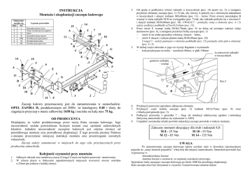 3. INSTRUKCJA MontaŜu i eksploatacji zaczepu kulowego Oznaczenie zacisku wg ISO PN 1 L 2 + 3 31 4 R 5 58R 6 54 7 58L Łączenie przewodów 14 14 15 Kierunkowskazy lewe Tylne światła przeciwmgłowe Masa Kierunkowskazy prawe Światła pozycyjne prawe Światła hamowania Światła pozycyjne lewe A 15 11 9 B C 15 5 9 A 10 6 G 10 E 1 5. D 15 E gumowa zaślepka - usunąć 8 6 11 4. 7 5 Od spodu w podłuŜnice włoŜyć nakrętki w koszyczkach (poz. 14) (patrz rys. 2), a następnie przyłoŜyć elementy zaczepu (poz. 4 i 5) tak, aby otwory A pokryły się z włoŜonymi nakrętkami w koszyczkach i skręcić śrubami M8x40mm (poz. 11) – luźno. Przez otwory prostokątne B wsunąć w ramę nakrętki M10 na wysięgniku (poz. 7) tak, aby nakrętka pokryła się z otworem C i skręcić śrubami M10x40mm (poz. 10). UWAGA!!! – pomiędzy ramę a elementy (poz. 4 i 5) naleŜy podłoŜyć podkładki ø25xø10,5x4mm (poz. 15). Przez otwór E wsunąć śrubę M10x170mm (poz. 9) na którą od zewnątrz nałoŜyć tuleje dystansowe (poz. 6), a następnie przyłoŜyć belkę zaczepu (poz. 1) − otwór G na śrubę uprzednio włoŜoną i skręcić – luźno, − otwór F skręcić z tylnym płatem śrubą M10x40mm (poz. 10) Uwaga!!! – naleŜy pamiętać o włoŜeniu podkładki (poz. 15) pomiędzy tylny płat a elementy (poz. 4 i 5). W dolnej części zderzaka w jego osi wyciąć fragment o wymiarach: − kula przykręcana na śruby – szerokość 60mm, w głąb 150mm tu umocować nakrętki w koszyczkach. A F 22 G B C Rys.2 10 10 C B D 15 F 3 2 Zaczep kulowy przeznaczony jest do zamontowania w samochodzie: OPEL ZAFIRA II, produkowanym od 2005r. nr katalogowy E48 i słuŜy do ciągnięcia przyczep o masie całkowitej 1650 kg i nacisku na kulę max 75 kg. 6. 7. 8. OD PRODUCENTA Dziękujemy za wybór produkowanego przez naszą firmę zaczepu kulowego. Jego niezawodność została potwierdzona licznymi testami oraz opiniami zadowolonych klientów. JednakŜe niezawodność zaczepów kulowych jest zaleŜna równieŜ od prawidłowego montaŜu oraz prawidłowej eksploatacji. Z tego powodu prosimy Państwa o staranne przeczytanie niniejszej instrukcji montaŜu oraz przestrzeganie zawartych wskazówek. Zaczep naleŜy zamontować w miejscach do tego celu przeznaczonych przez producenta samochodu. Kolejność czynności przy montaŜu 1. 2. Odkręcić zderzak oraz metalową czaszę (Uwaga! Czasza nie będzie ponownie montowana). W tylnym płacie w fabrycznie zapunktowanych miejscach wywiercić otwory wiertłem ø 25mm (po jednym z kaŜdej strony). 9. Przykręcić ponownie uprzednio odkręcone elementy. Przykręcić część kulista zaczepu (poz. 2) śrubami M12x75mm (poz. 8) wraz z blachą pod gniazdo (poz. 3). Podłączyć przewody z gniazdka 7 – bieg. do instalacji elektrycznej zgodnie z instrukcją fabryczną samochodu (zaleca się wykonanie w ASO). Uzupełnić ewentualne ubytki powłoki malarskiej zaczepu powstałe w trakcie montaŜu. Zalecany moment skręcający dla śrub i nakrętek 8,8: M 8 - 25 Nm M 10 - 55 Nm M 12 - 85 Nm M 14 - 135 Nm UWAGA Po zamontowaniu zaczepu kulowego naleŜy uzyskać wpis w dowodzie rejestracyjnym pojazdu na „stacji kontroli pojazdów” właściwej dla miejsca zamieszkania. Samochód powinien być wyposaŜony w : -kierunkowskazy boczne -lusterka boczne o rozstawie, co najmniej szerokości przyczepy. Sprawdzać śruby mocujące zaczepu kulowego po około 1000 km przebiegu eksploatacji. Kula zaczepu musi być utrzymana w czystości i konserwowana smarem stałym PPUH AUTO-HAK Sp.J. WyposaŜenie zaczepu: Produkcja Zaczepów Kulowych Henryk & Zbigniew Nejman 76-200 SŁUPSK ul. Słoneczna 16K tel/fax (059) 8-414-414; 8-414-413 E-mail: [email protected] www.autohak.com.pl Zaczep kulowy bez wyposaŜenia elektrycznego E48 Klasa: A50-X Nr kat. Przeznaczony do zamontowania w samochodzie: Producent: OPEL Model: ZAFIRA II produkowanym od 2005r. Dane techniczne: Wartość siły D : 9,6 kN maksymalna masa przyczepy: 1650 kg maksymalny nacisk na kulę: 75 kg Numer homologacji zgodnie z dyrektywą 94/20/WE: e20*94/20*0096*00 KARTA GWARANCYJNA Producent udziela gwarancji niniejszą kartą gwarancyjną na okres 24 miesięcy licząc od dnia zakupu zaczepu kulowego do samochodu: OPEL ZAFIRA II produkowanego od 2005r. Data produkcji .............................. Data zakupu.................................. Zakres gwarancji obejmuje wyłącznie wady jakościowe wynikające z winy producenta. Gwarancja nie obejmuje natomiast uszkodzeń zawinionych przez nabywcę, wynikających z niewłaściwego montaŜu, uŜytkowania lub konserwacji, uszkodzeń mechanicznych, normalnego zuŜycia podczas eksploatacji itp. Gwarancja udzielona na zakupiony towar nie wyłącza, nie ogranicza ani nie zawiesza uprawnień kupującego wynikających z niezgodności towaru z umową. Reklamacje naleŜy zgłaszać w punkcie sprzedaŜy, składając jednocześnie kartę gwarancyjną. Usunięcie "wady" następuje po stwierdzeniu przez punkt sprzedaŜy wspólnie z producentem słuszności złoŜonej reklamacji. Reklamacja powinna być załatwiona w ciągu czternastu dni od dnia uznania reklamacji. Karta gwarancyjna jest niewaŜna jeŜeli nie jest wypełniona i podpisana. Data zgłoszenia reklamacji: ................................................................... INFORMACJA WSTĘPNA Zaczep kulowy jest skonstruowany zgodnie z zasadami bezpieczeństwa ruchu drogowego. Zaczep kulowy jest elementem wpływającym na bezpieczeństwo jazdy i moŜe zostać zainstalowany wyłącznie przez personel wyspecjalizowany. Niedopuszczalne jest dokonywanie jakichkolwiek zmian w konstrukcji zaczepu. Powoduje to wygaśniecie dopuszczenia do stosowania. W przypadku obecności masy izolacyjnej lub osłony podwozia w miejscu przylegania zaczepu, naleŜy ją usunąć. Nieosłonięte miejsca karoserii oraz wywiercone otwory naleŜy pomalować farbą antykorozyjną. Informacjami wiąŜącymi odnośnie wartości obciąŜeń są dane podawane przez produ