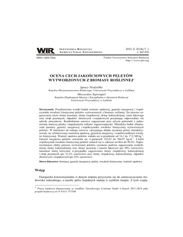 ocena cech jakościowych peletów wytworzonych z biomasy roślinnej