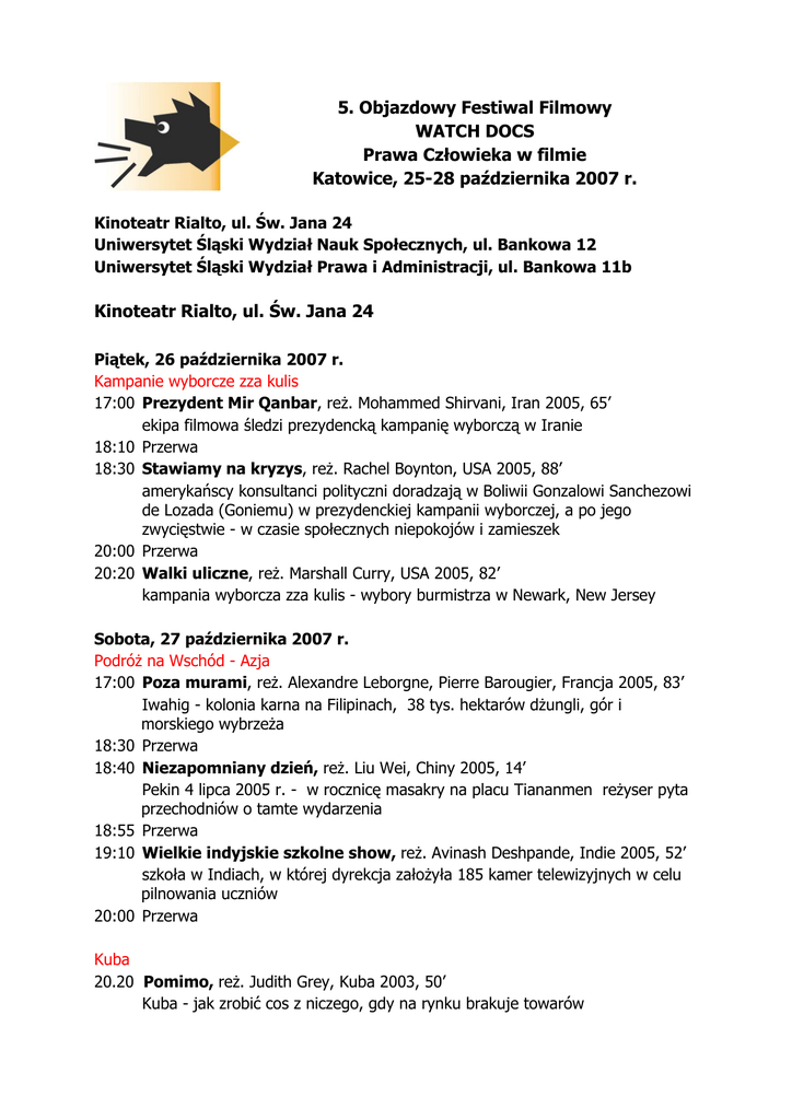 5. Objazdowy Festiwal Filmowy WATCH DOCS Prawa Człowieka w filmie Katowice, 25-28 października 2007 r. Kinoteatr Rialto, ul. Św. Jana 24 Uniwersytet Śląski Wydział Nauk Społecznych, ul. Bankowa 12 Uniwersytet Śląski Wydział Prawa i Administracji, ul. Bankowa 11b Kinoteatr Rialto, ul. Św. Jana 24 Piątek, 26 października 2007 r. Kampanie wyborcze zza kulis 17:00 Prezydent Mir Qanbar, reż. Mohammed Shirvani, Iran 2005, 65’ ekipa filmowa śledzi prezydencką kampanię wyborczą w Iranie 18:10 Przerwa 18:30 Stawiamy na kryzys, reż. Rachel Boynton, USA 2005, 88’ amerykańscy konsultanci polityczni doradzają w Boliwii Gonzalowi Sanchezowi de Lozada (Goniemu) w prezydenckiej kampanii wyborczej, a po jego zwycięstwie - w czasie społecznych niepokojów i zamieszek 20:00 Przerwa 20:20 Walki uliczne, reż. Marshall Curry, USA 2005, 82’ kampania wyborcza zza kulis - wybory burmistrza w Newark, New Jersey Sobota, 27 października 2007 r. Podróż na Wschód - Azja 17:00 Poza murami, reż. Alexandre Leborgne, Pierre Barougier, Francja 2005, 83’ Iwahig - kolonia karna na Filipinach, 38 tys. hektarów dżungli, gór i morskiego wybrzeża 18:30 Przerwa 18:40 Niezapomniany dzień, reż. Liu Wei, Chiny 2005, 14’ Pekin 4 lipca 2005 r. - w rocznicę masakry na placu Tiananmen reżyser pyta przechodniów o tamte wydarzenia 18:55 Przerwa 19:10 Wielkie indyjskie szkolne show, reż. Avinash Deshpande, Indie 2005, 52’ szkoła w Indiach, w której dyrekcja założyła 185 kamer telewizyjnych w celu pilnowania uczniów 20:00 Przerwa Kuba 20.20 Pomimo, reż. Judith Grey, Kuba 2003, 50’ Kuba - jak zrobić cos z niczego, gdy na rynku brakuje towarów 21:10 Przerwa 21:20 Śpiąca wyspa, reż. David Martín de los Santos, Hiszpania 2005, 60’ strategie przetrwania na Kubie Niedziela, 28 października 2007 r. Być sobą 17:00 Polityka serca, reż. Nancy Nicol, Kanada 2005, 67’ uznanie praw rodzicielskich dla gejów i lesbijek w Quebeku 18:10 Przerwa 18:30 Koniec obywatelstwa drugiej kategorii, reż. Nancy Nicol, Kanada 2006, 89’ kanadyjska debata o małżeństwach homoseksualistów: od trudnych początków do ustawowego ich zagwarantowania 20 lipca 2005 r. 20:00 Przerwa 20:20 Persona Leo N., reż. Alberto Vendemmiati, Włochy 2005, 87’ włoski transseksualista, który decyduje się na zmianę płci Uniwersytet Śląski Wydział Nauk Społecznych, ul. Bankowa 11 Czwartek, 25 października 2007 r. My, przybysze 11:00 Dlaczego?, reż. Rada Sesic, Holandia 2001, 33’ historie trojga osób: Perera, lekarza ze Sri Lanki, Veronique, dyplomatki z Burundi i Luby, aktorki z Czeczenii. Dawniej wiedli oni w swoich krajach udane i dostatnie życie, a dziś są uchodźcami w Holandii 11:35 Przerwa 11:45 Warszawiacy, reż. Anna Gajewska, Polska 2006, 45’ Wietnamczycy w Warszawie 12:30 Przerwa 12:40 O prawdzie, reż. Nikolaj Borts, Polska 2005, 14’ imigrantka z Rosji stworzyła w Polsce amatorski teatr Po projekcjach filmowych debata na temat szans i zagrożeń związanych z emigracją w Polsce. Piątek, 26 października 2007 r. Widma faszyzmu 11:00 Krawędź, reż. Andres Veiel, Niemcy 2005, 82’ morderstwo popełnione przez trzech młodych neonazistów na ich znajomym Po projekcji filmu debata na temat współczesnych zagrożeń faszyzmem. Imprezy towarzyszące: Uniwersytet Śląski Wydział Prawa i Administracji, ul. Bankowa 11b Czwartek, 25 października 2007 r. 10.00 – 15.00 Uroczyste rozpoczęcie Festiwalu i konferencja „Polska, Ukraina, Białoruśwspółczesne przemiany społeczno-polityczne” Program Konferencji: 10.00 – 10.10 Powitanie 10.10 – 10.30 Odbicie przemian ustrojowych w konstytucji (prof. Anna Łabno, Prorektor Uniwersytetu Śląskiego ds. Kształcenia) 10.30 – 11.25 Lekcja białoruskiego, reż. Mirosław Dembiński, Polska 2006, 53’ walka „podziemnego liceum” z reżimem Łukaszenki 11.25 – 11.40 Przerwa 11.40 – 12.30 Historia „pomarańczowej rewolucji” (Volodymyr Martyniuk, organizacja Majdan, uczestnik „pomarańczowej rewolucji” na Ukrainie) Partycypacja społeczna w Polsce i na świecie (Dariusz Kraszewski, Stowarzyszenie Liderów Lokalnych Grup Obywatelskich) Partycypacja społeczna w Katowicach (Grzegorz Wójkowski, Prezes Zarządu Stowarzyszenia Bona Fides) 12.30 – 12.50 12.50 – 13.00 13.00 – 13.45 13.45 – 14.00 14.00 – 15.00 Zbudujemy socjalizm, reż. Andrzej Trzos-Rastawiecki, Polska 2005, 45’ międzynarodowa polityka wokół Polski w okresie narodzin „Solidarności” Motywacje opinii międzynarodowej a poparcie dla stron konfliktu (dr Marek Migalski, Uniwersytet Śląski) Panel dyskusyjny (prowadzenie: dr Marek Migalski, Uniwersytet Śląski) Piątek, 26 października 2007 r. 15:00 Inscenizacja procesu ks. Biskupa Karczmarka, przedstawienie stworzone przez Studencki Klub Dyskusyjny Secta Ironiae
