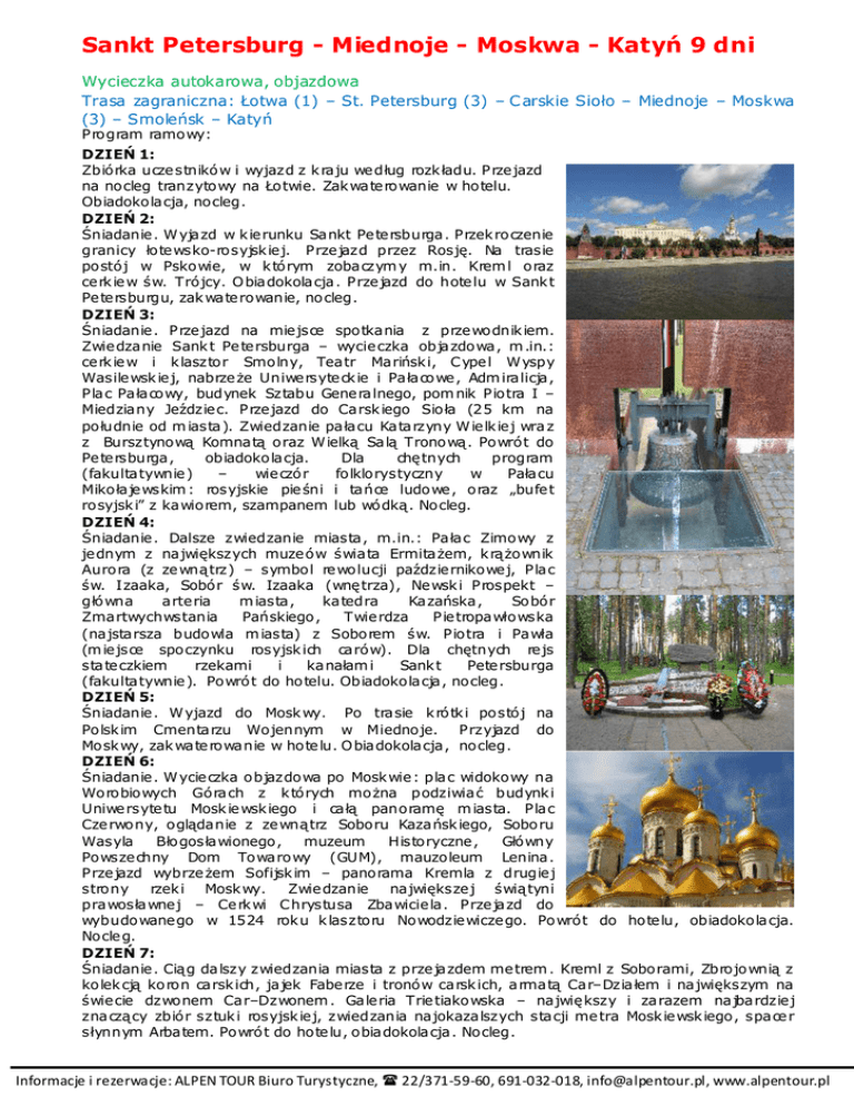 Sankt Petersburg - Miednoje - Moskwa - Katyń 9 dni Wycieczka autokarowa, objazdowa Trasa zagraniczna: Łotwa (1) – St. Petersburg (3) – C arskie Sioło – Miednoje – Moskwa (3) – Smoleńsk – Katyń Program ramowy: DZIEŃ 1: Zbiórka ucze stników i wyjazd z k raju we dług rozk ładu. Prze jazd na nocleg tranzytowy na Łotwie. Zak wate rowanie w hotelu. Obiadokolacja, nocleg. DZIEŃ 2: Śniadanie . W yjazd w k ie runku Sankt Pe te rsburga. Przek roczenie granicy łote wsko-rosyjsk ie j. Prze jazd przez Rosję. Na trasie postój w Pskowie, w k tórym zobaczym y m.in. Krem l oraz ce rk ie w św. Trójcy. O biadokolacja. Prze jazd do hote lu w Sank t Pe te rsburgu, zak wate rowanie, nocleg. DZIEŃ 3: Śniadanie . Prze jazd na mie jsce spotkania z prze wodnik iem. Zwie dzanie Sank t Pe te rsburga – wycie czka objazdowa, m .in.: ce rk ie w i k lasztor Smolny, Teatr Marińsk i, C ype l W yspy Wasile wsk ie j, nabrze że Uniwe rsyte ck ie i Pałacowe , Adm iralicja, Plac Pałacowy, budynek Sztabu Gene ralnego, pom nik Piotra I – Miedziany Jeździe c. Prze jazd do Carsk iego Sioła (25 km na południe od m iasta). Zwiedzanie pałacu Katarzyny W ie lk ie j wra z z Bursztynową Komnatą oraz W ielką Salą Tronową. Powrót do Pe te rsburga, obiadokolacja. Dla chę tnych program (fakultatywnie ) – wie czór folklorystyczny w Pałacu Mikołaje wskim : rosyjskie pie śni i tańce ludowe , oraz „bufe t rosyjsk i” z kawiorem, szampanem lub wódką. Nocleg. DZIEŃ 4: Śniadanie . Dalsze zwiedzanie miasta, m.in.: Pałac Zimowy z je dnym z największych muze ów świata Ermitażem, k rążownik Aurora (z ze wnątrz) – symbol re wolucji paździe rnikowe j, Plac św. Izaaka, Sobór św. Izaaka (wnę trza), Ne wsk i Prospekt – główna arte ria m iasta, katedra Kazańska, Sobór Zmartwychwstania Pańskiego, Twie rdza Pie tropawłowska (najstarsza budowla m iasta) z Soborem św. Piotra i Pawła (m ie jsce spoczynku rosyjsk ich carów). Dla chętnych re js state czkiem rzekami i kanałam i Sank t Pete rsburga (fakultatywnie ). Powrót do hotelu. Obiadokolacja, nocleg. DZIEŃ 5: Śniadanie . W yjazd do Mosk wy. Po trasie k rótk i postój na Polsk im Cmentarzu Wojennym w Miednoje. Przyjazd do Mosk wy, zak wate rowanie w hote lu. O biadokolacja, nocleg. DZIEŃ 6: Śniadanie . W ycie czka objazdowa po Mosk wie : plac widokowy na Worobiowych Górach z k tórych można podziwiać budynk i Uniwe rsyte tu Mosk ie wsk iego i całą panoramę m iasta. Plac Cze rwony, oglądanie z ze wnątrz Soboru Kazańsk iego, Soboru Wasyla Błogosławionego, muzeum Historyczne , Główny Powsze chny Dom Towarowy (GUM), mauzoleum Lenina. Prze jazd wybrze żem Sofijsk im – panorama Kremla z drugie j strony rzek i Mosk wy. Zwie dzanie największe j świątyni prawosławne j – Ce rk wi C hrystusa Zbawicie la. Prze jazd do wybudowane go w 1524 rok u k lasztoru Nowodzie wicze go. Powrót do hote lu, obiadokolacja. Nocle g. DZIEŃ 7: Śniadanie . Ciąg dalszy zwiedzania miasta z prze jazdem me trem . Kreml z Soborami, Zbrojownią z kolek cją koron carsk ich, jajek Fabe rze i tronów carsk ich, armatą Car–Działem i największym na świe cie dzwonem Car–Dzwonem . Gale ria Trie tiakowska – najwię kszy i zarazem najbardzie j znaczący zbiór sztuk i rosyjsk ie j, zwiedzania najokazalszych stacji me tra Mosk ie wsk iego, space r słynnym Arbatem. Powrót do hote lu, obiadokolacja. Nocleg. Informacje i rezerwacje: ALPEN TOUR Biuro Turystyczne, 22/371-59-60, 691-032-018, [email protected], www.alpentour.pl DZIEŃ 8: Śniadanie . W yjazd w k ie runk u Białorusi. Krótkie zwiedzanie Smoleńska: Krem l, Sobór Uspie ńsk i. W izyta w Katyniu – mie jsce kaźni polsk ich ofice rów. W yjazd do Polsk i. DZIEŃ 9: Przyjazd do Polsk i w godzinach porannych (godzina zależna od prze jść granicznych). Powrót do poszczególnych mie jscowości. Program imprezy jest ramowy, kole jność zwiedzania może ule c zm ianie. DOPŁA TY: Dopłata do pokoju 1-os.: 700 zł Dopłata do udziału w wie czorku folk lorystycznym: 150 zł Zniżka dla dzie cka do 12 lat na dostawce w pokoju 2-os.: 200 zł CENA IMPREZY ZAWIERA : - prze jazd autokarem (k limatyzacja, dvd, barek , wc) - 7 noclegów w hote lach**/*** w pokojach 2-osobowych z łazienką - 7 śniadań i 7 obiadokolacji - program turystyczny - opiekę pilota - ubezpie cze nie CENA IMPREZY NIE ZAWIERA: - kosztu wizy rosyjsk ie j 320 zł – obowiązkowo płatne przy wykupie wycie czk i - kosztu wizy białoruskie j 180 zł – obowiązkowo płatne przy zakupie wycie czk i - bile tów wstępu do zwiedzanych obiek tów, kosztów lokalnych prze wodników, bile tów komunikacji mie jsk ie j, zestawu słuchawkowego Tour-Guide (koszt pakie tu świadczeń ok. 145 EUR płatny obligatoryjnie pilotowi wycie czk i) - re jsu statk iem po rzekach i kanałach Pe te rsburga ok .15 EUR WIZY: 30 dni przed wyjazdem należy dostarczyć do PBP O lsztyn dokumenty niezbędne do uzyskania wizy: 1) kompute rowo wype łnione i podpisane zgodnie z podpisem paszportowym wniosk i wizowe (rosyjski oraz białoruski) 2) ak tualne, biometryczne , en face , kolorowe zdję cia 3,5 x 4,5 cm – 2 szt. 3) paszport ważny minim um pół roku od zakończenia ważności wizy, posiadający minimum 4 wolne strony. Najbliższe te rminy Pobyt Data wyjazdu Kod wycieczki 9 dni 24.05.14 - 01.06.14 06-711-RU 9 dni 28.06.14 - 06.07.14 07-714-RU 9 dni 26.07.14 - 03.08.14 08-705-RU Cena 2559.00 2303.00 2559.00 2303.00 2559.00 2303.00 PLN PLN PLN PLN PLN PLN Do wycieczki można dokupić: koszt wizy białorusk ie j (obowiązkowy) 180 zł koszt wizy rosyjskie j 320 zł (obowiązkowy) pokój 1 - osobowy 700 zł udział w wie czorze folk lorystycznym 150 zł Informacje i rezerwacje: ALPEN TOUR Biuro Turystyczne, 22/371-59-60, 691-032-018, [email protected], www.alpentour.pl