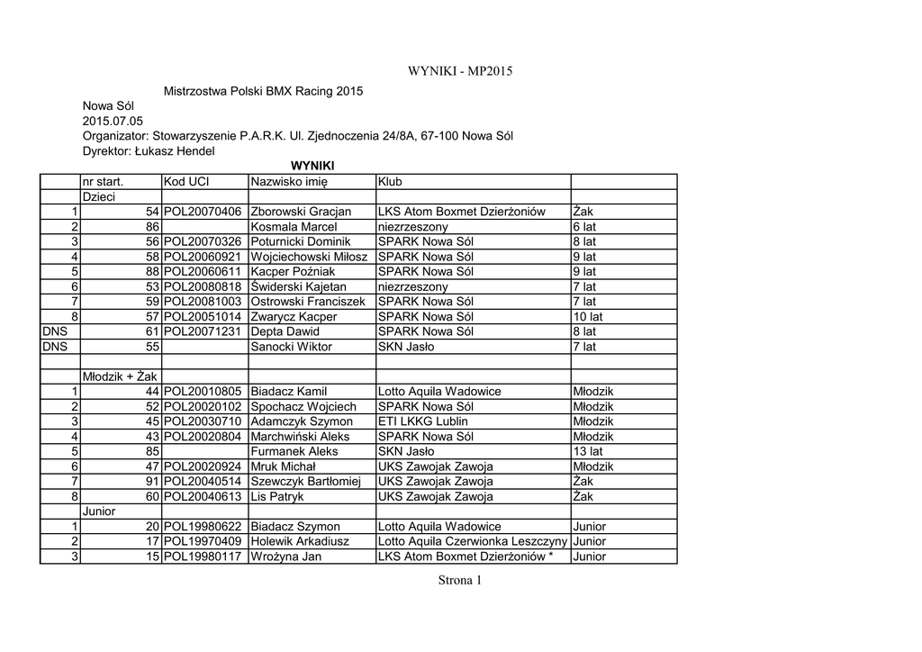 WYNIKI - MP2015 Mistrzostwa Polski BMX Racing 2015 1 2 3 4 5 6 7 8 DNS DNS 1 2 3 4 5 6 7 8 1 2 3 Nowa Sól 2015.07.05 Organizator: Stowarzyszenie P.A.R.K. Ul. Zjednoczenia 24/8A, 67-100 Nowa Sól Dyrektor: Łukasz Hendel WYNIKI nr start. Kod UCI Nazwisko imię Klub Dzieci 54 POL20070406 Zborowski Gracjan LKS Atom Boxmet Dzierżoniów 86 Kosmala Marcel niezrzeszony 56 POL20070326 Poturnicki Dominik SPARK Nowa Sól 58 POL20060921 Wojciechowski Miłosz SPARK Nowa Sól 88 POL20060611 Kacper Poźniak SPARK Nowa Sól 53 POL20080818 Świderski Kajetan niezrzeszony 59 POL20081003 Ostrowski Franciszek SPARK Nowa Sól 57 POL20051014 Zwarycz Kacper SPARK Nowa Sól 61 POL20071231 Depta Dawid SPARK Nowa Sól 55 Sanocki Wiktor SKN Jasło Młodzik + Żak 44 52 45 43 85 47 91 60 Junior 20 17 15 Żak 6 lat 8 lat 9 lat 9 lat 7 lat 7 lat 10 lat 8 lat 7 lat Młodzik Młodzik Młodzik Młodzik 13 lat Młodzik Żak Żak POL20010805 POL20020102 POL20030710 POL20020804 Biadacz Kamil Spochacz Wojciech Adamczyk Szymon Marchwiński Aleks Furmanek Aleks POL20020924 Mruk Michał POL20040514 Szewczyk Bartłomiej POL20040613 Lis Patryk Lotto Aquila Wadowice SPARK Nowa Sól ETI LKKG Lublin SPARK Nowa Sól SKN Jasło UKS Zawojak Zawoja UKS Zawojak Zawoja UKS Zawojak Zawoja POL19980622 Biadacz Szymon POL19970409 Holewik Arkadiusz POL19980117 Wrożyna Jan Lotto Aquila Wadowice Junior Lotto Aquila Czerwionka Leszczyny Junior LKS Atom Boxmet Dzierżoniów * Junior Strona 1 WYNIKI - MP2015 23 16 19 18 21 22 31 POL19971202 POL19970715 POL19980303 POL19981101 POL19980126 POL19981001 POL20000725 Klimek Bartłomiej Noga Kamil Janota Michał Piontek Marek Opyrchał Jakub Bargiel Adam Kołodziejczyk Patryk ETI LKKG Lublin LKS Atom Boxmet Dzierżoniów niezrzeszony Lotto Aquila Wadowice Lotto Aquila Wadowice Lotto Aquila Wadowice ETI LKKG Lublin Junior Junior Junior Junior Junior Junior Junior Młodszy 1 9 6 4 5 2 3 7 Kobiety Open 76 64 71 63 65 62 POL19950307 POL19890816 POL19871024 POL19880327 POL19941121 POL19960211 POL19920719 POL19870907 Dądela Gustaw Giemza Bartosz Chmiel Maciej Kulesza Robert Adamczyk Karol Bednarek Allan Klein Jakub Pietrzak Dawid Lotto Aquila Wałbrzych/Wadowice Lotto Aquila Wadowice SPARK Nowa Sól Lotto Aquila Wadowice ETI LKKG Lublin Lotto Aquila Wadowice Lotto Aquila Wadowice Lotto Aquila Wadowice Elita Elita Elita Elita Elita Elita Elita Elita POL20020715 POL19960417 POL19991225 POL19960819 POL19980326 POL19920824 Kudra Marika Gacek Agnieszka Mendys Urszula Mazur Natalia Wczasek Oliwia Łata Patrycja Lotto Aquila Wadowice ETI LKKG Lublin Warszawski Klub Kolarski ETI LKKG Lublin Lotto Aquila Czerwionka Leszczyny Gravity Racing Poznań Młodziczka Elita Kobiet Juniorka Młodsza Elita Kobiet Juniorka Elita Kobiet POL19811202 POL19850219 POL19710808 POL19770315 POL19720322 Kusiński Michał Kowalski Jacek Kudra Henryk Wićko Marek Adamczyk Marcin ETI LKKG Lublin SPARK Nowa Sól Lotto Aquila Wadowice SPARK Nowa Sól ETI LKKG Lublin Masters Masters Masters Masters Masters Lotto Aquila Wadowice Młodziczka 4 5 6 7 Elita 1 2 3 4 5 6 7 8 1 2 3 4 5 6 Masters 1 2 3 4 5 92 90 80 82 81 Juniorki 1 76 POL20020715 Kudra Marika Strona 2 WYNIKI - MP2015 2 3 4 5 6 71 73 65 72 77 POL19991225 POL19990406 POL19980326 POL19990427 POL20010805 Mendys Urszula Wątlikiewicz Aneta Wczasek Oliwia Mruk Anna Cecylia Pawowicz Paulina Warszawski Klub Kolarski UKS Zawojak Zawoja Lotto Aquila Czerwionka Leszczyny UKS Zawojak Zawoja UKS Zawojak Zawoja Strona 3 Juniorka Młodsza Juniorka Młodsza Juniorka Juniorka Młodsza Młodziczka