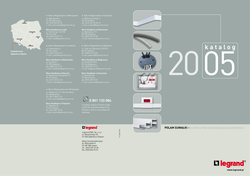 Biuro Regionalne w Warszawie GDAŃSK WARSZAWA LUBLIN WROCŁAW KRAKÓW Siedziba firmy Ząbkowice Śląskie Biuro Regionalne w Krakowie al. Wyścigowa 8 02-681 Warszawa fax: (022) 843 82 68 e-mail: [email protected] ul. Walerego Sławka 3 30-653 Kraków fax: (012) 623 30 48, 49 e-mail: [email protected] Biuro Handlowe w Łodzi ul. Kilińskiego 122/128 90-013 Łódź fax: (042) 676 21 13 e-mail: [email protected] Biuro Handlowe w Katowicach ul. Bytkowska 1 B 40-955 Katowice fax: (032) 789 92 90 e-mail: [email protected] Biuro Regionalne w Lublinie katalog Biuro Regionalne w Gdańsku ul. Diamentowa 4 20-447 Lublin fax: (081) 745 69 15 e-mail: [email protected] ul. Trakt św. Wojciecha 223/225 80-017 Gdańsk fax: (058) 762 98 04 e-mail: [email protected] Biuro Handlowe w Białymstoku ul. Hurtowa 4 15-399 Białystok fax: (085) 745 41 76 e-mail: [email protected] Biuro Handlowe w Bydgoszczy ul. Fordońska 393 85-766 Bydgoszcz fax: (052) 347 13 17 e-mail: [email protected] Biuro Handlowe w Kielcach ul. Batalionów Chłopskich 77 25-671 Kielce fax: (041) 345 21 40 e-mail: [email protected] Biuro Handlowe w Szczecinie ul. Kolumba 86 70-035 Szczecin fax: (091) 489 23 02 e-mail: [email protected] 20 05 Biuro Regionalne we Wrocławiu ul. Robotnicza 72 e (Archimedes) 53-608 Wrocław fax: (071) 780 41 20 e-mail: [email protected] Biuro Handlowe w Poznaniu ul. Gdyńska 45 61-016 Poznań fax: (061) 887 90 78 e-mail: [email protected] Informacja techniczna o produktach 0 801 133 084 Z każdego miejsca w Polsce w godz. od 8.30 do 16.30 skonsultujecie się Państwo z nami za cenę połączenia lokalnego. Legrand FAEL Sp. z o.o. ul. Waryńskiego 20 57-200 Ząbkowice Śląskie Adres korespondencyjny: Al. Wyścigowa 8 02-681 Warszawa tel.: (022) 549 23 30 fax: (022) 843 94 51 PL 2005 03 001 Biura regionalne POLAM SUWAŁKI – SYSTEMY LISTEW I RUR DO INSTALACJI ELEKTRYCZNYCH SPIS TREŚCI Ć NOWOŚ str. 4 Listwy kablowe LN Ć NOWOŚ Ć NOWOŚ str. 9 Listwy kablowe KI str. 12 Listwy kablowe KIO str. 24 Rury RB Max str. 26 Rury RB Premium str. 28 Rury RB Special str. 34 Rury ICA str. 34 Rury ICTA str. 36 Puszka podłogowa SC3 str. 38 Przepust kablowy SG1 Systemy listew naściennych str. 19 Listwy Kobra Listwy napodłogowe Rury sztywne Rury giętkie Puszki podłogowe 2 3 Polam Suwałki – listwy kablowe LN PARAMETRY TECHNICZNE CHARAKTERYZUJÑCE LISTWY TYPU LN* Klasyfikacja ze wzgl´du na: LISTWY KABLOWE LN Przekrój listwy Nr ref. Opis/cechowanie Wymiary [mm] j.m. IloÊç w opakowaniu Materia∏ Listwy izolacyjne wykonane z twardego PCW, klasa palnoÊci V-0, kolor bia∏y 3300 10 Listwa kablowa LN 20X10 20 x 10 m 60 W∏asnoÊci mechaniczne – o ma∏ej odpornoÊci na uderzenia (odpornoÊç na udary 1 J): listwy LN 20X10, LN 16X16, LN 25X16 – o Êredniej odpornoÊci na uderzenia (odpornoÊç na udary 2 J): pozosta∏e listwy 3300 20 Listwa kablowa LN 16X16 16 x 16 m 40 3300 30 Listwa kablowa LN 25X16 25 x 16 m 40 3300 40 Listwa kablowa LN 35X10.1 35 x 10 m 60 3300 41 Listwa kablowa LN 35X10.2 35 x 10 m 60 3300 50 Listwa kablowa LN 40X16.1 40 x 16 m 40 3300 51 Listwa kablowa LN 40X16.2 40 x 16 m 40 3301 60 Listwa kablowa LN 50X20.1 50 x 20 m 30 3301 61 Listwa kablowa LN 50X20.2 50 x 20 m 30 3300 70 Listwa kablowa LN 60X20.3 60 x 20 m 30 3300 80 Listwa kablowa LN 40X25.1 40 x 25 m 32 3300 81 Listwa kablowa LN 40X25.2 40 x 25 m 32 3300 90 Listwa kablowa LN 40X40 40 x 40 m 20 W∏asnoÊci elektryczne Listwy o okreÊlonych izolacyjnych w∏asnoÊciach elektrycznych OdpornoÊç na temperatur´ Temperatura pracy – minimalna -20°C – maksymalna +60°C OdpornoÊç na rozprzestrzenianie p∏omienia Nie rozprzestrzeniajà p∏omienia, po odj´ciu êród∏a ognia listwa gaÊnie Ochron´ przed cia∏ami sta∏ymi i py∏em oraz przed wnikaniem wody IP 30 – listwy chronià przed przedostaniem si´ do ich wn´trza cia∏ obcych o Êrednicy 2,5 mm i wi´kszej – listwy nie chronià przed wnikaniem wody Sposób odejmowania pokrywy Pokryw´ odejmuje si´ tylko z u˝yciem narz´dzi * System listew typu LN spe∏nia wymagania zawarte w normie PN-EN 50085-1, 2001, posiada znak bezpieczeƒstwa . LISTWY KABLOWE LN Typ listwy Przewody Przekrój czynny [mm2] Ø 5,5 mm, Ø 7,2 mm, np. WDX Ø 10,6 mm, Ø 11,5 mm, np. FTP pek 75-1,0/4,8 np. YDY 3 x 2,5 np. YDY 4 x 2,5 LN 20X10 140 2 1 LN 16X16 185 3 1 1 LN 25X16 305 5 3 2 LN 35X10.1 230 4 3 LN 35X10.2 115 + 115 4 2 LN 40X16.1 505 9 6 3 2 LN 40X16.2 245 + 245 8 6 2 2 LN 50X20.1 800 12 8 4 3 LN 50X20.2 400 + 400 12 8 4 3 LN 60X20.3 305 + 305 + 305 16 10 Opakowanie Listwy kablowe oraz osprz´t ∏àcznikowy pakowane sà w pude∏ka tekturowe. D∏ugoÊç listew kablowych LN wynosi 2 m. Listwy kablowe Nr ref. 3 3 840 12 8 5 5 LN 40X25.2 405 + 405 12 8 4 4 1405 20 12 OSPRZ¢T ¸ÑCZNIKOWY LN 1 LN 40X25.1 LN 40X40 6 6 Tabela podaje dopuszczalne iloÊci przewodów i kabli, które mogà byç u∏o˝one w poszczególnych listwach. W tabeli podano maksymalne Êrednice zewn´trzne przyk∏adowych przewodów. FTP – kabel teleinformatyczny WDX pek 75-1,0/4,8 – przewód wspó∏osiowy wielkiej cz´stotliwoÊci – do instalacji TV-SAT YDY – przewody elektroenergetyczne do uk∏adania na sta∏e 4 Nazwa Nowy osprz´t ∏àcznikowy do listew LN – funkcjonalnoÊç i estetyka instalacji zapewnione Nowa rodzina akcesoriów wykoƒczeniowych umo˝liwia budow´ elementów ∏àcznikowych w zale˝noÊci od przebiegu instalacji. W sk∏ad nowej oferty akcesoriów wchodzà 2 zestawy elementów umo˝liwiajàce monta˝: • naro˝nika zewn´trznego lub naro˝nika wewn´trznego • ∏àcznika kàtowego lub ∏àcznika odga∏´ênego, lub ∏àcznika prostego, lub koƒcówki listwy. Dzi´ki zestawom monta˝owym powstajà ∏àczniki, które odpowiadajà potrzebom instalatora. Uk∏adanie instalacji naÊciennej przebiega w sposób sprawny i szybki. Przekrój listwy Wymiary listwy [mm] Osprz´t ∏àcznikowy LN – numery referencyjne ¸àcznik kàtowy ¸àcznik odga∏´êny ¸àcznik prosty Koƒców