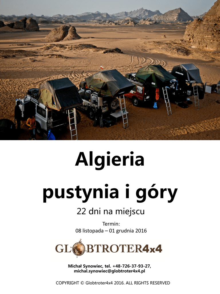 Algieria pustynia i góry 22 dni na miejscu Termin: 08 listopada – 01 grudnia 2016 Michał Synowiec, tel. +48-726-37-93-27, [email protected] COPYRIGHT © Globtroter4x4 2016. ALL RIGHTS RESERVED CHARAKTER I CEL WYPRAWY Od czasu naszych ostatnich wypraw do Afryki Północnej sytuacja w tych krajach trochę się zmieniła. „Arabska Wiosna” przemodelowała wszystkie tamtejsze państwa, do niektórych już nie można bezpiecznie wjechać, inne właśnie się otworzyły i uchodzą teraz za oazę spokoju. W tej chwili Algieria właśnie jawi nam się jako miejsce, położone stosunkowo niedaleko od Polski, idealne na wyprawę z prawdziwego zdarzenia, gdzie można znów przemierzyć niesamowite przestrzenie Sahary odwiedzając po drodze najciekawsze miejsca. Kraj ten jest pilnowany przez wojsko, na pustyni jest dużo posterunków a my, podobnie jak to było kiedyś w Libii, będziemy jeździć korzystając z wszelkich możliwych kwitów i pozwoleń oraz zgodnie z zasadami na jakich tam się podróżuje. Wyprawa jest przeznaczona dla prawdziwych podróżników, którzy posiadają dobrze wyposażone i przygotowane samochody terenowe z autonomicznością minimum 14 dni oraz zasięgiem bez tankowania ok. 1200 km. Koncepcja wyprawy jest następująca: spotykamy się w Genui, płyniemy promem do Tunisu, następnie przekraczamy granicę z Algierią w Nefcie, jedziemy w rejon In-Salah, dalej na Tamanrasset, do Askerem i w góry Hoggar. Stamtąd wracamy przez Tunezję do Genui. W planach jest oczywiście przeprawa przez wydmy, trochę jazdy po górach, przemierzanie na azymut hamady oraz noclegi na dziko na pustyni. . Michał Synowiec, tel. +48-726-37-93-27, [email protected] PROGRAM WYPRAWY 08.11.2016 – Spotkanie w porcie w Genui, wypłynięcie do Tunezji 09-10.11.2016 – Przypłynięcie do Tunezji, dojazd do granicy z Algierią 11-13.11.2016 – przejazd przez Ghardaia, El Oued passage, Touggourt, El Hajira do Zouzfana. Przybycie do Ghardaia i nocleg w EL Goléa na obszarze Ain Salah. 14-19.11.2016 – Wjazd na pistę przez obszar L’Ahnet, oglądanie spetryfikowanego lasu a dalej wjazd na pistę w kierunku Dhar Lahmar, Tintnai et Oued Tarit. Przybycie do Adrar N’Ahnet i oglądanie malowideł naskalnych w Tarit a następnie wjazd na diuny Tasdjift w Ain Ziza. 20-25.11.2016 – Przejazd przez Oued Amded – Silet – Tamenrasset – Asekrem – Affilal 26-28.11.2016 – Powrót przez In Salah i El Golea do Ghardei, zwiedzanie miasta, ostatnie zakupy, wjazd do Tunezji 29-30.11.2016 – Przejazd do Tunisu, wejście na prom 01.12.2016 – Przybycie do Genui TRASA WYPRAWY KOSZT WYJAZDU – 3.500 EUR/samochód KOSZTY ZAWIERAJĄ: Prom - Genua – Tunis - Tunis – Genua (własna kabina 2 os zewnętrzna) Przewodnik i policjant turystyczny w Algierii - jadący własnym samochodem na całej trasie od granicy z Tunezją Kwity - wszelkie zezwolenia, przepustki i algierska biurokracja Noclegi - wszystkie noclegi na campingach zawarte w planie wyjazdu Parki Narodowe - wejścia do parków Narodowych i obszarów płatnych Ubezpieczenie TU EUROPA - Ubezpieczenie podróżne + turystyka kwalifikowana Prowadzenie wyprawy KOSZTY NIE ZAWIERAJĄ Paliwa - ok. 0,20 gr/litr w Algierii Wyżywienia, napojów Arabizacji paszportu Wiz Algierskich i pośrednictwa wizowego Ewentualnych dodatkowych, nieprzewidzianych kosztów urzędowych na miejscu Wszelkich dodatkowych atrakcji oraz kosztów wynikłych z ewentualnego rozszerzenia planu Wyprawy Michał Synowiec, tel. +48-726-37-93-27, [email protected] INFORMACJE PRAKTYCZNE 1. SAMOCHÓD I WYPOSAŻENIE Aby jechać na pustynię trzeba mieć dobrze wyposażony i przygotowany do wypraw samochód terenowy. Nie nadaje się do tego zwykły SUV, nie nadaje szybkościówka, nie nadaje się Skoda Yeti. Zwykłe, „salonowe” samochody 4x4 mimo, że w zasadzie są dzielne terenowo i cala pustynia na nich jeździ, także trzeba choć trochę przygotować oraz doposażyć. Po pierwsze trzeba zwiększyć zasięg – 1200 km bez tankowania (dodatkowy zbiornik, kanistry), po drugie wyposażyć w zbiornik na wodę techniczną (40-60 litrów), po trzecie trzeba posiadać namioty (dachowe lub zwykłe), po czwarte posiadać wyposażenie kempingowe (kuchnia, butle gazowe, stoliki, krzesełka), po piąte posiadać wyposażenie off-roadowe z którego najważniejszy jest kompresor HD oraz ok. 25-30m liny kinetycznej, po szóste dobrze przemyślane mocowania uchwytów do zderzaków i szekle, po siódme opony - AT lub MT ale o głębokim bieżniku oraz zestaw naprawczy do kół. Oczywiście mile widziane są łopaty do piasku, wyciągarka (z tym, że nie jest niezbędna a sporo waży), podstawowe narzędzia i trochę najważniejszych części zapasowych (oleje, łożyska, paski klinowe, silikony do różnego zastosowania) oraz oczywiście drut, obcęgi, srebrna taśma i trytytki. Warto także zwiększyć komfort swojej jazdy pakując się w skrzynki transportowe i pomyśleć o odpowiednim ułożeniu bagaży na tyle samochodu. A na końcu warto pomyśleć o rzeczach dodatkowych, przydatnych i pomocnych ale bez których można się obejść czyli komputerach, telefonach satelitarnych, sprzęcie grającym, elektronice, aparatach i kamerach, przetwornicy oraz tym, co tylko przyjdzie nam do głowy. Dobrze przygotowany, przejrzany i sprawdzony przed wyjazdem samochód pozwala uniknąć niespodziewanych przestojów dla całej grupy, bowiem zasadą jest, że nikogo nie zostawiamy w miejscu, gdzie nie będzie można udzielić pomocy. A dzięki temu, ze w zasadzie możemy zabrać ze sobą dużo wyposażenia, można znacząco zwiększyć komfort naszej Wyprawy. Michał Synowiec, tel. +48-726-37-93-27, [email protected] 2. BEZPIECZEŃSTWO Sahara i podróżowanie po niej w zasadzie nie ma teraz dobrej prasy. Ze względu na skutki Arabskiej Wiosny wszystkie media serwujące pobieżną wiedzę o krajach Orientu przestrzegają przed podróżami w te rejony. Ale śledząc konkretne doniesienia z poszczególnych p