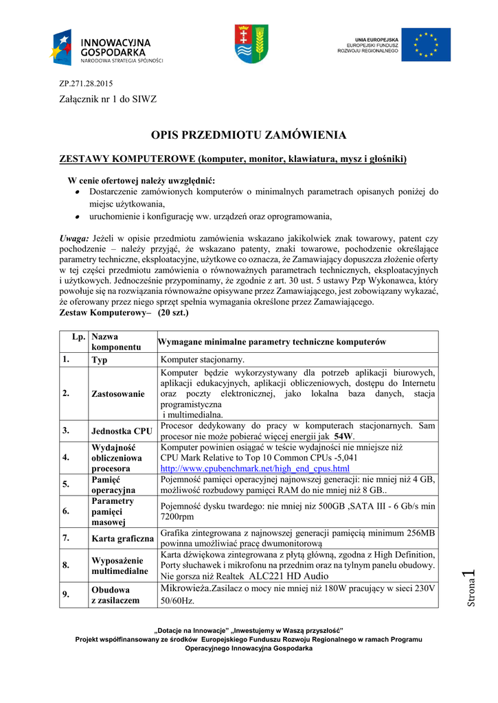 ZP.271.28.2015 Załącznik nr 1 do SIWZ OPIS PRZEDMIOTU ZAMÓWIENIA ZESTAWY KOMPUTEROWE (komputer, monitor, klawiatura, mysz i głośniki) W cenie ofertowej należy uwzględnić: Dostarczenie zamówionych komputerów o minimalnych parametrach opisanych poniżej do miejsc użytkowania, uruchomienie i konfigurację ww. urządzeń oraz oprogramowania, Uwaga: Jeżeli w opisie przedmiotu zamówienia wskazano jakikolwiek znak towarowy, patent czy pochodzenie – należy przyjąć, że wskazano patenty, znaki towarowe, pochodzenie określające parametry techniczne, eksploatacyjne, użytkowe co oznacza, że Zamawiający dopuszcza złożenie oferty w tej części przedmiotu zamówienia o równoważnych parametrach technicznych, eksploatacyjnych i użytkowych. Jednocześnie przypominamy, że zgodnie z art. 30 ust. 5 ustawy Pzp Wykonawca, który powołuje się na rozwiązania równoważne opisywane przez Zamawiającego, jest zobowiązany wykazać, że oferowany przez niego sprzęt spełnia wymagania określone przez Zamawiającego. Zestaw Komputerowy– (20 szt.) 3. 4. 5. 6. 7. 8. 9. Komputer stacjonarny. Komputer będzie wykorzystywany dla potrzeb aplikacji biurowych, aplikacji edukacyjnych, aplikacji obliczeniowych, dostępu do Internetu oraz poczty elektronicznej, jako lokalna baza danych, stacja Zastosowanie programistyczna i multimedialna. Procesor dedykowany do pracy w komputerach stacjonarnych. Sam Jednostka CPU procesor nie może pobierać więcej energii jak 54W. Komputer powinien osiągać w teście wydajności nie mniejsze niż Wydajność CPU Mark Relative to Top 10 Common CPUs -5,041 obliczeniowa http://www.cpubenchmark.net/high_end_cpus.html procesora Pojemność pamięci operacyjnej najnowszej generacji: nie mniej niż 4 GB, Pamięć możliwość rozbudowy pamięci RAM do nie mniej niż 8 GB.. operacyjna Parametry Pojemność dysku twardego: nie mniej niz 500GB ,SATA III - 6 Gb/s min pamięci 7200rpm masowej Grafika zintegrowana z najnowszej generacji pamięcią minimum 256MB Karta graficzna powinna umożliwiać pracę dwumonitorową Karta dźwiękowa zintegrowana z płytą główną, zgodna z High Definition, Wyposażenie Porty słuchawek i mikrofonu na przednim oraz na tylnym panelu obudowy. multimedialne Nie gorsza niż Realtek ALC221 HD Audio Mikrowieża.Zasilacz o mocy nie mniej niż 180W pracujący w sieci 230V Obudowa z zasilaczem 50/60Hz. „Dotacje na Innowacje” „Inwestujemy w Waszą przyszłość” Projekt współfinansowany ze środków Europejskiego Funduszu Rozwoju Regionalnego w ramach Programu Operacyjnego Innowacyjna Gospodarka 1 2. Wymagane minimalne parametry techniczne komputerów Strona Lp. Nazwa komponentu 1. Typ ZP.271.28.2015 Załącznik nr 1 do SIWZ 10. Interfejs Sieciowy Min od 10 do 1000 Mbit/s 12. Warunki gwarancji 13. Wsparcie techniczne producenta 14. 15. Wymagania dodatkowe Klawiatura - 6 portów USB 2.0 2 porty USB 3.0 1 gniazdo mikrofonowe 1 gniazdo słuchawkowe 1 wejście sygnałowe audio 1 wyjście sygnałowe audio 1 port DVI-D 1 port VGA 1 port RJ-45 - Nagrywarka DVD +/-RW DL Dołączony nośnik ze sterownikami Klawiatura PS2/USB w układzie QWERTY numer katalogowy klawiatury wg oznaczeń producenta na spodniej stronie klawiatury (możliwość zamówienia klawiatury „Dotacje na Innowacje” „Inwestujemy w Waszą przyszłość” Projekt współfinansowany ze środków Europejskiego Funduszu Rozwoju Regionalnego w ramach Programu Operacyjnego Innowacyjna Gospodarka 2 Certyfikaty i standardy Strona 11. Deklaracja zgodności CE (załączyć do oferty) Potwierdzenie spełnienia kryteriów środowiskowych, w tym zgodności z dyrektywą RoHS Unii Europejskiej o eliminacji substancji niebezpiecznych w postaci oświadczenia producenta jednostki (wg wytycznych Krajowej Agencji Poszanowania Energii S.A., zawartych w dokumencie „Opracowanie propozycji kryteriów środowiskowych dla produktów zużywających energię możliwych do wykorzystania przy formułowaniu specyfikacji na potrzeby zamówień publicznych”, pkt. 3.4.2.1; dokument z grudnia 2006), w szczególności zgodności z normą ISO 1043-4 dla płyty głównej oraz elementów wykonanych z tworzyw sztucznych o masie powyżej 25 gram Gwarancja producenta świadczona na miejscu u Uczestnika Projektu, z czasem naprawy sprzętu najpóźniej w drugim dniu roboczym od momentu zgłoszenia usterki (przyjmowanie zgłoszeń w dni robocze w godz. 8.00 – 16.00 telefonicznie, e-mailem). W przypadku braku możliwości naprawy w ww. terminie podstawienie sprzętu zastępczego o nie gorszych parametrach technicznych. Naprawy gwarancyjne muszą być realizowane przez producenta – lub autoryzowanego partnera serwisowego producenta – wymagane będzie stosowne oświadczenie Wykonawcy (które należy dołączyć do oferty). Możliwość telefonicznego sprawdzenia konfiguracji sprzętowej komputera oraz warunków gwarancji po podaniu numeru seryjnego bezpośrednio u producenta lub jego przedstawiciela. Dostęp do najnowszych sterowników i uaktualnień na stronie producenta zestawu realizowany poprzez podanie na dedykowanej stronie internetowej producenta numeru seryjnego lub modelu komputera – do oferty należy dołączyć link strony. ZP.271.28.2015 Załącznik nr 1 do SIWZ 16. Mysz 17. Listwa zasilająca 18. System operacyjny w autoryzowanym serwisie producenta jedynie po podaniu oznaczeń umieszczonych na klawiaturze) - Mysz optyczna 800 dpi - podłączenie przez port USB - dwuprzyciskowa, rolka (scroll) jako trzeci przycisk - funkcja scroll'a czterokierunkowego - numer katalogowy producenta na spodniej stronie obudowy myszy (możliwość zamówienia myszy w autoryzowanym serwisie producenta jedynie po podaniu oznaczeń umieszczonych na myszy) Ilość gniazd nie mniej niż 5 szt., Długość kabla nie mniejsza niż 3m. Wyłącznik, bezpiecznik, tłumik przeciwzakłóceniowy, ochrona przeciwprzepięciowa Zainstalowany system operacyjny niewymagający jakiejkolwiek dodatkowej aktywacji przez użytkow