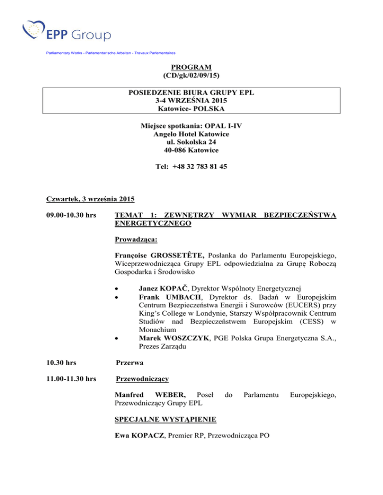 Parliamentary Works - Parlamentarische Arbeiten - Travaux Parlementaires PROGRAM (CD/gk/02/09/15) POSIEDZENIE BIURA GRUPY EPL 3-4 WRZEŚNIA 2015 Katowice- POLSKA Miejsce spotkania: OPAL I-IV Angelo Hotel Katowice ul. Sokolska 24 40-086 Katowice Tel: +48 32 783 81 45 Czwartek, 3 września 2015 09.00-10.30 hrs TEMAT 1: ZEWNĘTRZY WYMIAR BEZPIECZEŃSTWA ENERGETYCZNEGO Prowadząca: Françoise GROSSETÊTE, Posłanka do Parlamentu Europejskiego, Wiceprzewodnicząca Grupy EPL odpowiedzialna za Grupę Roboczą Gospodarka i Środowisko Janez KOPAČ, Dyrektor Wspólnoty Energetycznej Frank UMBACH, Dyrektor ds. Badań w Europejskim Centrum Bezpieczeństwa Energii i Surowców (EUCERS) przy King’s College w Londynie, Starszy Współpracownik Centrum Studiów nad Bezpieczeństwem Europejskim (CESS) w Monachium Marek WOSZCZYK, PGE Polska Grupa Energetyczna S.A., Prezes Zarządu 10.30 hrs Przerwa 11.00-11.30 hrs Przewodniczący Manfred WEBER, Poseł Przewodniczący Grupy EPL do Parlamentu SPECJALNE WYSTĄPIENIE Ewa KOPACZ, Premier RP, Przewodnicząca PO Europejskiego, 11.30-12.30 hrs TEMAT 1: ZEWNĘTRZNY WYMIAR BEZPIECZEŃSTWA ENERGETYCZNEGO Debata 14.30-15.00 hrs Przewodniczący Manfred WEBER, Poseł Przewodniczący Grupy EPL do Parlamentu Europejskiego, SPECJALNE WYSTĄPIENIE Janusz PIECHOCIŃSKI, Wicepremier RP, Minister Gospodarki, Przewodniczący PSL 15.00-16.30 hrs Dyskusja nad stanowiskiem Grupy EPL ws. Zewnętrznego Wymiaru Bezpieczeństwa Energetycznego Przewodniczący Manfred WEBER, Poseł Przewodniczący Grupy EPL do Parlamentu Europejskiego, Prezentacja projektu dokumentu przez Françoise GROSSETÊTE, Posłankę do Parlamentu Europejskiego, Wiceprzewodniczącą Grupy EPL odpowiedzialną za Grupę Roboczą Gospodarka i Środowisko Przyjęcie projektu dokumentu Piątek, 4 września 2015 09.00-10.30 hrs TEMAT 2: WSPÓLNA POLITYKA BEZPIECZEŃSTWA I OBRONY Prowadzący: Jacek SARYUSZ-WOLSKI Poseł do Parlamentu Europejskiego, Wiceprzewodniczący Grupy EPL odpowiedzialny za Grupę Roboczą ds. Zagranicznych, Wiceprzewodniczący Europejskiej Partii Ludowej Robert KUPIECKI, Podsekretarz Stanu w Ministerstwie Obrony Narodowej Michel BARNIER, Specjalny Doradca ds. Europejskiej Polityki Bezpieczeństwa i Obrony, Wiceprzewodniczący Europejskiej Partii Ludowej Debata 10.30-12.00 hrs Dyskusja nad stanowiskiem Grupy EPL na temat Wspólnej Polityki Bezpieczeństwa i Obrony 2 Przewodniczący Manfred WEBER, Poseł Przewodniczący Grupy EPL do Parlamentu Europejskiego, Prezentacja projektu dokumentu przez Jacka SARYUSZWOLSKIEGO, Posła do Parlamentu Europejskiego, Wiceprzewodniczącego Grupy EPL odpowiedzialnego za Grupę Roboczą ds. Zagranicznych, Wiceprzewodniczącego Europejskiej Partii Ludwej Przyjęcie projektu dokumentu 12.00 hrs Konferencja prasowa: Manfred WEBER, Poseł do Parlamentu Europejskiego, Przewodniczący Grupy EPL Jan OLBRYCHT, Poseł do Parlamentu Europejskiego, Przewodniczący Polskiej Delegacji (Platforma Obywatelska) w Grupie EPL Andrzej GRZYB Poseł do Parlamentu Europejskiego, Współprzewodniczący Polskiej Delegacji (Polskie Stronnictwo Ludowe) w Grupie EPL Jacek SARYUSZ-WOLSKI, Poseł do Parlamentu Europejskiego, Wiceprzewodniczący Grupy EPL odpowiedzialny za Grupę Roboczą ds. Zagranicznych, Wiceprzewodniczący Europesjkiej Partii Ludowej Jerzy BUZEK, Poseł do Parlamentu Europejskiego, były Przewodniczący Parlamentu Europejskiego, Przewodniczący komisji przemysłu, badań I energii Parlamentu Europejskiego JĘZYKI: DE/EN/FR/ES/IT/PL 3