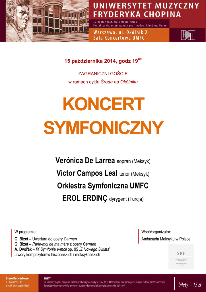 15 października 2014, godz 1900 ZAGRANICZNI GOŚCIE w ramach cyklu Środa na Okólniku KONCERT SYMFONICZNY Verónica De Larrea sopran (Meksyk) Víctor Campos Leal tenor (Meksyk) Orkiestra Symfoniczna UMFC EROL ERDINÇ dyrygent (Turcja) W programie: Współorganizator: G. Bizet – Uwertura do opery Carmen G. Bizet – Parle-moi de ma mère z opery Carmen A. Dvořák – IX Symfonia e-moll op. 95 „Z Nowego Świata” utwory kompozytorów hiszpańskich i meksykańskich Ambasada Meksyku w Polsce