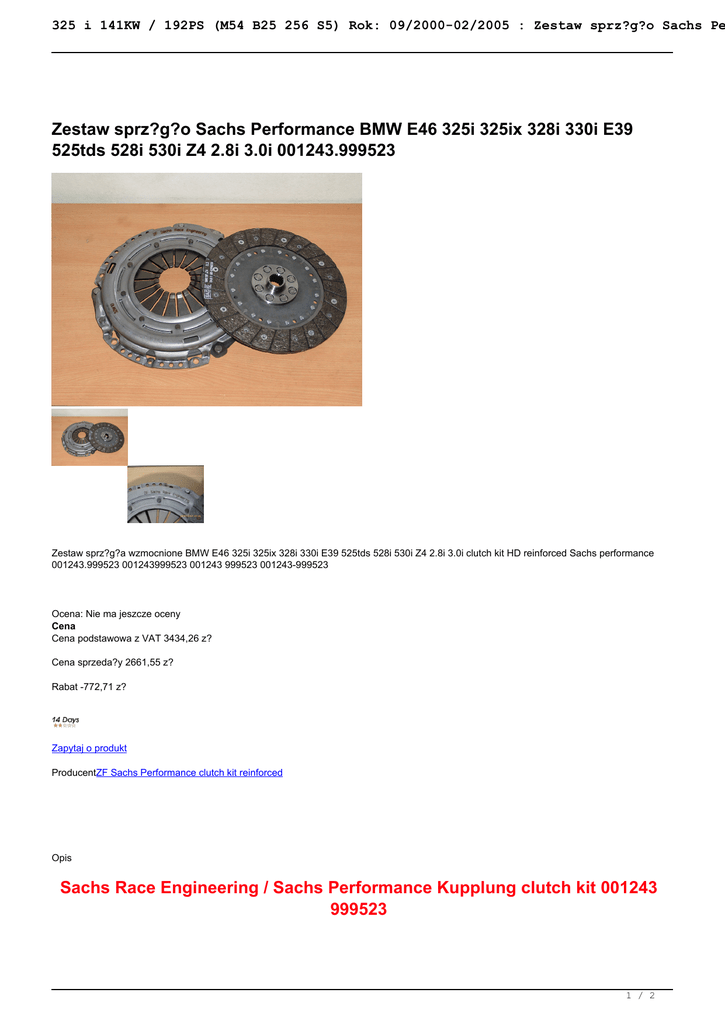 Zestaw sprzęgło Sachs Performance BMW E46 325i 325ix 328i 330i