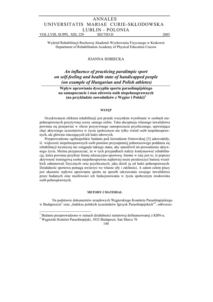 ANNALES UNIVERSITATIS MARIAE CURIE-SKŁODOWSKA LUBLIN - POLONIA VOL.LVIII, SUPPL. XIII, 229 SECTIO D 2003 Wydział Rehabilitacji Ruchowej Akademii Wychowania Fizycznego w Krakowie Department of Rehabilitation Academy of Physical Education Cracow JOANNA SOBIECKA An influence of practicing paralimpic sport on self-feeling and health state of handicapped people (on example of Hungarian and Polish athletes) Wpływ uprawiania dyscyplin sportu paraolimpijskiego na samopoczucie i stan zdrowia osób niepełnosprawnych (na przykładzie zawodników z Węgier i Polski)1 WSTĘP Oczekiwanym efektem rehabilitacji jest przede wszystkim wyrobienie w osobach niepełnosprawnych pozytywnej oceny samego siebie. Taka akceptacja własnego inwalidztwa powinna się przejawiać w sferze pozytywnego samopoczucia psychicznego, ujawniająca chęć aktywnego uczestnictwa w życiu społecznym nie tylko wśród osób niepełnosprawnych, ale głównie otaczających ich ludzi zdrowych. Przeprowadzone ogólnopolskie badania pod kierunkiem Ostrowskiej [3] udowodniły, iż większość niepełnosprawnych osób pomimo przynajmniej jednorazowego poddania się rehabilitacji leczniczej nie osiągnęło takiego stanu, aby umożliwił im prowadzenie aktywnego życia. Można przypuszczać, że w tych przypadkach należy kontynuować rehabilitację, która powinna przybrać formę rekreacyjno-sportową. Istotne w niej jest to, iż poprzez aktywność treningową osoba niepełnosprawna najłatwiej może przekroczyć barierę wszelkich zahamowań fizycznych oraz psychicznych, jaka dzieli ją od ludzi pełnosprawnych. Działalność sportowa pomaga uwierzyć we własne siły i zdolności. A zatem celem pracy jest ukazanie wpływu uprawiania sportu na sposób odczuwania swojego inwalidztwa przez badanych oraz możliwości ich funkcjonowania w życiu społecznym środowiska osób pełnosprawnych. METODY I MATERIAŁ Na podstawie dokumentów urzędowych Węgierskiego Komitetu Paraolimpijskiego w Budapeszcie2 oraz „Indeksu polskich uczestników Igrzysk Paraolimpijskich”3, odtworzo1 2 Badania przeprowadzono w ramach działalności statutowej dofinansowanej z KBN-u. Węgierski Komitet Paraolimpijski, 1032 Budapeszt, San Marco 76 140 no skład osobowy zawodników uczestniczących w X Letnich Igrzyskach Paraolimpijskich, w Atlancie oraz ich dane personalne. W ramach kolejnego etapu, przetłumaczono na język węgierski kwestionariusz ankiety autorstwa Sobieckiej [4], składający się z dwóch części w większości z pytań otwartych. Za pomocą rozdawanej ankiety (wraz z listem przewodnim wyjaśniającym potrzebę badań i prośbą wyrażenia zgody na ich wykonanie) przeprowadzono badania całej zbiorowości sportowców niepełnosprawnych obecnie żyjących na Wegrzech oraz w Polsce, którzy brali czynny udział w igrzyskach. Rozdano 96 kwestionariusze ankiet (36 zawodnikom Węgier i 60 Polski). Wypełniło je 84 respondentów: 30 z Węgier (I grupa badanych), co stanowi 83% całej zbiorowości ankietowanych oraz 54 sportowców z Polski (II grupa badanych), to jest 89% wszystkich paraolimpijczyków tego kraju startujących w Igrzyskach, w Atlancie. Z danych kwestionariuszowych wydzielono cechy charakterystyki badanych oraz wybrane aspekty dotyczące samopoczucie i stanu zdrowia trenujących osób niepełnosprawnych, które następnie skategoryzowano i przedstawiono w wartościach procentowych dla wyodrębnionych grup. WYNIKI CHARAKTERYSTYKA BADANYCH GRUP Badani zawodnicy z Węgier podczas Letnich Igrzysk Paraolimpijskich w Atlancie brali udział w następujących dyscyplinach sportowych: lekkoatletyce, piłce siatkowej, pływaniu, goal ballu, tenisie stołowym, szermierce, lekkoatletyce, tenisie na wózkach oraz podnoszeniu ciężarów. Paraolimpijczycy - reprezentanci Polski uprawiali: lekkoatletykę, piłkę siatkową, podnoszenie ciężarów, pływanie, łucznictwo, żeglarstwo, szermierkę, tenis stołowy oraz ziemny. W kadrze paraolimpijskiej Węgier – podobnie jak i w polskiej – przeważali mężczyźni, a średnia wieku respondentów w trakcie przeprowadzania badań wynosiła w obydwu grupach około 35 lat. U większości ankietowanych zawodników z Węgier najczęstszą przyczyną niepełnosprawności były wady wrodzone, natomiast z Polski - uraz. Ponad połowa badanych sportowców uczęszczała na treningi systematycznie, przynajmniej dwa razy w tygodniu. Samopoczucie i stan zdrowia Analizując otrzymane dane w poszczególnych grupach badanych zauważono, iż większość z nich posiadało odczucia pozytywne w stosunku do swojego inwalidztwa. Ten stan jako naturalny – zarówno w I jak i II grupie – uważała jedna czwarta badanych, natomiast akceptowało 23% z grupy I i tylko 13% z grupy II. Osobami niepełnosprawnymi nie czuło się aż 45% z II grupy i zaledwie 7% grupy I. W sposób optymistyczny odbierało inwalidztwo 9% z grupy II i 23 % z I grupy. Należy zaznaczyć, że tylko dla 10% paraolimpijczyków z Węgier oraz 4% z Polski nabyta niepełnosprawność stała się przeszkodą w codziennym funkcjonowaniu, natomiast 10% zawodników z grupy I i 2% z II grupy badanych nie wyraziło opinii na ten temat. Akceptacja swojego inwalidztwa pozwoliła większości ankietowanym wybrać współmałżonka ze środowiska pełnosprawnych (43% - I grupa, 41% - II grupa). W związku małżeńskim z osobą niepełnosprawną pozostawało 7% paraolimpijczyków z Węgier i 3 Indeks znajduje się w Zakładzie Kultury Fizycznej Osób Niepełnosprawnych AWF, w Krakowie i jest na bieżąco uzupełniany. 141 20% z Polski. Trzeba dodać, iż 43% respondentów z grupy I i 35% z grupy II było stanu wolnego. Środowisko osób pełnosprawnych było również głównym miejscem pełnienia obowiązków zawodowych, jak i szkolnych dla badanych sportowców (67% - I grupa, 52% - II grupa), natomiast w grupie niepełnosprawnych żadna z osób nie pracowała i nie uczyła się. Na co dzień w środowisku osób mieszanych (pełno- jak i niepełnos