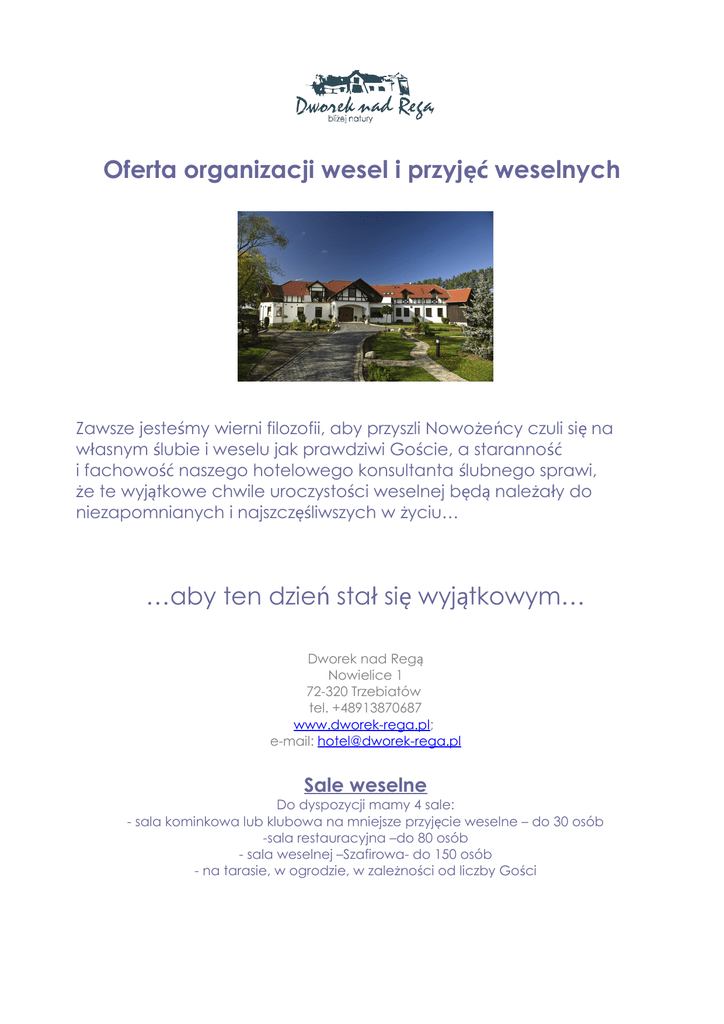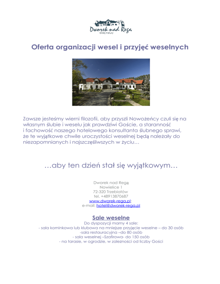 Oferta organizacji wesel i przyjęć weselnych Zawsze jesteśmy wierni filozofii, aby przyszli Nowożeńcy czuli si ę na własnym ślubie i weselu jak prawdziwi Goście, a staranność i fachowość naszego hotelowego konsultanta ślubnego sprawi, że te wyjątkowe chwile uroczystości weselnej będą należały do niezapomnianych i najszczęśliwszych w życiu… …aby ten dzień stał się wyjątkowym… Dworek nad Regą Nowielice 1 72-320 Trzebiatów tel. +48913870687 www.dworek-rega.pl; e-mail: [email protected] Sale weselne Do dyspozycji mamy 4 sale: - sala kominkowa lub klubowa na mniejsze przyj ęcie weselne – do 30 osób -sala restauracyjna –do 80 osób - sala weselnej –Szafirowa- do 150 osób - na tarasie, w ogrodzie, w zależności od liczby Gości Sala weselna- ,,Szafirowa’’ Sala o powierzchni 250 m2, utrzymana w nowoczesnym stylu, przeznaczona jest dla ok. 150 osób. Domieszka starej cegły nawiązuje do pozostałej architektury obiektu. Drewniana konstrukcja sufitu oraz niebiańskie żyrandole tworzą sklepienie dedykowane elementowi powietrza. Sala szafirowa jest miejscem niezapomnianym dla tych, którzy pragną uwiecznić ten jedyny, niepowtarzalny dzień w swoim życiu. Jej położenie oraz wystrój przeniosą gości w magiczną przygodę, w którą Państwo Młodzi będą dalej brnąć przez swoją drogę. Wyjście na taras zbliża do obcowania z łonem natury, gdzie rozległe tereny pełne zieleni oraz blask błękitnego nieba pozwol ą popłynąć duszy i ciału ponad stan otaczającej aury. Sala restauracyjna Sala o powierzchni 160 m. utrzymana jest w przytulnym rustykalnym stylu. Przeznaczona jest maksymalnie dla 80 Gości. We wnętrzach przeważa ciepła paleta barw ecru i lawendy. Szczególną uwagę zwraca drewniana konstrukcja sufitu zmiękczona kryształowymi żyrandolami. Drewniane okna, z których roztacza się piękny krajobraz, zdobią kwiatowe tkaniny. Przyległy do restauracji taras w ciepłe dni unosi aromat kawy i zachwyca pięknem przyrody, przede wszystkim niezapomnianych zachodów, a dla wcześnie wstających, wschodów słońca. Podczas uroczystości Goście weselni również chętnie korzystają z tego uroczego miejsca oddając się rozmowom i kontemplując przyrodę. Sala kominkowa O powierzchni 63 m˛ przeznaczona maksymalnie dla 30 Gości. Sala kominkowa doskonale łączy w sobie drewno jak i biel ścian, których dope łnieniem jest ujmujący prostotą kominek. O powierzchni 50 m˛ przynależy do sali restauracyjnej, choć może również stanowić samodzielne miejsce organizacji uroczystości weselnej. Przeznaczona jest maksymalnie dla 30, a łączenie z restauracją dla 110 osób. Także i w tej sali panuje rustykalny styl, który wprowadza ciepły i sielankowy nastrój wnętrza. Zarówno meble, beżowy kolor ścian, jak i belkowany sufit podkreślają naturalne piękno drewna. Widok z okna, przede wszystkim w letnie miesiące, kipi od barwnych i pachnących rabat kwiatowych Sala klubowa Ślub w plenerze Dookoła dworku roztacza się ogród pełen nastrojowych zakątków. Drzewa, krzewy i rabaty kwiatowe czarują Gościa różnorodnymi kolorami i zapachami. Roślinność nie tylko wiosną i latem przyciąga pięknem swoich barw, ale również zimą zachwyca różnorodnością form. Zarówno taras przy restauracji, jak i przy sali kominkowej często zamienia się w miejsce zaślubin Młodej Pary w obecności urzędnika Stanu Cywilnego oraz zaproszonych Gości. Przygotowanie dekoracji ślubu w plenerze: 1000,00 zł (bez kosztu kwiatów) Nocleg Dworek nad Regą oferuje Gościom 27 pokoi o zróżnicowanej powierzchni, w tym 9 apartamentów: *Pokój 2-osobowy mały o pow. 9-10 m² *Pokój 2-osobowy duży o pow.-13-15 m² *Apartament o pow. 40-45 m² W dniu wesela: *dla Nowożeńców pokój gratis – w przypadku noclegu większości gości * Goście weselni: - osoba w pokoju 1-osobowym – od 140zł do 160zł (w zależności od sezonu) - osoba w pokoju 2-osobowym – 90zł - osoba w pokoju wieloosobowym – 80zł * rabat na nocleg poprzedzający i następujący po weselu – 20% od ceny hotelowej w danym sezonie Menu Alkohol Do wyboru: Do wyboru mamy 3 rodzaje menu - Menu standard 195,00 /osoba - Menu staropolskie 205,00 /osoba - Menu wykwintne 220,00 / osoba W cenie każdego: * powitanie Nowożeńców chlebem i sol ą * obiad serwowany i bufet szwedzki * kawa, herbata w termosach * obsługa kelnerska * koordynacja uroczystości weselnej I opcja- w gestii Klienta; pobieramy opłatę – korkowe w wysokości 10zł od osoby II opcja- w gestii hotelu; hotel nie pobiera opłaty za salę promocyjne ceny alkoholu: * 40,00 zł/ 0,5l wódki *wino białe, czerwone 45,00 zł/ 0,75 l *wino musujące 20,00 zł/ 0,7l Napoje bezalkoholowe - w zakres menu wchodzi 1 litr soku / osoba - pozostałe soki 10,00zł /litr * herbata i kawa w termosach- bez ograniczeń * inne napoje do uzgodnienia Ciasto W zakres menu nie wchodzą ciasta. Tort weselny- polecamy torty Piekarni – Cukierni Krerowicz w Mrzeżynie Tel. +48 501 569 283 Dekoracja Rustykalne wnętrza dworku wraz z ciepłą paletą barw doskonale współgrają ze ślubn ą, przeważającą w bieli dekoracją. Śnieżnobiałe obrusy, pokrowce na krzesła, świece oraz kwiaty to tylko niektóre elementy tworzące uroczystą atmosferę tego wyjątkowego dnia. Ustawienie stołów do uzgodnienia. O końcowym efekcie decydują szczegóły, dlatego te ż dekoracja weselna jest sum ą wizji przyszłych Nowożeńców oraz zawsze służącego swoim doświadczeniem i rad ą konsultanta ślubnego. Wykonanie dekoracji Sali weselnej: 1500, 00 zł ( bez kosztu kwiatów, świec i indywidualnych zamówień). Oprawa muzyczna, fotograf W gestii Klienta. Chętnie pośredniczymy w nawiązaniu współpracy. Polecamy romantyczny koncert w plenerze w wykonaniu profesjonalnego pianisty. W programie znane i lubiane standardy muzyki rozrywkowej zarówno polskiej jak i zagranicznej. Dodatkowe atrakcje *Pokaz sztucznych ogni Pro