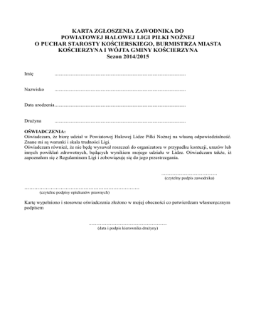 KARTA ZGŁOSZENIA ZAWODNIKA DO POWIATOWEJ HALOWEJ LIGI PIŁKI NOŻNEJ O PUCHAR STAROSTY KOŚCIERSKIEGO, BURMISTRZA MIASTA KOŚCIERZYNA I WÓJTA GMINY KOŚCIERZYNA Sezon 2014/2015 Imię .......................................................................................................... Nazwisko .......................................................................................................... Data urodzenia .......................................................................................................... Drużyna .......................................................................................................... OŚWIADCZENIA: Oświadczam, że biorę udział w Powiatowej Halowej Lidze Piłki Nożnej na własną odpowiedzialność. Znane mi są warunki i skala trudności Ligi. Oświadczam również, że nie będę wysuwał roszczeń do organizatora w przypadku kontuzji, urazów lub innych powikłań zdrowotnych, będących wynikiem mojego udziału w Lidze. Oświadczam także, iż zapoznałem się z Regulaminem Ligi i zobowiązuję się do jego przestrzegania. ............................................. (czytelny podpis zawodnika) ……………………………………………………………. (czytelne podpisy opiekunów prawnych) Kartę wypełniono i stosowne oświadczenia złożono w mojej obecności co potwierdzam własnoręcznym podpisem ............................................................... (data i podpis kierownika drużyny)