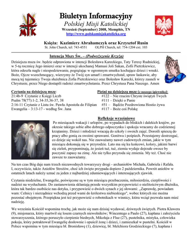 Biuletyn Informacyjny Polskiej Misji Katolickiej Wrzesień (September) 2008, Memphis, TN http://www.polskamisjakatolicka.org Księża: Kazimierz Abrahamczyk oraz Krzysztof Rusin St. John Church, tel: 743-4551 OLPH Church, tel: 754-1204 ext. 103 Intencja Mszy Św. – (Podwyższenie Krzyża) Dzisiejsza msza św. będzie odprawiona w intencji Bolesława Kareckiego, Taty Teresy Rudnickiej, w 5-tą rocznicę Jego śmierci oraz w intencji ukochanej Mamusi Joli Sakan, Zofii Pietrzkiewicz, która odeszła nagle i niespodziewanie, pogrążając w ogromnym smutku kochające dzieci i wnuki. Boże, Ojcze wszechmogący, wierzymy że Twój syn umarł i zmartwychstał, spraw łaskawie, aby mocą tej tajemnicy Twoja służebnica Zofia Pietrzkiewicz oraz Bolesław Karecki, którzy zasneli w Chrystusie, przez Niego dostapili radości zmartwychstania. Przez Chrystusa Pana Naszego. Amen Czytania na dzisiejszą mszę: Pieśni na dzisiejszą mszę (z naszego śpiewnika): 21:4b-9 Czytanie z Księgi Liczb #122 – Nie rzucim Chryste świątyń Twych Psalm 78(77):1-2, 34-35,36-37, 38 #111 – Dzięki o Panie 2:16-11 Czytanie z Listu św. Pawła Apostoła do Filipian #51 – Bądźże Pozdrowiona Hostio żywa Ewangelia – 3:13-17 - według Św. Jana #117 – Boże coś Polskę Refleksje wrześniowe Po miesiącach wakacji i urlopów, po wypadach do bliskich i dalekich krajów, po okresie takiego sobie albo dobrego odpoczynku i spokoju wracamy do codziennej krzątaniny. Dzieci i młodzież wracają do szkoły i swoich zajęć. Dorośli spieszą do pracy albo gonią za swoimi sprawami. Gonitwa i pośpiech. Przestajemy dostrzegać, co dzieje się wokół nas. Nie zauważamy nawet cudownych zmian, jakie w tym miesiącu dokonują się w przyrodzie. Lato ma się ku końcowi, kolory, jakimi barwi się zieleń, przypominają, że jesień tuż, tuż, ziemia wydaje dojrzałe owoce by poczynić zapasy na zimę. Ale nie tylko przyroda się zmienia. My też. Choć nie zawsze to zauważamy. Na ten czas Bóg daje nam trzech niezawodnych towarzyszy drogi - archaniołów Michała, Gabriela i Rafała. I, oczywiście, także Aniołów Strożów, choć ich święto przypada dopiero 2 października. Powrót aniołów w ostatnich latach należy uznać za jeden z najbardziej zdumiewających i interesujących zjawisk. Czytania niedzielne, Ewangelie, poświęcone są w tym miesiącu przebaczeniu, miłosierdziu, cierpliwości i nadziei na wysłuchanie. Do zastanowienia skłaniają przede wszystkim przypowieści o nielitościwym dłużniku, która tak bardzo osobiście nas dotyka, i przypowieść o dwóch synach z jej słowami: ,,Zaprawdę, powiadam wam: Celnicy i nierządnice wchodzą przed wami do królestwa niebieskiego", wobec których nie można pozostać obojętnym. Przepiękna jest też przypowieść o robotnikach w winnicy, która wciąż pozwala nam mieć nadzieję. We wrześniu Kościół wspomina trochę, jak może się nam dzisiaj wydawać, dziwnych świętych. Piotra Klawera (9), misjonarza, który martwił się losem czarnych niewolników; Wincentego a Paulo (27), kapłana i założyciela stowarzyszenia, którego poruszyło cierpienie biednych, Mikołaja z Flue (27), pustelnika, mistyka, człowieka pokoju, który potraktował Ewangelię dosłownie i opuścił żonę i dzieci, i zamieszkał w pustelni. Kościół w Polsce wspomina w tym miesiącu bł. Bronisławę (1), dziewicę, bł. Melchiora Grodzieckiego (7), kapłana i męczennika, św. Stanisława Kostkę (18), patrona Polski, bł. Władysława z Gielniowa (25), kapłana, patrona Warszawy. We wrześniu przypadają trzy święta maryjne, Narodzenia Najświętszej Maryi Panny (8), Najświętszego Imienia Maryi (12), Najświętszej Maryi Panny bolesnej (15), oraz święto Podwyższenia Krzyża Swiętego. „Wywyższenie” Jezusa na krzyżu, które przede wszystkim jest upokorzeniem na palu hańby, w ostatecznym i najgłębszym sensie jest triumfem miłości. To, co przynosi śmierć, prowadzi do zbawienia nas wszystkich. Z drugiej strony, wielu już z nas doświadczyło, że kto ucieka od krzyża, ten na swej drodze spotka krzyż jeszcze większy. Krzyż jest drzewem, którego cień skrywa nasze cienie. W nim też zaczyna się rozpalać dla nas światło. Ks. Kazimierz Abrahamczyk svd Serdecznie Dziękuje ! Chciałbym bardzo serdecznie podziękować wszystkim, a w szczególności tym wymienionym osobom: Edward Nowakowski, Mike Meeks, Teresa Rudnicki, Krystyna Zawada, Kazia i Magda Szymanek, Danuta Misiuń, Marianna Golińska, Krystyna i Monika Milczek, Jadwiga Grabowicz, Stefania Niewiara, Joanna Kornas, Iwona Pietrzak, Zofia Gruszczyńska, Maria Śnieżek, Janina Pałęga, Tania Czerny & Zofia Schmidt, za trud i pracę jakią włożyły w uświetnienie mojej uroczystości Święceń Diakonatu w dniu 9 sierpnia w parafii Św. Anny w Bartlett. Dziękuję za Wasze ciepłe słowa i modlitwę. Bóg Zapłać ! Ze swej strony pragnę to odwzajamnić polecając Was i Wasze Rodziny opiece Pana Boga przez wstawiennictwo Matki Najświętszej w moich codziennych modlitwach. Diakon, Jacek Kowal Kącik Finansowy Wydatki za okres ostatnich 2 miesiecy: - $855 –Przygotowanie uroczystości i prezent dla J. Kowala, kwiaty na ołtarz, jedzenie na piknik w kościele św. Jana oraz półki do pomieszczenia gospodarczego. Msze Św. w 2008 Roku Kalendarz mszy świętych na nadchodzące miesiące: Pażdziernik Listopad Listopad Listopad Grudzień 11 1 Święto Zmarłych 15 Święto Niepodległości 22 Św. Cecyli patronki muzyków 24 25 27 Ogłoszenia: 1) – Zamawiamy suszone grzyby – Planujemy zamowić suszone grzyby z Chicago na okres świąteczny. Prosimy dzwonić (do końca września) w celu wcześniejszego obliczenia potrzebnej ilości zamówienia. Telefon: Teresa 377-1505 lub Zosia: 372-5794