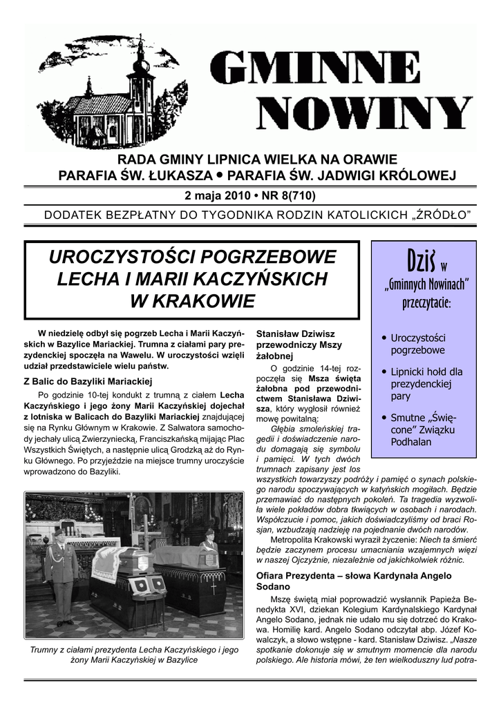 RADA GMINY LIPNICA WIELKA NA ORAWIE PARAFIA ŚW. ŁUKASZA • PARAFIA ŚW. JADWIGI KRÓLOWEJ 2 maja 2010 • NR 8(710) DODATEK BEZPŁATNY DO TYGODNIKA RODZIN KATOLICKICH „ŹRÓDŁO” UROCZYSTOŚCI POGRZEBOWE LECHA I MARII KACZYŃSKICH W KRAKOWIE W niedzielę odbył się pogrzeb Lecha i Marii Kaczyńskich w Bazylice Mariackiej. Trumna z ciałami pary prezydenckiej spoczęła na Wawelu. W uroczystości wzięli udział przedstawiciele wielu państw. Z Balic do Bazyliki Mariackiej Po godzinie 10-tej kondukt z trumną z ciałem Lecha Kaczyńskiego i jego żony Marii Kaczyńskiej dojechał z lotniska w Balicach do Bazyliki Mariackiej znajdującej się na Rynku Głównym w Krakowie. Z Salwatora samochody jechały ulicą Zwierzyniecką, Franciszkańską mijając Plac Wszystkich Świętych, a następnie ulicą Grodzką aż do Rynku Głównego. Po przyjeździe na miejsce trumny uroczyście wprowadzono do Bazyliki. Stanisław Dziwisz przewodniczy Mszy żałobnej Dzis w „Gminnych Nowinach” przeczytacie: • Uroczystości pogrzebowe O godzinie 14-tej roz• Lipnicki hołd dla poczęła się Msza święta prezydenckiej żałobna pod przewodnipary ctwem Stanisława Dziwisza, który wygłosił również • Smutne „Święmowę powitalną: Głębia smoleńskiej tracone” Związku gedii i doświadczenie naroPodhalan du domagają się symbolu i pamięci. W tych dwóch trumnach zapisany jest los wszystkich towarzyszy podróży i pamięć o synach polskiego narodu spoczywających w katyńskich mogiłach. Będzie przemawiać do następnych pokoleń. Ta tragedia wyzwoliła wiele pokładów dobra tkwiących w osobach i narodach. Współczucie i pomoc, jakich doświadczyliśmy od braci Rosjan, wzbudzają nadzieję na pojednanie dwóch narodów. Metropolita Krakowski wyraził życzenie: Niech ta śmierć będzie zaczynem procesu umacniania wzajemnych więzi w naszej Ojczyźnie, niezależnie od jakichkolwiek różnic. Ofiara Prezydenta – słowa Kardynała Angelo Sodano Trumny z ciałami prezydenta Lecha Kaczyńskiego i jego żony Marii Kaczyńskiej w Bazylice Mszę świętą miał poprowadzić wysłannik Papieża Benedykta XVI, dziekan Kolegium Kardynalskiego Kardynał Angelo Sodano, jednak nie udało mu się dotrzeć do Krakowa. Homilię kard. Angelo Sodano odczytał abp. Józef Kowalczyk, a słowo wstępne - kard. Stanisław Dziwisz. „Nasze spotkanie dokonuje się w smutnym momencie dla narodu polskiego. Ale historia mówi, że ten wielkoduszny lud potra- 2 maja 2010 GMINNE NOWINY fił zawsze właściwie zareagować w chwili próby. Oby ten naród trwał w jedności, aby zapewnić wraz z innymi narodami światu wejście w erę nowej cywilizacji. Kardynał wyraził życzenie: Oby ofiara prezydenta przyczyniła się do budowania lepszej zjednoczonej Europy i świata. W świątyni było około 700 gości z najważniejszych delegacji. Pozostali goście specjalni otrzymali miejsca siedzące przed Bazyliką. Mowa pożegnalna Bronisława Komorowskiego Wystąpienia pożegnalne wygłosił m.in. marszałek Sejmu Bronisław Komorowski oraz szef NSZZ „Solidarność” Janusz Śniadek. Marszałek Sejmu Bronisław Komorowski pełniący obecnie funkcje prezydenta przypomniał, iż prezydent Kaczyński zaczął swoją służbę w latach 70-tych jako działacz opozycji antykomunistycznej. Bronisław Komorowski podkreślił, że musimy wypełnić testament Lecha Kaczyńskiego, który zabiegał o prawdę o zbrodni katyńskiej, gdyż zdaniem marszałka zachowywanie pamięci o zbrodni katyńskiej to sprawą fundamentalną dla III Rzeczpospolitej. Marszałek Sejmu podziękował też tym Rosjanom, którzy w szczery i spontaniczny sposób wyrażali współczucie Polakom, pogrążonym w żałobie po tragedii pod Smoleńskiem. Panie prezydencie przed Panem już ostatnia droga. Droga ostatnia, ale piękna- dodał. NR 8(710)/ tłumach w Warszawie i pod Wawelem - apelował Janusz Śniadek. W Bazylice odbył się koncert Filharmoników Berlińskich jako wyraz hołdu rządu i narodu niemieckiego dla ofiar katastrofy lotniczej pod Smoleńskiem. Kondukt żałobny z Bazyliki Mariackiej na Wawel Po 2,5 godzinach uroczysty orszak żałobny przeszedł ulicą Grodzką wprost do Katedry na Wawelu. Kondukt liczył 300-400 osób, przewodniczyło duchowieństwo, następnie wojsko. Bezpośrednio za trumnami podążała rodzina i przyjaciele zmarłych oraz przedstawiciele władz RP, przedstawiciele władz Krakowa i Małopolski, rektorzy uczelni, generalicja, Bractwo Kurkowe. Po przejściu konduktu autokary przewiozły delegacje zagraniczne na Wawel. Ze względów bezpieczeństwa nikt z zagranicznych gości nie szedł w kondukcie. Kiedy kondukt dotarł w okolice Krzyża Katyńskiego, zaczął bić Dzwon Zygmunta. Przestał bić, kiedy trumny wniesiono do katedry. Następnie Metropolita Krakowski Kardynał Stanisław Dziwisz poprowadził uroczystość liturgicznego pożegnania Pary Prezydenckiej. Sarkofag, w którym spoczęli Lech i Maria Kaczyńscy. W ostatnim pożegnaniu uczestniczyła tylko bliska rodzina. Ludzie zebrani na Rynku Głównym w Krakowie, podczas uroczystości pogrzebowych prezydenta Lecha Kaczyńskiego i jego małżonki Marii Kaczyńskiej Janusz Śniadek – Lech Kaczyński to „człowiek Solidarności” Przewodniczący „Solidarności” tak mówił o zmarłym prezydencie: Lech Kaczyński jak nikt dochował wierności wartościom Solidarności; z dumą będziemy o nim mówić „człowiek Solidarności”. Solidarność upomniała się o wolność, o sprawiedliwość społeczną i o obecność krzyża w życiu publicznym. Tym wartościom dochowałeś wierności jak nikt. Dlatego jak zawsze z dumą będziemy mówić o tobie „człowiek Solidarności” – dodał. Drodzy przyjaciele z całego świata, proszę was, powiedzcie wszystkim, jak Lech Kaczyński kochał prawdę, jak o nią walczył, powiedzcie o tych Kraków, 18.04.2010. Sarkofag w krypcie pod wieżą Srebrnych Dzwonów w wawelskiej katedrze, w którym 18 bm. p
