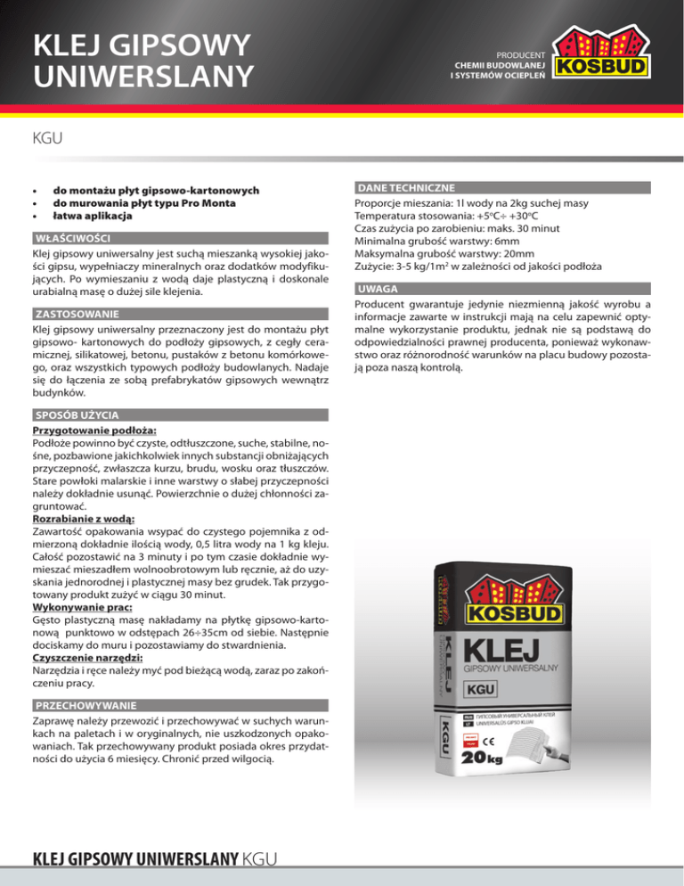 KLEJ GIPSOWY UNIWERSLANY PRODUCENT CHEMII BUDOWLANEJ I SYSTEMÓW OCIEPLEŃ KGU • • • do montażu płyt gipsowo-kartonowych do murowania płyt typu Pro Monta łatwa aplikacja WŁAŚCIWOŚCI Klej gipsowy uniwersalny jest suchą mieszanką wysokiej jakości gipsu, wypełniaczy mineralnych oraz dodatków modyfikujących. Po wymieszaniu z wodą daje plastyczną i doskonale urabialną masę o dużej sile klejenia. ZASTOSOWANIE Klej gipsowy uniwersalny przeznaczony jest do montażu płyt gipsowo- kartonowych do podłoży gipsowych, z cegły ceramicznej, silikatowej, betonu, pustaków z betonu komórkowego, oraz wszystkich typowych podłoży budowlanych. Nadaje się do łączenia ze sobą prefabrykatów gipsowych wewnątrz budynków. SPOSÓB UŻYCIA Przygotowanie podłoża: Podłoże powinno być czyste, odtłuszczone, suche, stabilne, nośne, pozbawione jakichkolwiek innych substancji obniżających przyczepność, zwłaszcza kurzu, brudu, wosku oraz tłuszczów. Stare powłoki malarskie i inne warstwy o słabej przyczepności należy dokładnie usunąć. Powierzchnie o dużej chłonności zagruntować. Rozrabianie z wodą: Zawartość opakowania wsypać do czystego pojemnika z odmierzoną dokładnie ilością wody, 0,5 litra wody na 1 kg kleju. Całość pozostawić na 3 minuty i po tym czasie dokładnie wymieszać mieszadłem wolnoobrotowym lub ręcznie, aż do uzyskania jednorodnej i plastycznej masy bez grudek. Tak przygotowany produkt zużyć w ciągu 30 minut. Wykonywanie prac: Gęsto plastyczną masę nakładamy na płytkę gipsowo-kartonową punktowo w odstępach 26÷35cm od siebie. Następnie dociskamy do muru i pozostawiamy do stwardnienia. Czyszczenie narzędzi: Narzędzia i ręce należy myć pod bieżącą wodą, zaraz po zakończeniu pracy. PRZECHOWYWANIE Zaprawę należy przewozić i przechowywać w suchych warunkach na paletach i w oryginalnych, nie uszkodzonych opakowaniach. Tak przechowywany produkt posiada okres przydatności do użycia 6 miesięcy. Chronić przed wilgocią. KLEJ GIPSOWY UNIWERSLANY KGU DANE TECHNICZNE Proporcje mieszania: 1l wody na 2kg suchej masy Temperatura stosowania: +5oC÷ +30oC Czas zużycia po zarobieniu: maks. 30 minut Minimalna grubość warstwy: 6mm Maksymalna grubość warstwy: 20mm Zużycie: 3-5 kg/1m2 w zależności od jakości podłoża UWAGA Producent gwarantuje jedynie niezmienną jakość wyrobu a informacje zawarte w instrukcji mają na celu zapewnić optymalne wykorzystanie produktu, jednak nie są podstawą do odpowiedzialności prawnej producenta, ponieważ wykonawstwo oraz różnorodność warunków na placu budowy pozostają poza naszą kontrolą. KLEJ GIPSOWY UNIWERSLANY KGU Niniejsza karta techniczna produktu jest obowiązująca i zastępuje wszystkie poprzednie. Wyrób dopuszczony do obrotu i powszechnego stosowania w budownictwie. Dziękowizna, dnia 30.07.2013. KLEJ GIPSOWY UNIWERSLANY KGU PRODUCENT CHEMII BUDOWLANEJ I SYSTEMÓW OCIEPLEŃ