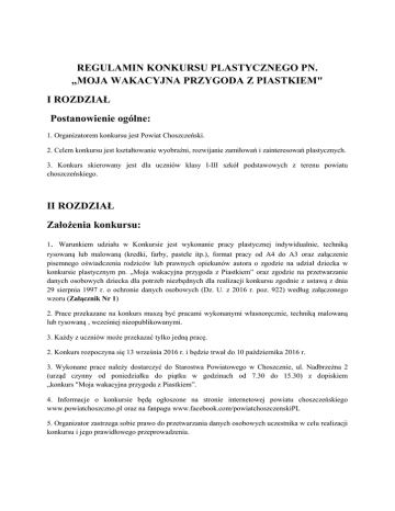 REGULAMIN KONKURSU PLASTYCZNEGO PN. „MOJA WAKACYJNA PRZYGODA Z PIASTKIEM" I ROZDZIAŁ Postanowienie ogólne: 1. Organizatorem konkursu jest Powiat Choszczeński. 2. Celem konkursu jest kształtowanie wyobraźni, rozwijanie zamiłowań i zainteresowań plastycznych. 3. Konkurs skierowany jest dla uczniów klasy I-III szkół podstawowych z terenu powiatu choszczeńskiego. II ROZDZIAŁ Założenia konkursu: 1. Warunkiem udziału w Konkursie jest wykonanie pracy plastycznej indywidualnie, techniką rysowaną lub malowaną (kredki, farby, pastele itp.), format pracy od A4 do A3 oraz załączenie pisemnego oświadczenia rodziców lub prawnych opiekunów autora o zgodzie na udział dziecka w konkursie plastycznym pn. „Moja wakacyjna przygoda z Piastkiem” oraz zgodzie na przetwarzanie danych osobowych dziecka dla potrzeb niezbędnych dla realizacji konkursu zgodnie z ustawą z dnia 29 sierpnia 1997 r. o ochronie danych osobowych (Dz. U. z 2016 r. poz. 922) według załączonego wzoru (Załącznik Nr 1) 2. Prace przekazane na konkurs muszą być pracami wykonanymi własnoręcznie, techniką malowaną lub rysowaną , wcześniej nieopublikowanymi. 3. Każdy z uczniów może przekazać tylko jedną pracę. 2. Konkurs rozpoczyna się 13 września 2016 r. i będzie trwał do 10 października 2016 r. 3. Wykonane prace należy dostarczyć do Starostwa Powiatowego w Choszcznie, ul. Nadbrzeżna 2 (urząd czynny od poniedziałku do piątku w godzinach od 7.30 do 15.30) z dopiskiem „konkurs "Moja wakacyjna przygoda z Piastkiem”. 4. Informacje o konkursie będą ogłoszone na stronie internetowej powiatu choszczeńskiego www.powiatchoszczno.pl oraz na fanpagu www.facebook.com/powiatchoszczenskiPL 5. Organizator zastrzega sobie prawo do przetwarzania danych osobowych uczestnika w celu realizacji konkursu i jego prawidłowego przeprowadzenia. 6. Każdy uczestnik konkursu powinien opatrzyć swoimi danymi: imię i nazwisko autora, wiek, klasa, nazwa szkoły, telefon kontaktowy. Prace, które nie będą spełniały podanych warunków nie będą zakwalifikowane do konkursu. 7. Naruszenie przez uczestnika konkursu któregokolwiek z warunków konkursu oznaczać będzie nie zakwalifikowanie pracy do konkursu lub utratę prawa do nagrody. 8. Rozstrzygnięcie konkursu nastąpi w październiku 2016 r. 9. Wręczenie nagród nastąpi w listopadzie 2016 r. 9. Organizator zastrzega, że prace biorące udział w konkursie stają się jego własnością, w szczególności na organizatora przenoszone są autorskie prawa majątkowe na wszystkich polach eksploatacji. III ROZDZIAŁ Komisja, kryteria oceny, wyniki: 1. Ocena prac i przyznanie nagród zostanie dokonane przez Komisję Konkursową powołaną przez Organizatora. 2. W przypadku równej ilości głosów decydujący głos ma Przewodniczący Komisji Konkursowej. 3. Komisja dokona oceny prac nie później niż końca października 2016 r. i spośród przekazanych prac plastycznych wyłoni laureatów konkursu, którym zostaną wręczone nagrody w poszczególnych kategoriach wiekowych, tj. klasa I - I, II i III miejsce; klasa II - I, II, III miejsce; klasa III - I, II, III miejsce. Do każdej kategorii wiekowej komisja może przyznać maksymalnie po trzy wyróżnienia. 4. Decyzja komisji jest ostateczna. 5. Wszyscy uczestnicy konkursu otrzymają pamiątkowe dyplomy. 6. Informacja o wynikach konkursu oraz o miejscu i czasie rozdania nagród zostanie umieszczona na stronie internetowej Starostwa Powiatowego w Choszcznie www.powiatchoszczno.pl oraz fanpage’u: www.facebook.com/powiatchosszczenskiPL. 7. Uczestnictwo w konkursie jest bezpłatne. IV ROZDZIAŁ Postanowienia końcowe: 1. Przekazując pracę na konkurs, uczestnik zgadza się na ekspozycję pracy na stronie internetowej Starostwa Powiatowego w Choszcznie oraz fanpagu: www.facebook.com/powiatchoszczenskiPL 2. Biorąc udział w konkursie, uczestnik akceptuje jego regulamin. 3. Organizator zastrzega sobie prawo do: a) zmiany postanowień niniejszego regulaminu w przypadku istotnych zdarzeń mających wpływ na organizowanie konkursu, b) odstąpienia od organizowania konkursu bez podania przyczyny, c) nierozstrzygnięcia konkursu w przypadku zbyt małej ilości przekazanych prac. 4. Dane osobowe uczestników pozyskane są wyłącznie do celów konkursu i nie będą udostępniane podmiotom trzecim. 5. Szczegółowych informacji i wyjaśnień udzielą pracownicy Starostwa Powiatowego w Choszcznie Wydziału Edukacji, Kultury i Sportu pod numerem telefonu: 95 748 89 32