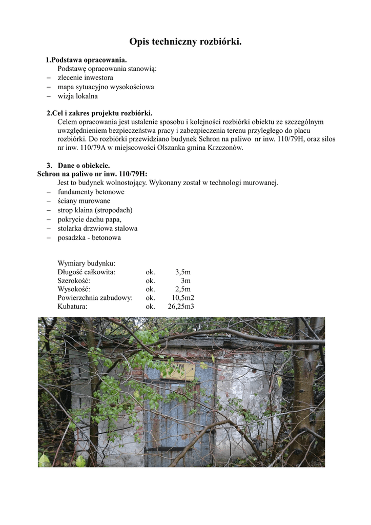 Opis techniczny rozbiórki. 1.Podstawa opracowania. Podstawę opracowania stanowią: zlecenie inwestora mapa sytuacyjno wysokościowa wizja lokalna 2.Cel i zakres projektu rozbiórki. Celem opracowania jest ustalenie sposobu i kolejności rozbiórki obiektu ze szczególnym uwzględnieniem bezpieczeństwa pracy i zabezpieczenia terenu przyległego do placu rozbiórki. Do rozbiórki przewidziano budynek Schron na paliwo nr inw. 110/79H, oraz silos nr inw. 110/79A w miejscowości Olszanka gmina Krzczonów. 3. Dane o obiekcie. Schron na paliwo nr inw. 110/79H: Jest to budynek wolnostojący. Wykonany został w technologi murowanej. fundamenty betonowe ściany murowane strop klaina (stropodach) pokrycie dachu papa, stolarka drzwiowa stalowa posadzka - betonowa Wymiary budynku: Długość całkowita: Szerokość: Wysokość: Powierzchnia zabudowy: Kubatura: ok. ok. ok. ok. ok. 3,5m 3m 2,5m 10,5m2 26,25m3 Silos nr inw. 110/79A: fundamenty betonowe ściany betonowe Wymiary budynku: Długość całkowita: Szerokość: Wysokość nadziemia: Wysokość do terenu gruntu Powierzchnia zabudowy: ok. ok. ok. ok. ok. 4,7m 3m 0,5m 1,5m 14,1m2 4. Wstępne czynności przed przystąpieniem do rozbiórki budynku. Uzyskać zgodę na rozbiórkę obiektów Powiadomić właściwe organy w przepisowym terminie o rozpoczęciu rozbiórki Powiadomić właścicieli sąsiednich posesji o terminie rozbiórki Zabezpieczyć teren rozbiórki oraz oznakować tablicami ostrzegawczymi. Przygotować miejsce składowania materiałów z rozbiórki i uzgodnić z odpowiednimi instytucjami i zarządcami miejsca ich wywozu. Zapoznać pracowników z projektem rozbiórki i przeszkolić pod względem BHP. 5. Ogólne zasady wykonywania prac rozbiórkowych. Roboty rozbiórkowe należy prowadzić zgodnie z zasadami stopniowego zmniejszania obciążenia elementów konstrukcyjnych. Plac rozbiórki należy wygrodzić i oznakować tak, aby stanowiło to zabezpieczenie przed dostępem osób postronnych. Przed przystąpieniem do robót rozbiórkowych pracownicy powinni być zapoznani z projektem rozbiórki i poinstruowani na stanowisku pracy o bezpiecznym sposobie jej wykonania, przestrzegając przepisów BHP, zawartych w Rozporządzeniu Ministra Infrastruktury z dnia 06.02.2003 roku w sprawie bezpieczeństwa i higieny pracy przy wykonywaniu robót budowlanych. Poszczególne elementy budynku należy rozbierać tak, aby nie wywołać nieprzewidzianego spadania lub zawalenia się innych elementów. Obalanie ścian przez ich podkopywanie lub ich podcinanie jest zabronione. W czasie rozbiórki zabroniony jest pobyt innych pracowników pod rozbieranymi elementami. Podczas wiatru o prędkości większej niż 10m/s, deszczu, śnieżycy oraz po zmroku należy wstrzymać prace rozbiórkowe. Prowadzenie prac przy świetle sztucznym jest zabronione. Miejsce i sposób ustawienia oraz oparcia drabin i innych narzędzi pomocniczych (pomostów, rusztowań, itp.) powinno być wskazane przez kierownika lub mistrza budowlanego. Roboty rozbiórkowe powinny być prowadzone tak, aby zapewnić ewentualny odzysk materiałów rozbiórkowych, nadających się do ponownego użycia. Rusztowanie i pomosty robocze powinny posiadać zabezpieczenia zgodne z przepisami BHP, obowiązującymi przy pracach na wysokościach. Wszystkie wykonane zabezpieczenia powinny być odebrane przez inspektora BHP i inspektora nadzoru. 6. Kolejność wykonywania robót rozbiórkowych. Przed przystąpieniem do rozbiórki obiektów należy usunąć wszystkie przedmioty niezwiązane trwale z budynkami (elementy wyposażenia, śmieci, itp.). Roboty rozbiórkowe należy prowadzić w następującej kolejności: Instalacje i sieci: Przed demontażem instalacji elektrycznej należy sprawdzić czy zostały odłączone od sieci zewnętrznej, co jest warunkiem niezbędnym do demontażu instalacji wewnętrznej. Rozbiórkę prowadzić od góry odspajając pojedyncze cegły. Dach: Rozbiórkę rozpocząć od zdjęcia pokrycia dachowego, zgodnie z wymogami zawartymi w punkcie 4, niniejszego opracowania. Po rozebraniu pokrycia dachu zrywa się następnie warstwę betonu wyrównawczego za pomocą ręcznych młotów udarowych lub obrotowoudarowych oraz warstwę spadkową. Warstwę spadkową opuszczać na dół poprzez zastosowanie rynien zsypowych. Rynny zsypowe powinny mieć zabezpieczenie przed wypadaniem żużla. Przy rozbiórce stropów konieczne jest podstemplowanie wszystkich płyt przy ścianach. Rozbiórkę prowadzi się przez rozbijanie betonu płyt na długości zabetonowanych kanałów oraz usuwa się beton z pachwin płyt stropowych oraz wieńców na obwodzie dachu i ze ścian nośnych budynku wraz ze zbrojeniem. Płyty dachowe można demontować poprzez podniesienie przez żuraw lub poprzez rozbicie płyt za pomocą koparki z młotem udarowym. Przed przystąpieniem do rozbijania płyt zleca się wybić cztery otwory miedzy żebrami, które posłużą do zamocowania wieszaków przy podnoszeniu płyty przez żuraw. Decyzję pozostawia się wykonawcy rozbiórki. Ściany murowane: Ściany wewnętrzne rozbierać warstwami o odpowiedniej wysokości do poziomu podłogi . Następnie przystąpić do rozbiórki ścian zewnętrznych. Fundamenty i ściany fundamentowe: Po wykonaniu wykopów i określeniu głębokości posadowienia fundamentów przystąpić do rozbiórki ścian fundamentowych. Prowadzić ręcznie przy użyciu sprzętu z udarem. Zasypanie wykopów z zagęszczaniem należy wykonać warstwami, które winny być sukcesywnie zagęszczane. 7. Warunki techniczne prowadzenia robót oraz przestrzegania przepisów BHP. Prace rozbiórkowe powinny być prowadzone pod bezpośrednim nadzorem kierownika robót rozbiórkowych posiadającego właściwe uprawnienia budowlane. Należy prowadzić dziennik rozbiórki z przestrzeganiem przepisów BHP. Wszelkie niejasności w zakresie spraw technicznych związanych z rozbiórką należy rozpatrywać z udziałem Inspektora Nadzoru. Gruz i odpady oraz materiały w przypa