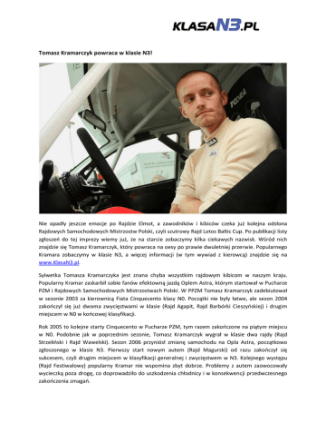 Tomasz Kramarczyk powraca w klasie N3! Nie opadły jeszcze emocje po Rajdzie Elmot, a zawodników i kibiców czeka już kolejna odsłona Rajdowych Samochodowych Mistrzostw Polski, czyli szutrowy Rajd Lotos Baltic Cup. Po publikacji listy zgłoszeń do tej imprezy wiemy już, że na starcie zobaczymy kilka ciekawych nazwisk. Wśród nich znajdzie się Tomasz Kramarczyk, który powraca na oesy po prawie dwuletniej przerwie. Popularnego Kramara zobaczymy w klasie N3, a więcej informacji (w tym wywiad z kierowcą) znajdzie się na www.KlasaN3.pl. Sylwetka Tomasza Kramarczyka jest znana chyba wszystkim rajdowym kibicom w naszym kraju. Popularny Kramar zaskarbił sobie fanów efektowną jazdą Oplem Astra, którym startował w Pucharze PZM i Rajdowych Samochodowych Mistrzostwach Polski. W PPZM Tomasz Kramarczyk zadebiutował w sezonie 2003 za kierownicą Fiata Cinquecento klasy N0. Początki nie były łatwe, ale sezon 2004 zakończył się już dwoma zwycięstwami w klasie (Rajd Agapit, Rajd Barbórki Cieszyńskiej) i drugim miejscem w N0 w końcowej klasyfikacji. Rok 2005 to kolejne starty Cinquecento w Pucharze PZM, tym razem zakończone na piątym miejscu w N0. Podobnie jak w poprzednim sezonie, Tomasz Kramarczyk wygrał w klasie dwa rajdy (Rajd Strzeliński i Rajd Wawelski). Sezon 2006 przyniósł zmianę samochodu na Opla Astra, początkowo zgłoszonego w klasie N3. Pierwszy start nowym autem (Rajd Magurski) od razu zakończył się sukcesem, czyli drugim miejscem w klasyfikacji generalnej i zwycięstwem w N3. Kolejnego występu (Rajd Festiwalowy) popularny Kramar nie wspomina zbyt dobrze. Problemy z autem zaowocowały wycieczką poza drogę, co doprowadziło do uszkodzenia chłodnicy i w konsekwencji przedwczesnego zakończenia zmagań. Na następny start kierowca musiał czekać aż do Subaru Poland Rally, jednak chyba było warto, bowiem załoga Kramarczyk/Trela zakończyła go na trzecim miejscu w „generalce” i klasie A7. Jeszcze lepiej było podczas Rajdu Krakowskiego, który zakończył się zwycięstwem Tomasza Kramarczyka. Rajd Wisły przyniósł drugie miejsce w PPZM i pierwsze w A7, a na Rajdzie Kaszub popularny Kramar ponownie stanął na najwyższym stopniu podium. Po Rajdzie Śnieżki, ukończonym przez parę Kramarczyk/Trela na trzecim miejscu, pojawiła się realna szansa na zwycięstwo w klasyfikacji generalnej Pucharu PZM. Niestety odwołanie ostatniej rundy sezonu (Rajd Barbórki Cieszyńskiej) sprawiło, że Tomasz Kramarczyk zakończył zmagania na drugim miejscu w „generalce” PPZM i klasie A7. Po sezonie 2006 kierowca podjął decyzję o przejściu do Rajdowych Samochodowych Mistrzostw Polski, do klasy N3. Debiut w RSMP (Rajd Elmot) nie okazał się udany, bowiem zakończył się rozbiciem Opla Astra. W sezonie 2007 Tomasza Kramarczyka i Michała Trelę zobaczyliśmy jeszcze podczas Rajdu Nikon i Rajdu Rzeszowskiego, w których walczyli w N3. Sezon 2008 rozpoczął się dla popularnego Kramara od startu w Rajdzie Magurskim, który wygrał w klasie N3. Po imprezie zainteresowanie zawodnikiem sięgnęło zenitu do tego stopnia, że kibice postanowili powołać do życia akcję Fans for Kramar, mającą na celu zebranie funduszy na jego starty. W międzyczasie Tomasz Kramarczyk wystartował w Rajdzie Krakowskim, którego niestety nie ukończył po awarii skrzyni biegów. Akcja Fans for Kramar nabrała jednak tempa i dla zawodnika zebrano ponad 6000 złotych! Wzrosło również zainteresowanie mediów, a efektem akcji była także pomoc Przemysława Zawady (manager Grzegorza Grzyba) oraz Tomasza Mikołajczyka, właściciela stajni Race Rent. Dzięki ich pomocy Tomasz Kramarczyk zaliczył testy w aucie S1600, a także wystartował w GSMP Załuż oraz w Subaru Poland Rally za kierownicą topowego Mitsubishi Lancera Evo IX. Występ Lancerem był ostatnim startem Tomasza Kramarczyka, jednak rajdowa pauza nie oznaczała całkowitego rozbratu ze sportem. Popularnego Kramara zobaczyliśmy między innymi podczas rajdowej WOŚP, był on także głównym bohaterem efektownej produkcji Join The Chase 2, w której zmierzył się z Piotrem Liberą. Jednak rajdy to sport, który uzależnia i nie można po prostu z nim zerwać. Dlatego też wszystkich kibiców z pewnością ucieszy fakt, że Tomasz Kramarczyk powraca! Załogę Kramarczyk/Trela w dobrze znanym Oplu Astra zobaczymy już podczas szutrowego Rajdu Lotos Baltic Cup, a także w kilku wybranych rundach w dalszej części sezonu. Popularny Kramar powalczy w klasie N3, będąc kolejnym zawodnikiem, który skorzysta z dopuszczenia do niej Opli Astra starszej generacji. Po Rajdzie Lotos na łamach serwisu www.KlasaN3.pl ukaże się także wywiad z Tomaszem Kramarczykiem, który opowie o swoich planach na sezon 2010. Wszystkich kibiców zapraszamy do lektury i zachęcamy do odwiedzania kanału klasy N3 na YouTube, gdzie zebraliśmy najciekawsze video z udziałem Kramara, umieszczone w playliście “Tomasz Kramarczyk“.