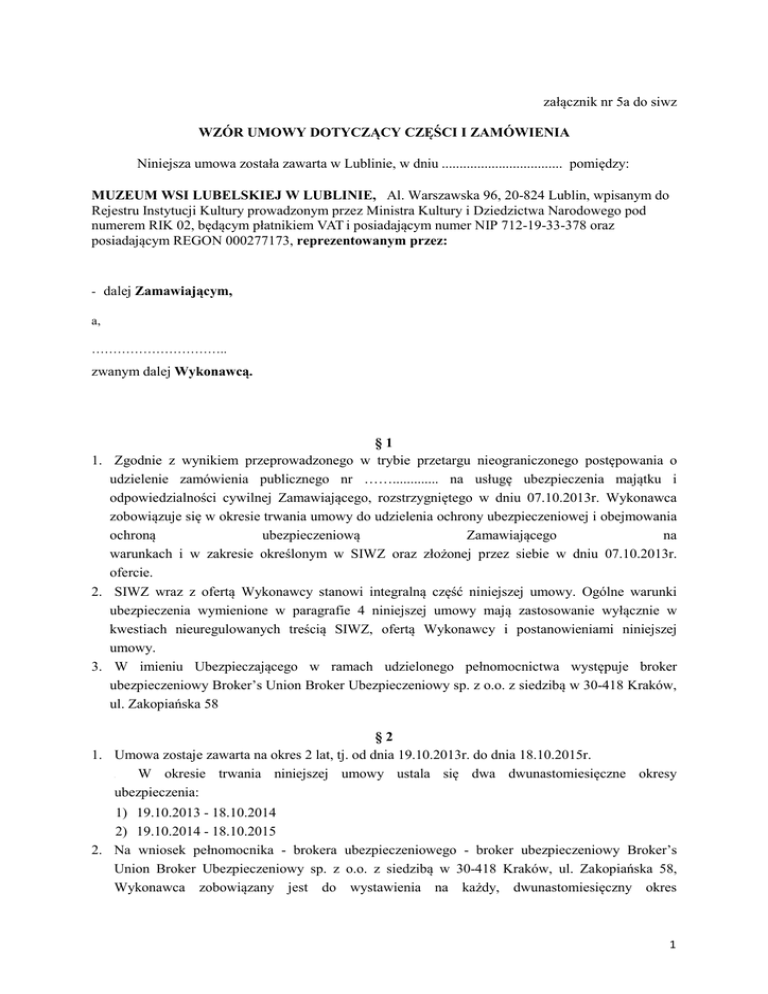 załącznik nr 5a do siwz WZÓR UMOWY DOTYCZĄCY CZĘŚCI I ZAMÓWIEIA Niniejsza umowa została zawarta w Lublinie, w dniu .................................. pomiędzy: MUZEUM WSI LUBELSKIEJ W LUBLIIE, Al. Warszawska 96, 20-824 Lublin, wpisanym do Rejestru Instytucji Kultury prowadzonym przez Ministra Kultury i Dziedzictwa Narodowego pod numerem RIK 02, będącym płatnikiem VAT i posiadającym numer NIP 712-19-33-378 oraz posiadającym REGON 000277173, reprezentowanym przez: - dalej Zamawiającym, a, ………………………….. zwanym dalej Wykonawcą. §1 1. Zgodnie z wynikiem przeprowadzonego w trybie przetargu nieograniczonego postępowania o udzielenie zamówienia publicznego nr ……............. na usługę ubezpieczenia majątku i odpowiedzialności cywilnej Zamawiającego, rozstrzygniętego w dniu 07.10.2013r. Wykonawca zobowiązuje się w okresie trwania umowy do udzielenia ochrony ubezpieczeniowej i obejmowania ochroną ubezpieczeniową Zamawiającego na warunkach i w zakresie określonym w SIWZ oraz złożonej przez siebie w dniu 07.10.2013r. ofercie. 2. SIWZ wraz z ofertą Wykonawcy stanowi integralną część niniejszej umowy. Ogólne warunki ubezpieczenia wymienione w paragrafie 4 niniejszej umowy mają zastosowanie wyłącznie w kwestiach nieuregulowanych treścią SIWZ, ofertą Wykonawcy i postanowieniami niniejszej umowy. 3. W imieniu Ubezpieczającego w ramach udzielonego pełnomocnictwa występuje broker ubezpieczeniowy Broker’s Union Broker Ubezpieczeniowy sp. z o.o. z siedzibą w 30-418 Kraków, ul. Zakopiańska 58 §2 1. Umowa zostaje zawarta na okres 2 lat, tj. od dnia 19.10.2013r. do dnia 18.10.2015r. W okresie trwania niniejszej umowy ustala się dwa dwunastomiesięczne okresy ubezpieczenia: 2. 1) 19.10.2013 - 18.10.2014 2) 19.10.2014 - 18.10.2015 2. Na wniosek pełnomocnika - brokera ubezpieczeniowego - broker ubezpieczeniowy Broker’s Union Broker Ubezpieczeniowy sp. z o.o. z siedzibą w 30-418 Kraków, ul. Zakopiańska 58, Wykonawca zobowiązany jest do wystawienia na każdy, dwunastomiesięczny okres 1 ubezpieczenia stosownych polis, nie później niż na 15 dni przed rozpoczęciem danego okresu ubezpieczenia. 3. Treść polis nie może stać w sprzeczności z treścią SIWZ i ofertą Wykonawcy z zastrzeżeniem zawartym w paragrafie 2 pkt. 6. 4. W drugim 12 - miesięcznym okresie ubezpieczenia sumy ubezpieczenia mienia mogą ulec zmianie ze względu na aktualizację przedmiotu ubezpieczenia dokonywaną: 1) w trakcie trwania umów ubezpieczenia - aktualizacja dotyczy sytuacji powodujących powstanie ryzyka po stronie Zamawiającego lub przeniesienia go na inny podmiot: likwidacja, sprzedaż, przekazanie mienia, zakup mienia, przyjęcie w użytkowanie mienia na podstawie innych umów; rozliczenie składki po aktualizacji przedmiotu ubezpieczenia dokonywane będzie proporcjonalnie co do dnia (w systemie pro rata temporis) przy płatności raty następującej po zaistnieniu w/w sytuacji, 2) przy odnawianiu umów ubezpieczenia - aktualizacja dotyczy sytuacji urealnienia wartości przedmiotu ubezpieczenia, powodujących zmiany sum ubezpieczenia: zmiany rynkowych kosztów odtworzenia mienia; dokumenty aktualizujące przedmiot ubezpieczenia przesyłane będą do Wykonawcy przez pełnomocnika - brokera ubezpieczeniowego nie później niż na 30 dni przed końcem okresu ubezpieczenia bieżących umów ubezpieczenia. 1. 2. 3. 4. 5. §3 Za udzieloną ochronę ubezpieczeniową w pierwszym 12 - miesięcznym okresie ubezpieczenia Zamawiający zapłaci składkę ubezpieczeniową w wysokości: Ubezpieczenie mienia od ognia i innych zdarzeń losowych ........................................................... zł Ubezpieczenie sprzętu elektronicznego od wszystkich ryzyk ........................................................ zł Ubezpieczenie odpowiedzialności cywilnej .................................................................................. zł Składka za kolejny 12 miesięczny okres ubezpieczenia będzie taka sama jak wymieniona w pkt. 1 lub skorygowana jedynie w zakresie wynikającym z przewidzianej niniejszą umową zmiany sum ubezpieczenia. Niedopuszczalna jest zmiana stawek ubezpieczeniowych stosowanych do wyliczenia kwoty składki. Składka płatna będzie w systemie rat półrocznych tj. do ...................., ............. Za dzień zapłaty składki przyjmuje się dzień przelewu środków przez Zamawiającego. Brak zapłaty przez Zamawiającego składki w wyznaczonym terminie nie skutkuje rozwiązaniem niniejszej umowy. Nie daje Wykonawcy także prawa do odmowy wypłaty świadczeń pod warunkiem, że składka zostanie zapłacona przez Zamawiającego w terminie wskazanym przez Wykonawcę w odrębnym piśmie. Termin zapłaty wskazany przez Wykonawcę nie może być krótszy niż 7 dni. §4 1. W sprawach nieuregulowanych w SIWZ, ofercie Wykonawcy i w niniejszej umowie zastosowanie mają: 1) postanowienia ogólnych warunków ubezpieczenia: (wpisać wszystkie ogólne warunki z datami zatwierdzenia przez zarząd ubezpieczyciela i wszystkimi aneksami do OWU jakie będą przywołane przez Wykonawcę) 2 2) przepisy ustawy z dnia 29 stycznia 2004r. Prawo zamówień publicznych (Dz. U. Nr 19, poz. 177 ze zm.), ustawy z dnia 22 maja 2003r. o działalności ubezpieczeniowej (Dz. U. Nr 124, poz. 1151 ze zm.), ustawy z dnia 22 maja 2003r. o ubezpieczeniach obowiązkowych, Ubezpieczeniowym Funduszu Gwarancyjnym i Polskim Biurze Ubezpieczycieli Komunikacyjnych (Dz. U. Nr 124, poz. 1152 ze zm.) oraz przepisy kodeksu cywilnego. 2. Jakiekolwiek zmiany ogólnych warunków ubezpieczenia dokonane przez Wykonawcę po terminie zawarcia niniejszej umowy nie będą miały zastosowania do umowy. 1. 2. §5 Wykonawca będzie wykonywał usługę, o której mowa w paragrafie 1 pkt. 1 niniejszej umowy z zachowaniem zasad należnej staranności. Wierzytelności wynikające z umowy, dotyczące rozliczeń pomiędzy Zamawiającym, a Wykonawcą nie mogą być zbyte na rzecz os
