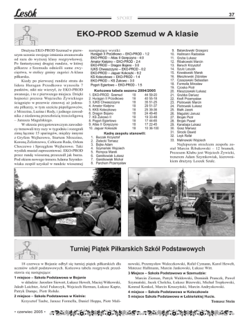 37 sport EKO-PROD Szemud w A klasie Drużyna EKO-PROD Szemud w pierwszym sezonie swojego istnienia awansowała od razu do wyższej klasy rozgrywkowej. Po fantastycznej drugiej rundzie, w której piłkarze z Szemuda odnieśli same zwycięstwa, w stolicy gminy zagości A-klasa piłkarska. Kiedy po pierwszej rundzie strata do lidera Huragan Przodkowo wynosiła 7 punktów, nikt nie wierzył, że EKO-PROD awansuje, i to z pierwszego miejsca. Dzięki hojności prezesa Wojciecha Żywickiego ściągnięto w przerwie zimowej aż jedenastu piłkarzy, w tym sześciu piątoligowców, z Mrzezina, Luzina i Redy, i jednego zawodnika z niedawną przeszłością trzecioligową – Janusza Magulskiego. W okresie przygotowawczym zawodnicy trenowali trzy razy w tygodniu i rozegrali zimą łącznie 15 sparingów, między innymi z Gryfem Wejherowo, Startem Mrzezino, Koroną Żelistrzewo, Celticem Reda, Orłem Choczewo i Sprzęgłem Wejherowo. Taki wysiłek musiał zaprocentować. EKO-PROD przez rundę wiosenną przeszedł jak burza. Pod okiem nowego trenera Adama Szymkowiaka zespół uzyskał w rundzie wiosennej następujące wyniki: Huragan II Przodkowo – EKO-PROD - 1:2 EKO-PROD – Atlas II Goręczyno - 4:0 Amator Kiełpino – EKO-PROD - 2:4 EKO-PROD – Dragon Bojano - 3:0 IUKS Chwaszczyno – EKO-PROD - 0:2 EKO-PROD – Jaguar Kokoszki - 9:2 KS Koleczkowo – EKO-PROD - 1:4 EKO-PROD – KS Żukowo - 3:0 Pogoń Egiertowo – EKO-PROD - 1:5 Końcowa tabela sezonu 2004/2005 1. EKO-PROD Szemud 18 44 59-20 2. Huragan II Przodkowo 18 40 55-18 3. IUKS Chwaszczyno 18 35 51-25 4. Amator Kiełpino 18 29 51-37 5. KKS Koleczkowo 18 25 39-36 6. Dragon Bojano 18 24 49-46 7. KS Żukowo II 18 19 33-48 8. Pogoń Egiertowo 18 17 44-65 9. Atlas II Goręczyno 18 17 22-45 10. Jaguar Kokoszki 18 10 36-100 1. 2. 3. 4. 5. 6. 7. 8. Kadrę zespołu stanowili: Buczak Krzysztof Zielecki Tomasz Bojke Adam Szymański Wojciech Rompca Marek Garstkowiak Łukasz Garstkowiak Michał Parchem Przemysław 9. 10. 11. 12. 13. 14. 15. 16. 17. 18. 19. 20. 21. 22. 23. 24. 25. 26. 27. 28. 29. 30. 31. 32. 33. Balandowski Grzegorz Hallmann Radosław Gruba Łukasz Ribakowski Marcin Baruch Krzysztof Szulc Leszek Kowalewski Marek Błaszkowski Zdzisław Czeszewski Sebastian Formella Mirosław Czoska Piotr Kleszczewski Łukasz Grubba Dariusz Kreft Przemysław Piotrowski Marcin Piotrowski Łukasz Białk Jacek Magulski Janusz Brojak Piotr Brojak Paweł Kanabaja Łukasz Gosz Mariusz Sirocki Dawid Leyk Rafał Malinowski Wojciech Najlepszym strzelcem zespołu został Marcin Ribakowski – 12 bramek. Prezesem Klubu jest Wojciech Żywicki, trenerem Adam Szymkowiak, kierownikiem drużyny Leszek Szulc. Turniej Piątek Piłkarskich Szkół Podstawowych 18 czerwca w Bojanie odbył się turniej piątek piłkarskich dla uczniów szkół podstawowych. Końcowa tabela rozgrywek przedstawia się następująco: nowski, Przemysław Waleczkowski, Rafał Cymann, Karol Hewelt, Mateusz Hallmann, Marcin Jankowski, Łukasz Witt. 1 miejsce – Szkoła Podstawowa w Bojanie Marcin Zieman, Patryk Waldowski, Dominik Pranczk, Paweł Szymański, Jacek Cholcha, Łukasz Bizewski, Michał Trepkowski, Konrad Konkol, Marcin Kruszyński, Marcin Andryskowski. w składzie: Jarosław Siewert, Łukasz Hewelt, Maciej Witkowski, Jakub Laichter, Ariel Fularczyk, Wojciech Herman, Łukasz Kuptz, Patryk Dampc, Piotr Rohde. 2 miejsce – Szkoła Podstawowa w Kielnie: Krzysztof Taube, Janusz Formella, Daniel Hoppa, Piotr Mali• czerwiec 2005 • 3 Miejsce – Szkoła Podstawowa w Szemudzie: 4 miejsce – Szkoła Podstawowa w Koleczkowie 5 miejsce Szkoła Podstawowa w Łebieńskiej Hucie. Tomasz Stein 38 sport Czwórbój lekkoatletyczny Szkół Podstawowych Bojano 6 maja 2005 Tradycyjnie, jak co roku z początkiem maja młodzi sportowcy ze szkół podstawowych z terenu naszej gminy spotkali się na zawodach w czwórboju lekkoatletycznym. Niestety, pogoda w tym roku nie należała do najlepszych, dlatego w trosce o zdrowie uczniów postanowiono skrócić długości biegów długich. Stąd przy punktacji szkół i biegów na 600 m dziewcząt i 1000 m chłopców nie uwzględniono tych wyników przy ustalaniu rekordu. W imieniu wszystkich uczestników zawodów składam podziękowania panu Jackowi Nawrockiemu – nauczycielowi SP w Bojanie, za przygotowanie zawodów. Pani dyrektor Szkoły Podstawowej w Bojanie Danucie Hefta dziękuję za udostępnienie pomieszczeń szkolnych, życzliwość i coroczną gościnność. Klasyfikacja końcowa dziewcząt Szkoły (rekord gminy 795 pkt) Miejsce Szkoła punkty 1 SP Łebno 993 2 SP Bojano 949 3 SP Szemud 879 4 SP Karczemki 855 5 6 7 8 9 Klasyfikacja końcowa chłopców SP Kielno SP Jeleńska H. SP Koleczkowo SP Łebieńska H. SP Częstkowo Rzut piłką palantową (rekord gminy 37,5 m) 1 miejsce Magda Kanczkowska SP Szemud Krystyna Żywicka SP Koleczkowo 2 miejsce Aneta Wysocka SP Łebieńska Huta 3 miejsce Małgorzata Andrzejewska SP Koleczkowo Skok w dal (nowy rekord gminy 4,01 m) 1 miejsce Marta Hewelt SP Bojano 2 miejsce Justyna Bryla SP Łebno 3 miejsce Weronika Gruba SP Szemud Szkoły (rekord gminy 834 pkt) Miejsce Szkoła pkt 1 SP Łebieńska H. 886 2 SP Szemud 823 3 SP Łebno 802 4 SP Kielno 781 839 805 787 737 404 Skok w dal (rekord gminy 57 m) 1 miejsce Mateusz Dampc SP Łebieńska Huta 4,26 m 2 miejsce Janusz Formella SP Kielno 4,25 m 3 miejsce Dawid Kreft SP Łebieńska Huta 3,86 m 4,01 m 3,74 m 3,68 m Bieg na 60 m (nowy rekord gminy 8,3 s) 1 miejsce Janusz Formella 8,3 s 2 miejsce Mateusz Dampc SP Łebieńska Huta 8,4 s 3 miejsce Paweł Skonka SP Kielno 8,5 s Bieg na 1000 m 1 miejsce Mateusz Dampc SP Łebieńska Huta 3,14,44 min. 2 miejsce Sebastian Brauer SP Szemud 3,15,16 min. 3 miejsce Jarosław Siewert SP Bojano 3,16,30 min. 1,53,86 min. 1,54,60 min. 1,56,24 min. 14 maja w Bojanie odbyła się Gminna Gimnazjada Lekkoatletyczna Na starcie w indywidualnych zawodach lekkoatletycznych stanęli najlepsi sportowcy ze szkół gimnazjalnych z terenu naszej 