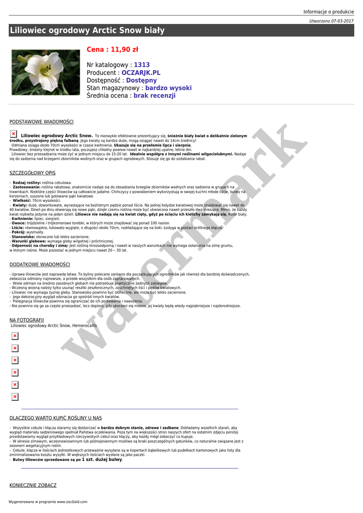 Informacje o produkcie Utworzono 07-03-2017 Liliowiec ogrodowy Arctic Snow biały Cena : 11,90 zł Nr katalogowy : 1313 Producent : OCZARJK.PL Dostępność : Dostępny Stan magazynowy : bardzo wysoki Średnia ocena : brak recenzji PODSTAWOWE WIADOMOŚCI SZCZEGÓŁOWY OPIS er m ar k Liliowiec ogrodowy Arctic Snow. To niezwykle efektownie prezentujący się, śnieżnie biały kwiat o delikatnie zielonym środku, przystrojony piękną falbaną. Jego kwiaty są bardzo duże, mogą osiągać nawet do 14cm średnicy! Odmiana osiąga około 70cm wysokości w czasie kwitnienia. Ukazuje się na przełomie lipca i sierpnia. Prawdziwy, śnieżny klejnot w środku lata, poczujesz chłodny powiew nawet w najbardziej upalne, letnie dni. Liliowiec bez przesadzania może żyć w jednym miejscu do 15-20 lat. Idealnie współgra z innymi roślinami wilgociolubnymi. Nadaje się do sadzenia nad brzegami zbiorników wodnych oraz w grupach ogrodowych. Stosuje się go do ozdabiania rabat. - Rodzaj rośliny: roślina cebulowa. - Zastosowanie: roślina rabatowa, znakomicie nadaje się do obsadzania brzegów zbiorników wodnych oraz sadzenia w grupach na trawnikach. Niektóre części liliowców są całkowicie jadalne. Chińczycy z powodzeniem wykorzystują w swojej kuchni młode liście, bulwy na korzeniach, suszone lub gotowane pąki kwiatowe. - Wielkość: 70cm wysokości. - Kwiaty: duże, dzwonkowate, wyrastające na bezlistnym pędzie ponad liście. Na jednej łodydze kwiatowej może znajdować się nawet do 40 kwiatów. Dzień po dniu otwierają się nowe pąki, dzięki czemu roślina może być ukwiecona nawet przeszło dwa miesiące. Mimo, że każdy kwiat rozkwita jedynie na jeden dzień. Liliowce nie nadają się na kwiat cięty, gdyż po ścięciu ich kielichy zamykają się. Kolor biały. - Kwitnienie: lipiec, sierpień. - Owoce: trójdzielne i trójkomorowe torebki, w których może znajdować się ponad 100 nasion. - Liście: równowąskie, łukowato wygięte, o długości około 70cm, rozkładające się na boki. Łodyga w postaci krótkiego kłącza. - Pokrój: wysmukły. - Stanowisko: słoneczne lub lekko zacienione. - Warunki glebowe: wymaga gleby wilgotnej i próchnicznej. - Odporność na choroby i zimę: Jest rośliną mrozoodporną i nawet w naszych warunkach nie wymaga osłaniania na zimę gruntu, w którym rośnie. Może pozostać w jednym miejscu nawet 20 – 30 lat. DODATKOWE WIADOMOŚCI NA FOTOGRAFII at - Uprawa liliowców jest naprawdę łatwa. To byliny polecane zarówno dla początkujących ogrodników jak również dla bardziej doświadczonych, zwłaszcza odmiany najnowsze, a przede wszystkim dla osób zapracowanych. - Wiele odmian na średnio zasobnych glebach nie potrzebuje praktycznie żadnych zabiegów. - Wczesną wiosną należy tylko usunąć resztki zeszłorocznych, zaschniętych liści i pędów kwiatowych. - Liliowiec nie wymaga żyznej gleby. Stanowisko powinno być słoneczne, ale może być lekko zacienione. - Jego dekoracyjny wygląd odznacza go spośród innych kwiatów. - Pielęgnacja liliowców powinna się ograniczać do ich podlewania i nawożenia. - Nie powinno się go za często przesadzać, lecz dopiero, gdy ukorzeni się mocno, jej kwiaty będą wtedy najpiękniejsze i najdorodniejsze. w Liliowiec ogrodowy Arctic Snow, Hemerocallis DLACZEGO WARTO KUPIĆ ROŚLINY U NAS - Wszystkie cebule i kłącza staramy się dostarczać w bardzo dobrym stanie, zdrowe i zadbane. Dokładamy wszelkich starań, aby wygląd materiału sadzeniowego spełniał Państwa oczekiwania. Poza tym na większości stron naszych ofert na ostatnim zdjęciu poniżej przedstawiamy wygląd przykładowych rzeczywistych cebul oraz kłączy, aby każdy mógł zobaczyć co kupuje. - W okresie zimowym, wczesnowiosennym lub późnojesiennym możliwe są braki poszczególnych gatunków, co naturalnie związane jest z sezonem wegetacyjnym roślin. - Cebule, kłącza w ilościach jednostkowych przeważnie wysyłane są w kopertach bąbelkowych lub pudełkach kartonowych jako listy dla zminimalizowania kosztu wysyłki. W większych ilościach wysłane są jako paczki. - Bulwy liliowców sprzedawane są po 1 szt. dużej bulwy. KONIECZNIE ZOBACZ Wygenerowano w programie www.oscGold.com er m ar k at w
